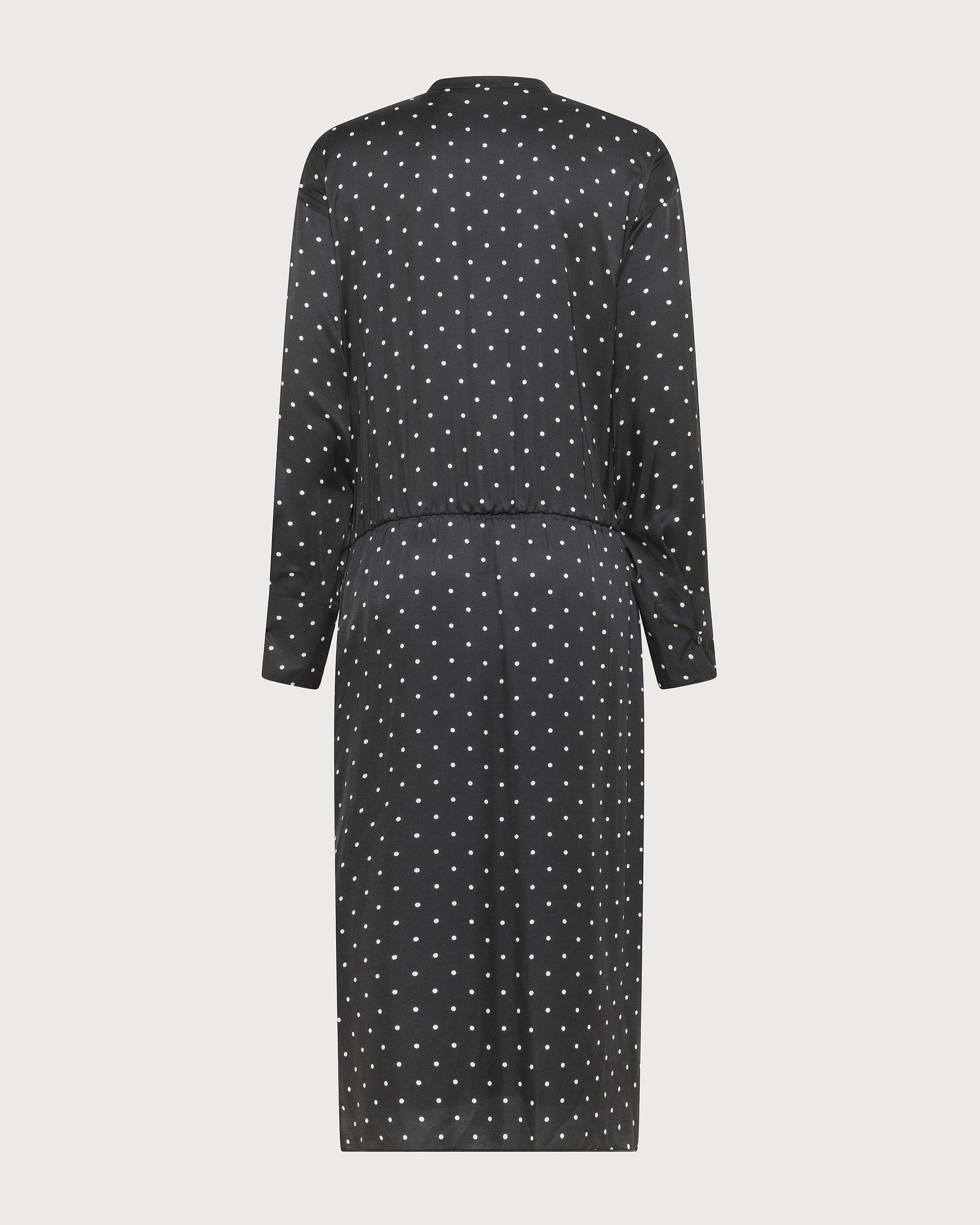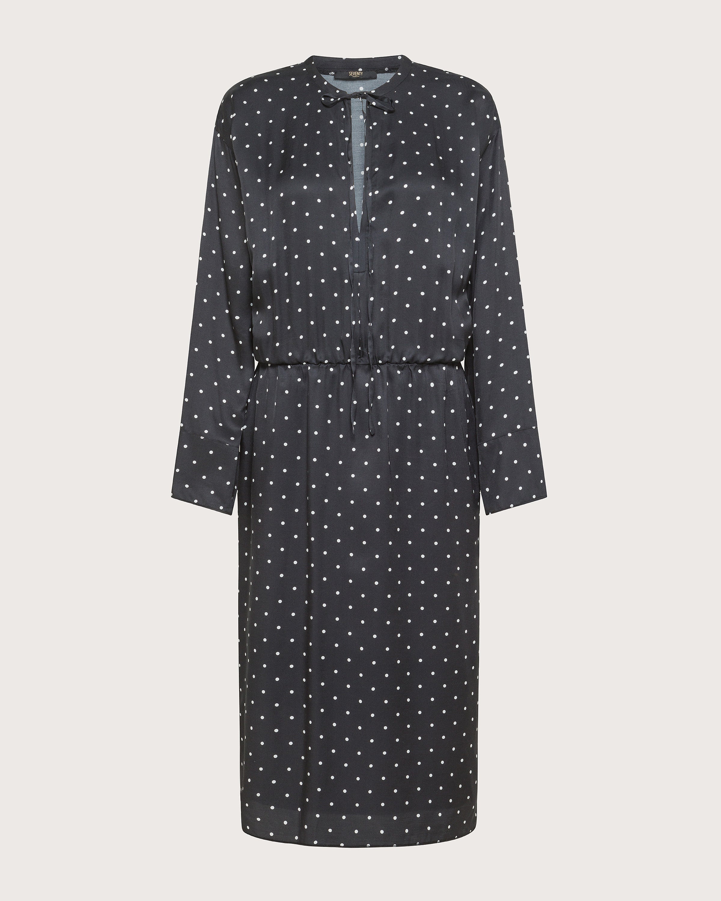 Abito lungo con scollatura a V e laccetto sul collo realizzato in twille di vicosa con stampa a pois monocolor. Arricciatura con elastico sul fianco.