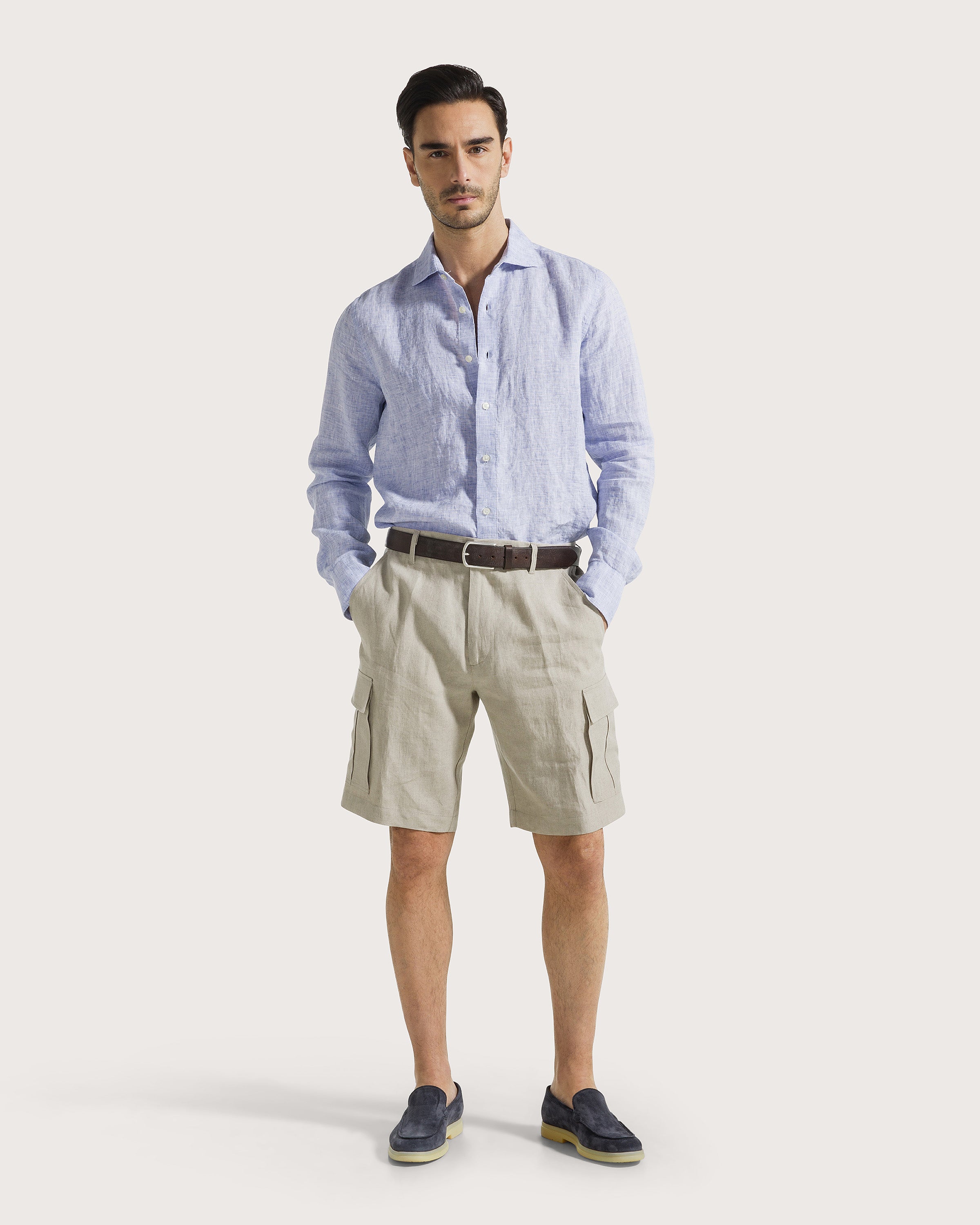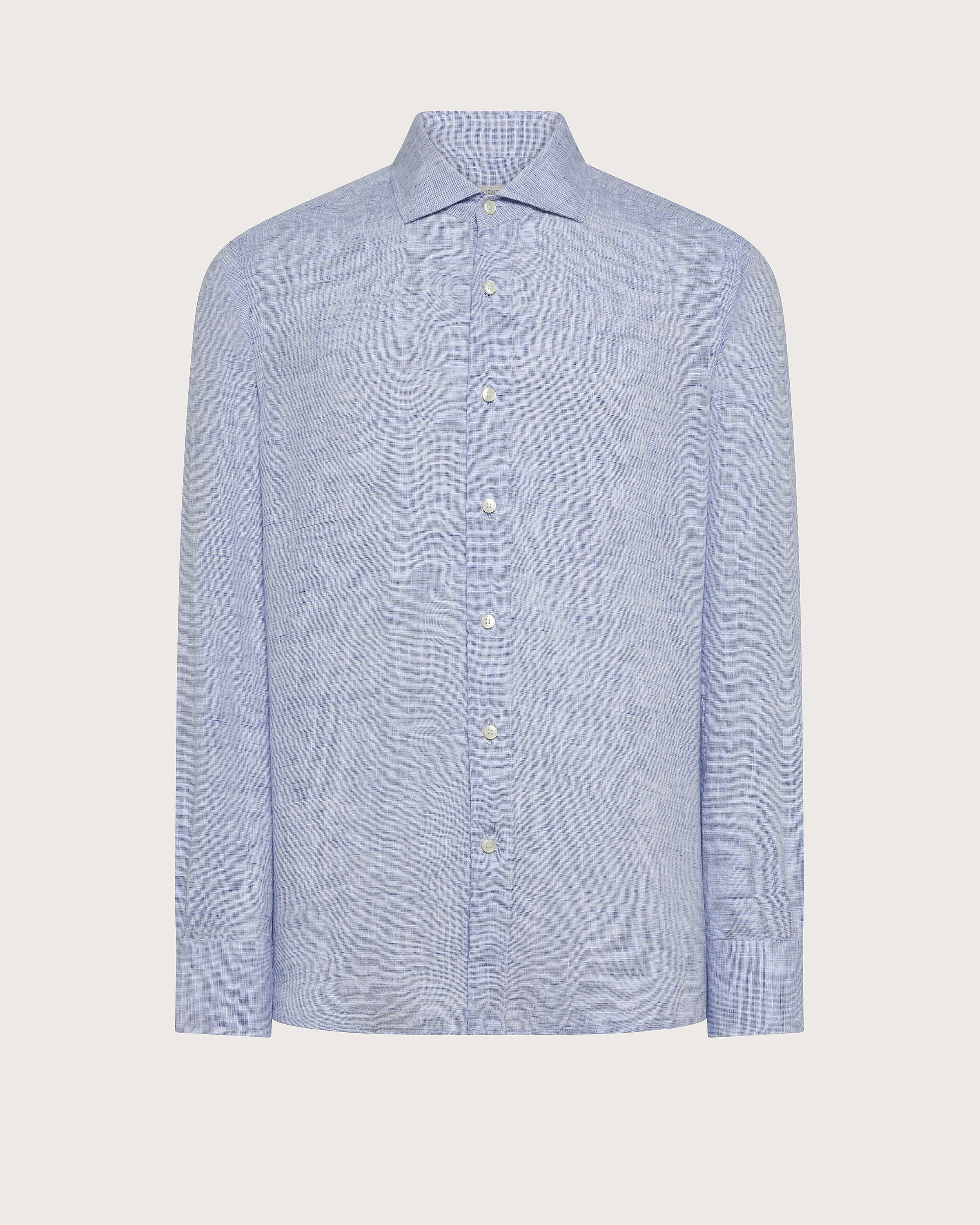 Camicia manica lunga in 100% lino tinto filo effetto melange, collo francese e chiusura centrale con bottoni.