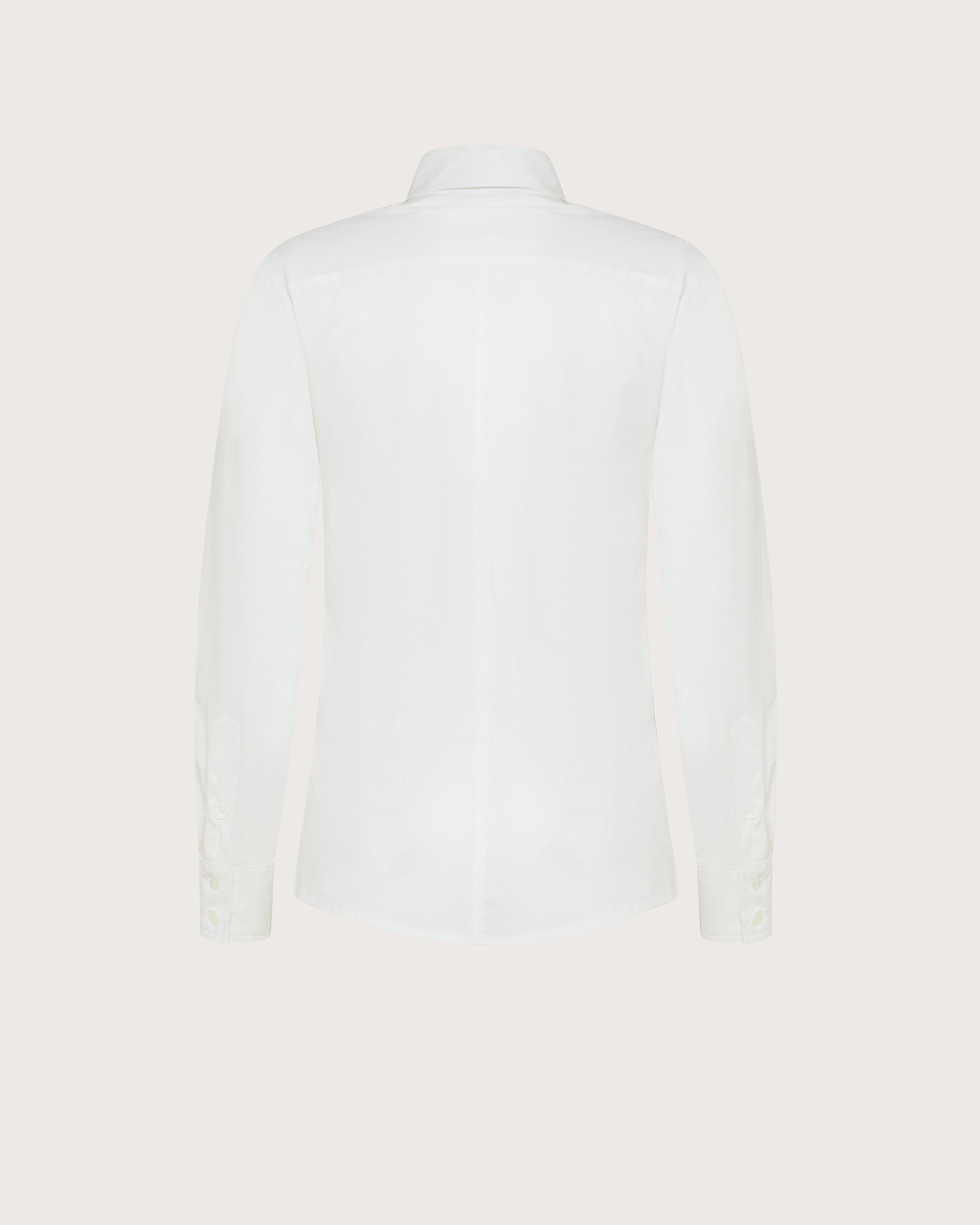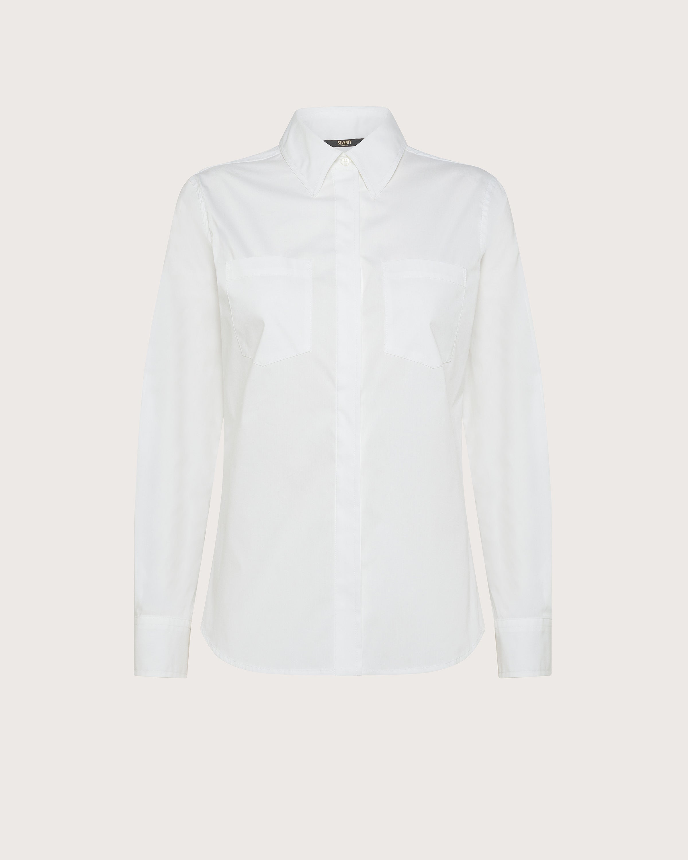 Camicia tinta unita con tasche sul petto realizzata in popeline misto cotone stretch. Colletto e abbottonatura davanti nascosta. Maniche lunghe con polsino e fondo stondato.