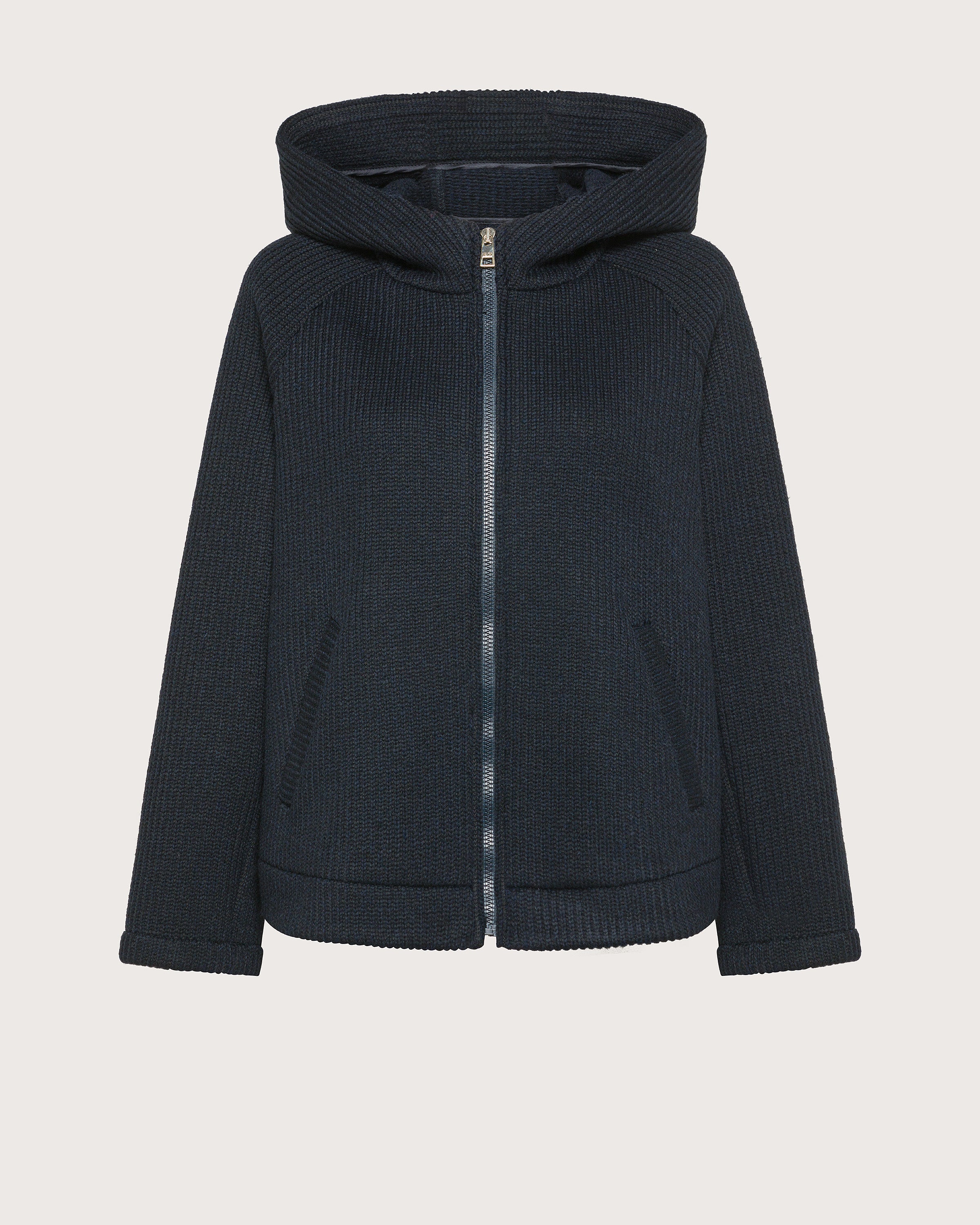 Capospalla realizzato in tessuto maglia costa inglese. Cappuccio ampio e chiusura frontale con zip. Tasche inserite sui fianchi.