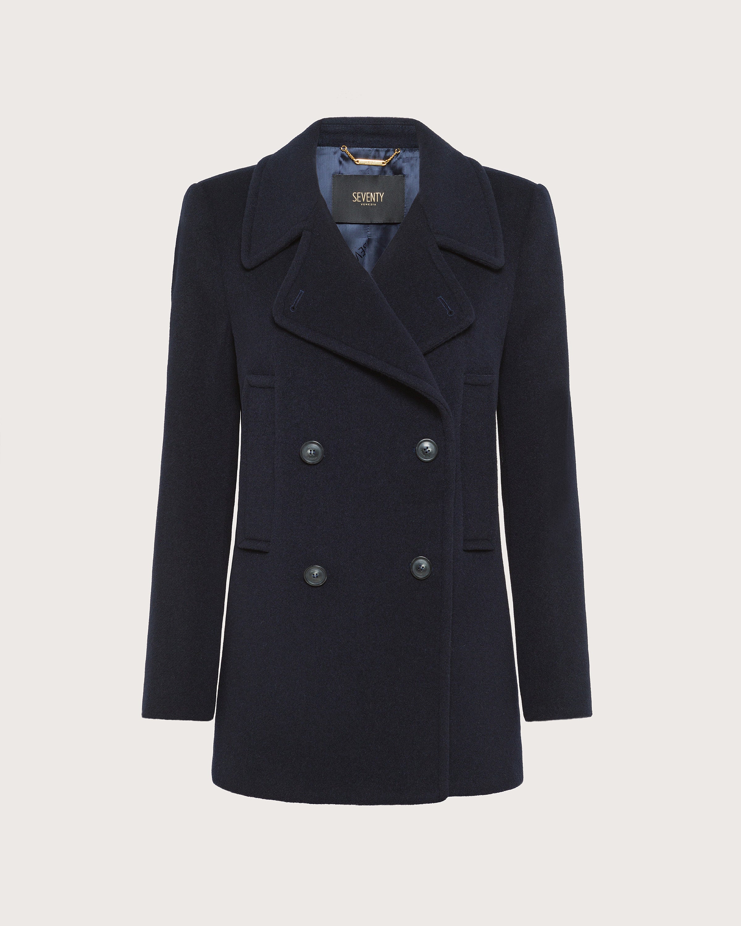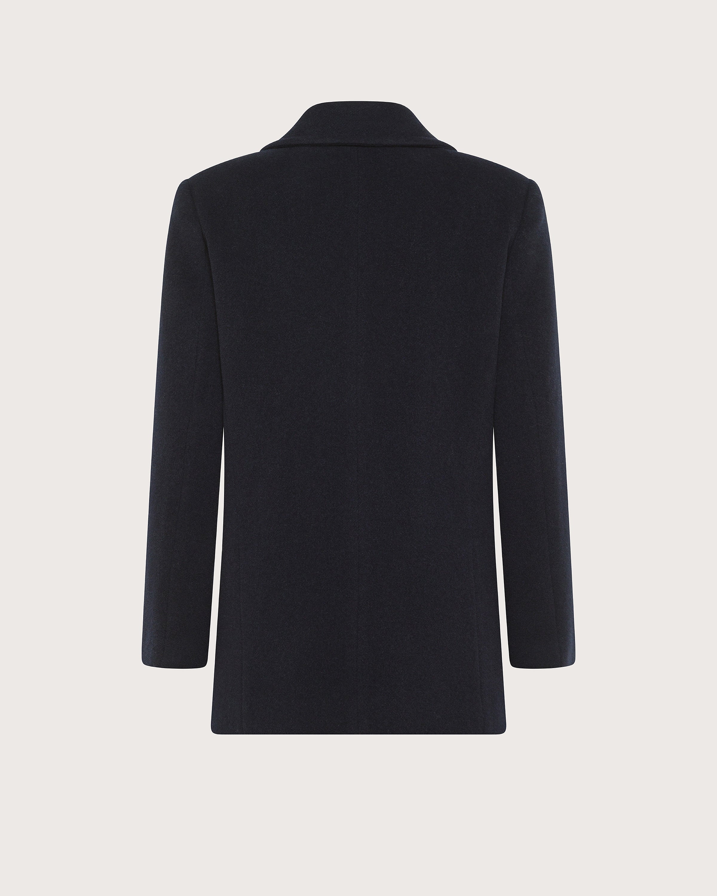 Cappotto doppiopetto corto realizzato in panno drap peso cappotto. Collo ampio e maxi tasche inserite ai lati orizzontalmente.