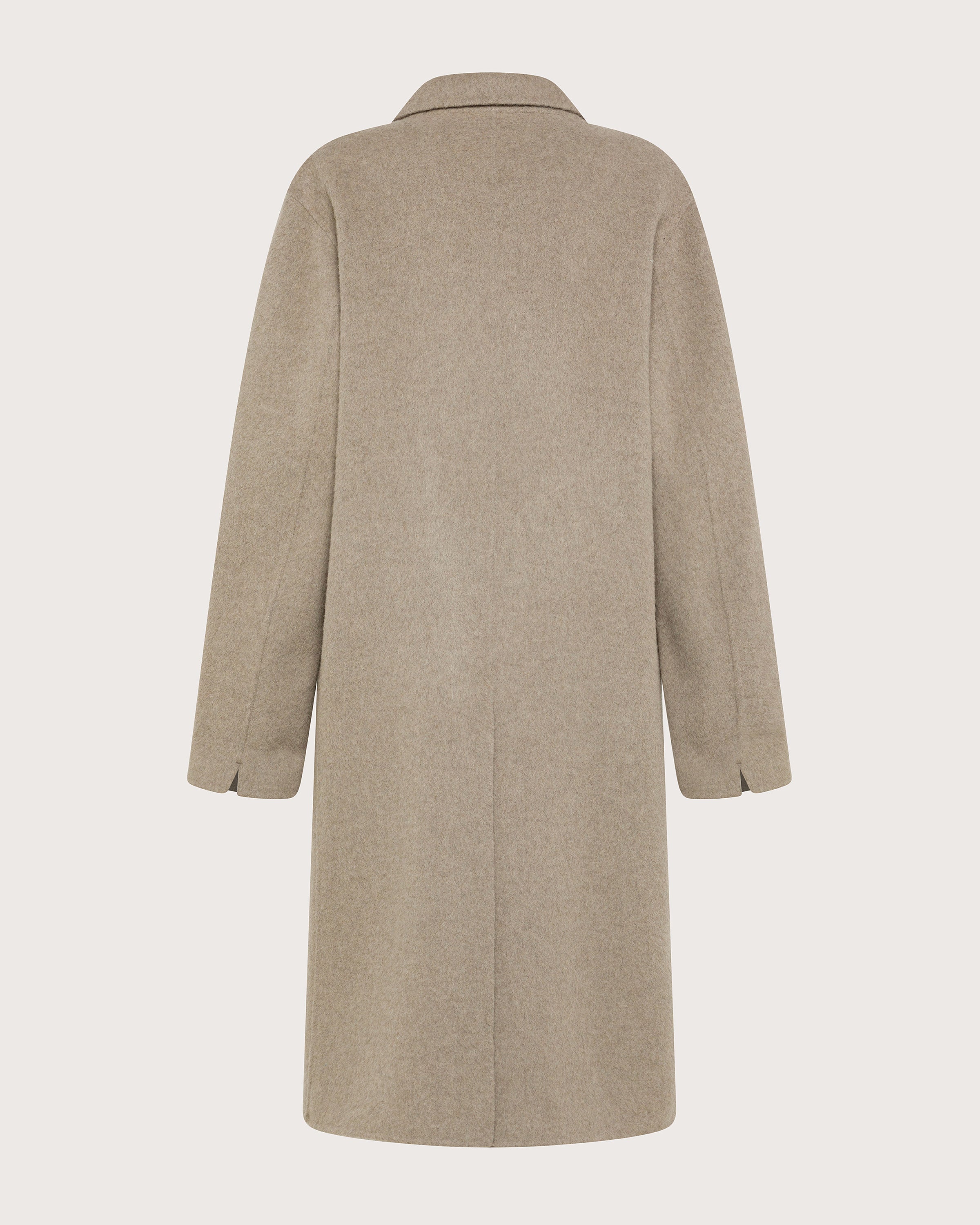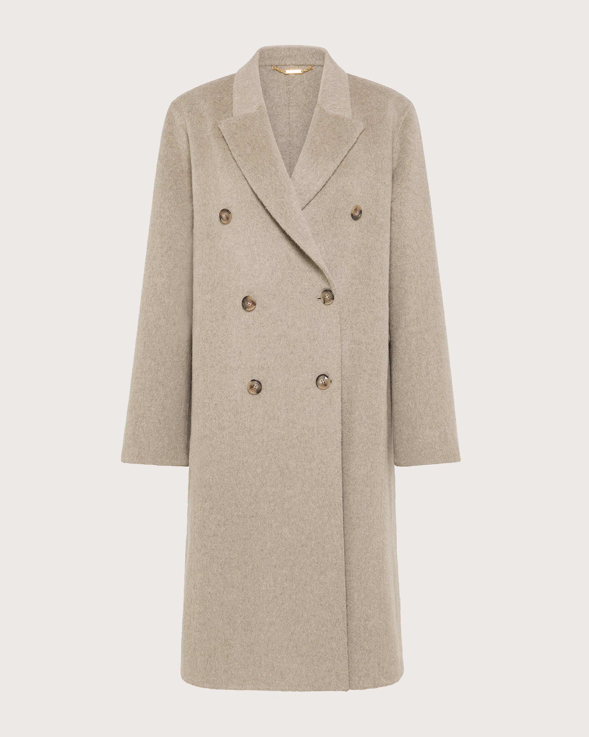 Cappotto doppiopetto realizzato in double melange handmade lungo. Rever a lancia, tasche inserite sui fianchi e spacchetti sui polsi.