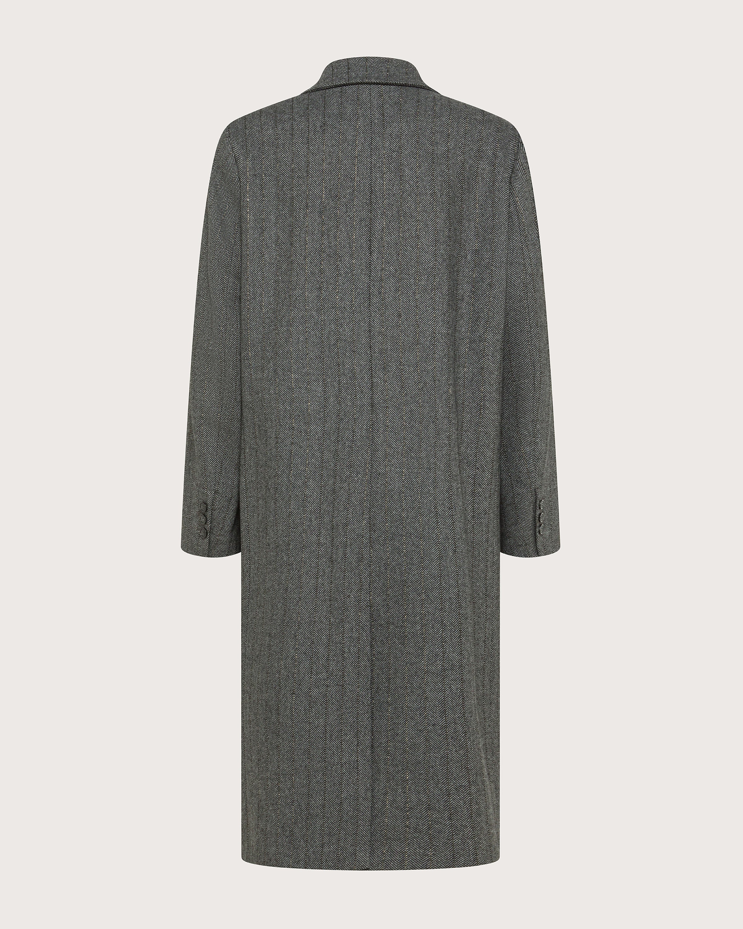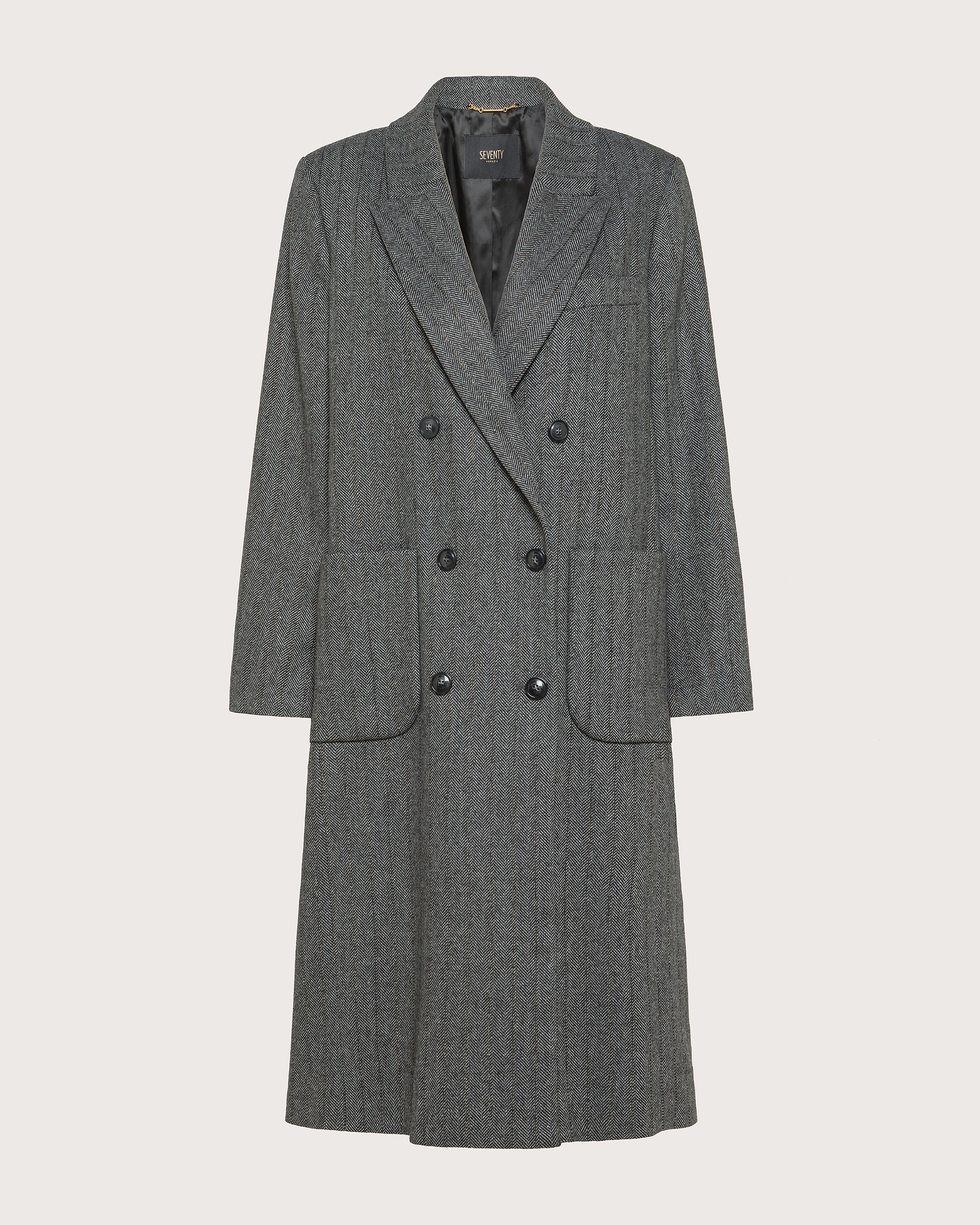 Cappotto doppiopetto realizzato in resca misto lana gessata lurex. Chiusura doppiopetto con bottoni. Collo a lancia, tasche con patta e filetto sul petto.