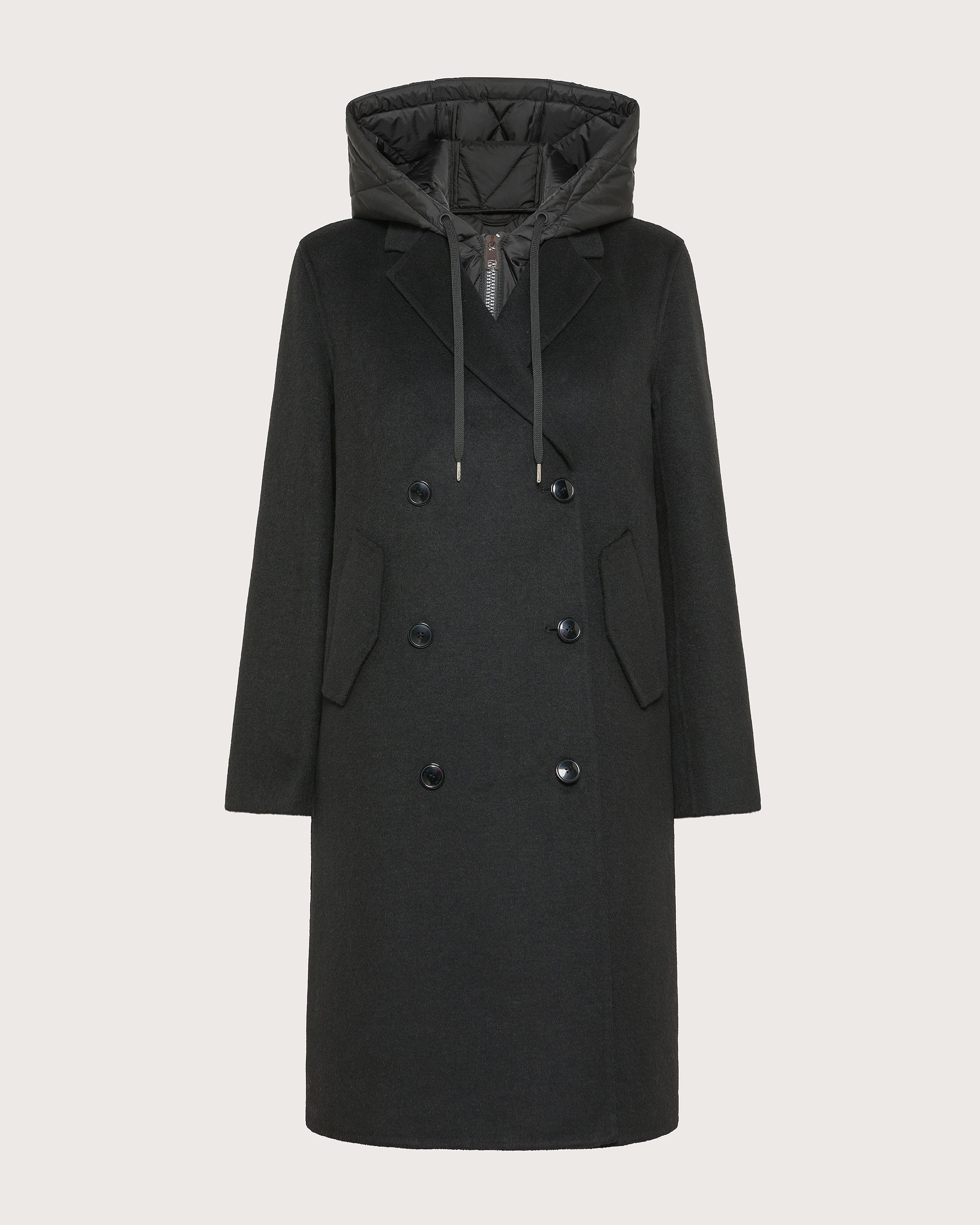 Cappotto doppiopetto realizzato in panno double con gilet staccabile in ovatta. Rever classico, abbottonatur davanti e tasche inserite sui fianchi.