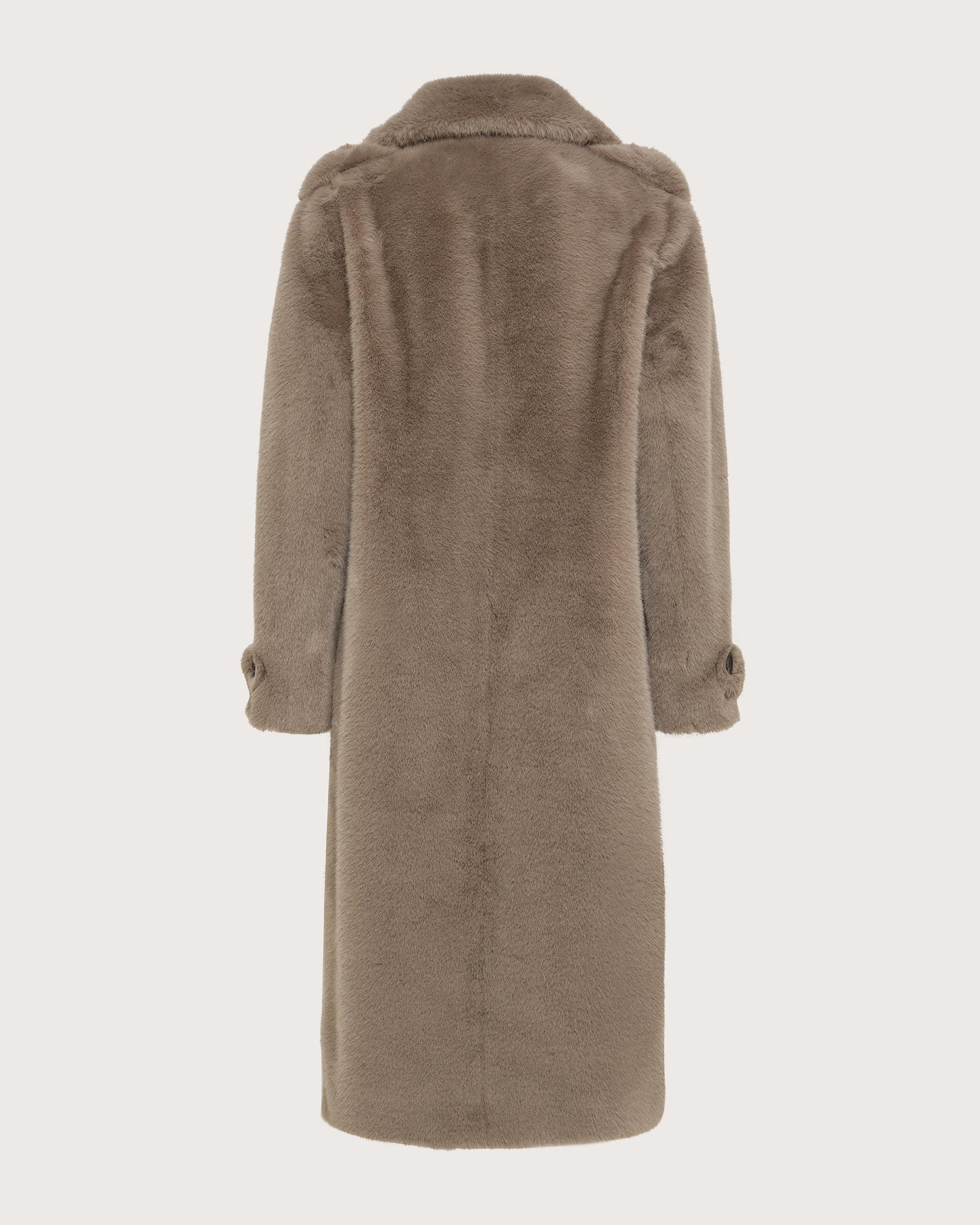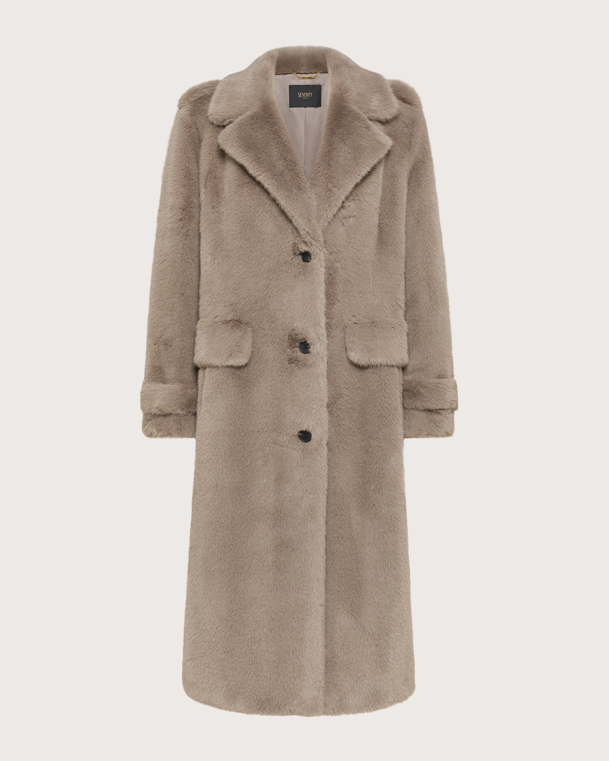 Cappotto realizzato in ecopelliccia con ampio rever. Chiusura frontale con tre bottoni. Tasche frontali. Dettaglio su polsini e spalle.