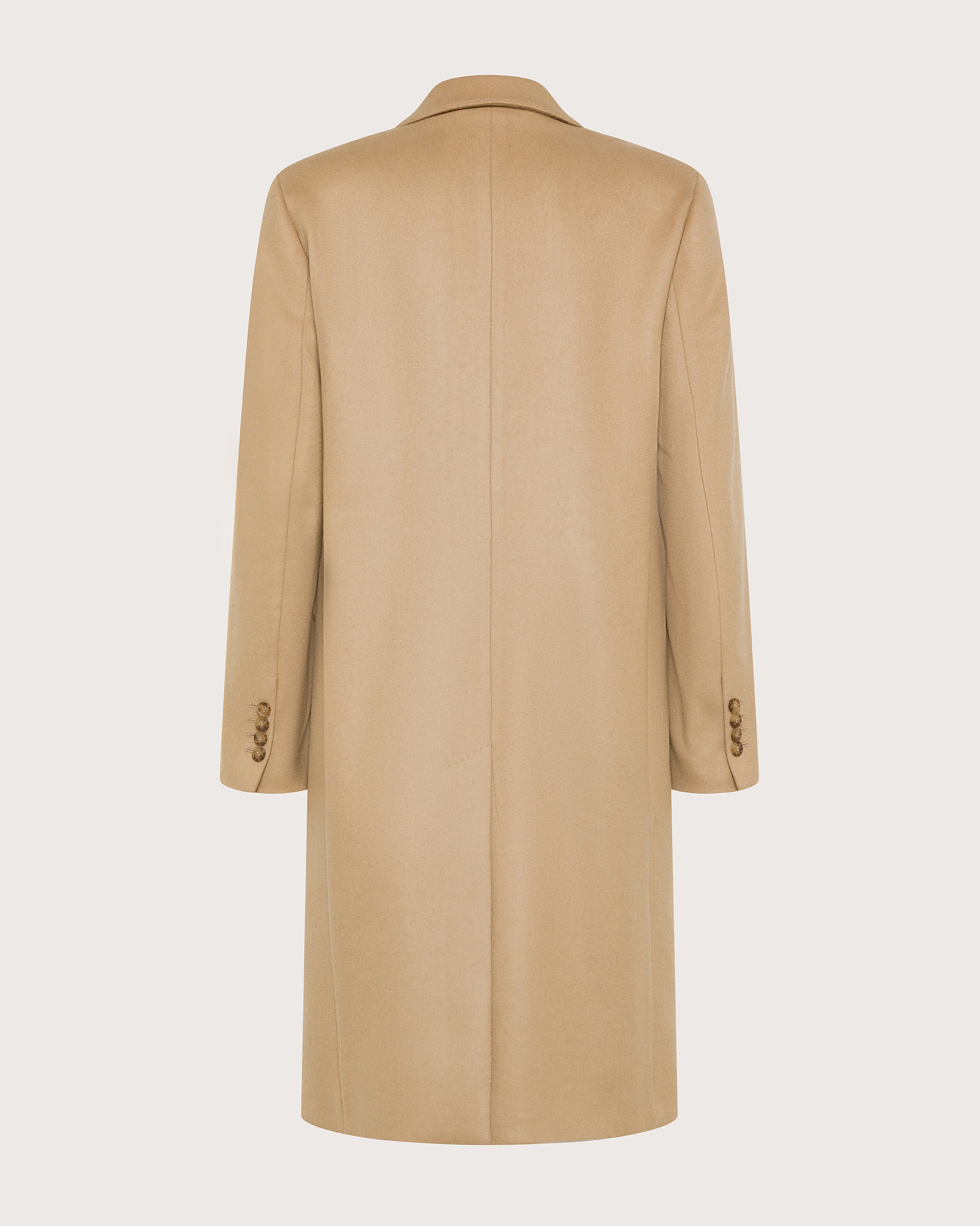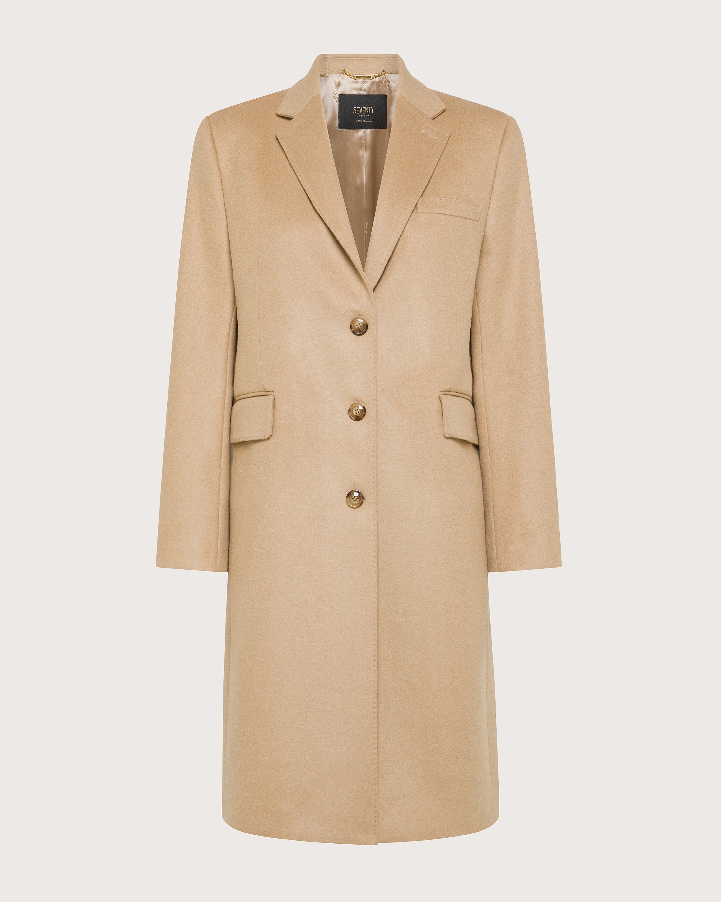 Cappotto lungo monopetto realizzato in 100% cashmere peso cappotto. Rever classico, tasche con patta e filetto sul petto. Chiusura frontale con tre bottoni.