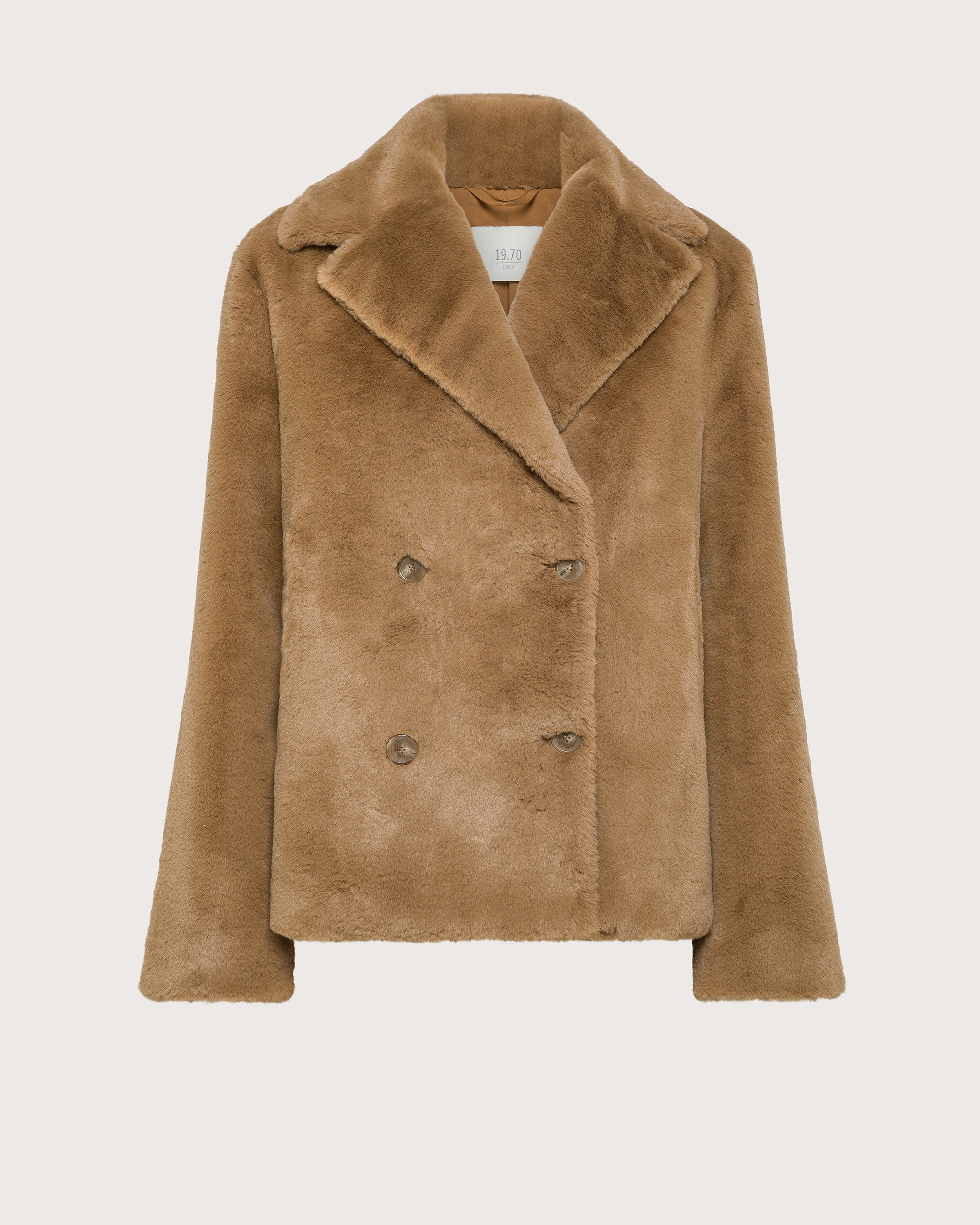 Ecopelliccia doppiopetto con maniche lunghe e collo a rever importante. Vestibilità morbida. Tasche nascoste laterali.