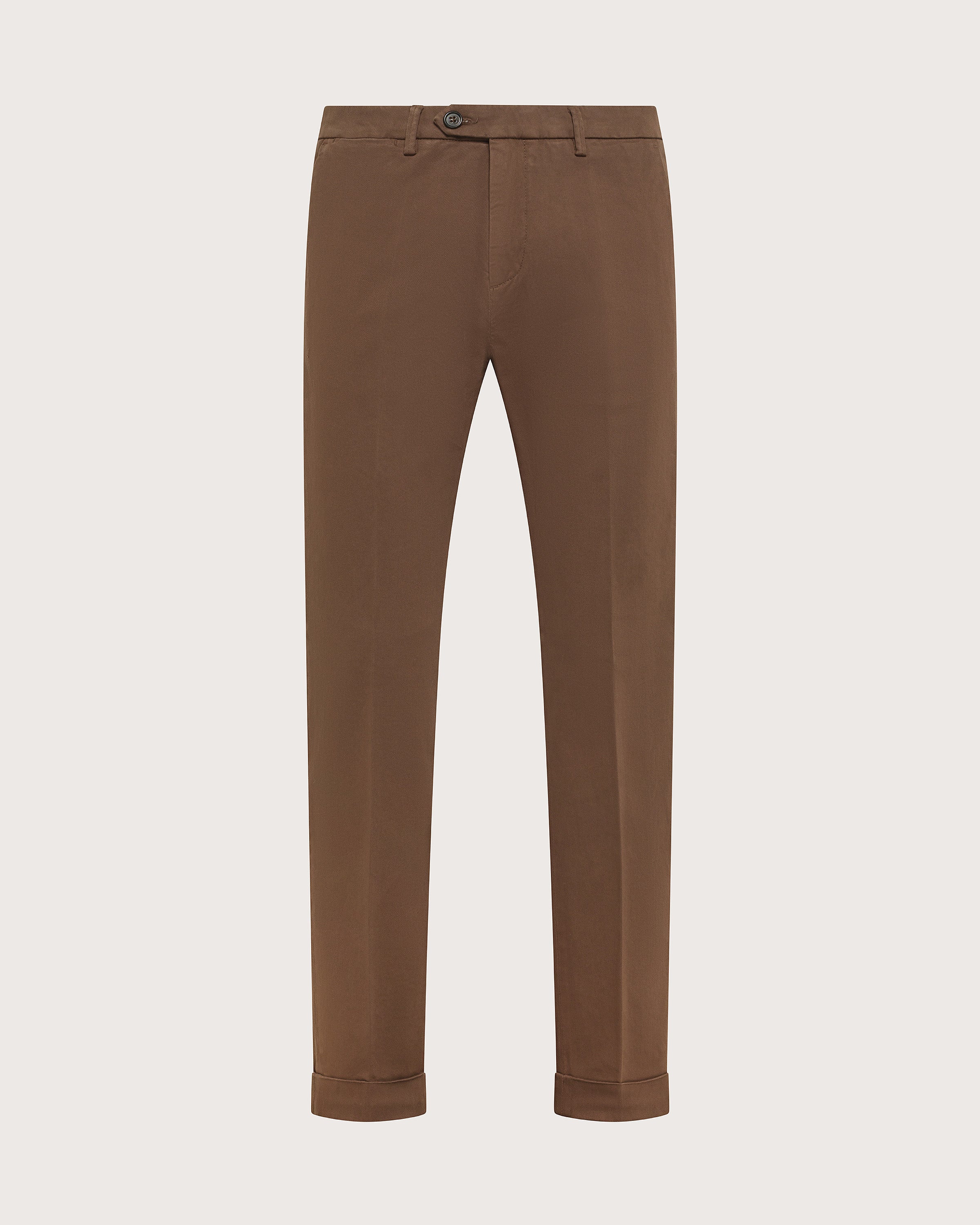 Classic chino pants made of garment-dyed brushed gabardine. Characterized by slant pockets and watch pocket in front, double welt pockets with button on back. Zipper and button fastening. Flounced hem.