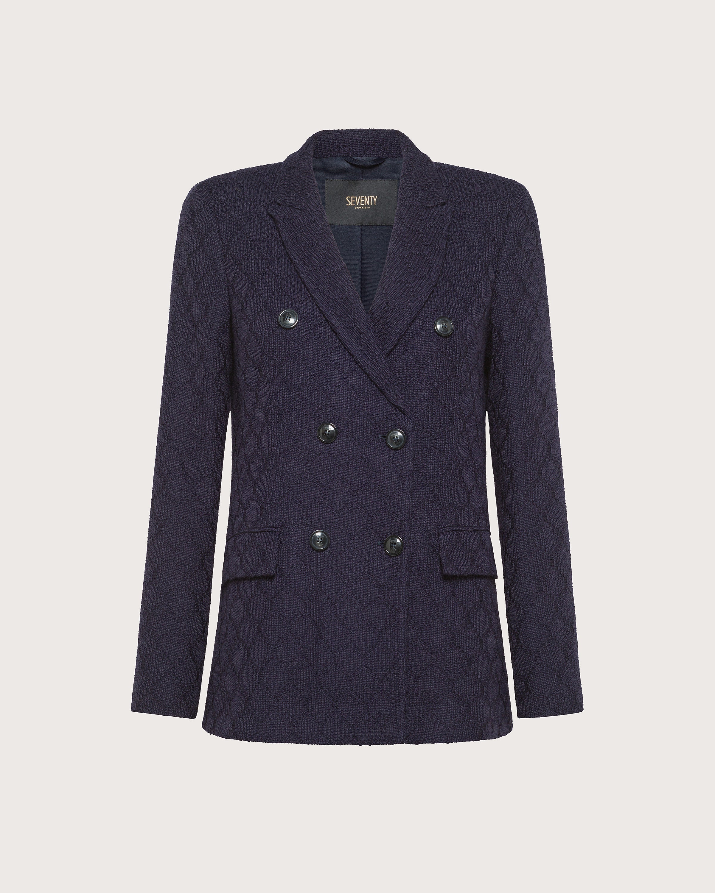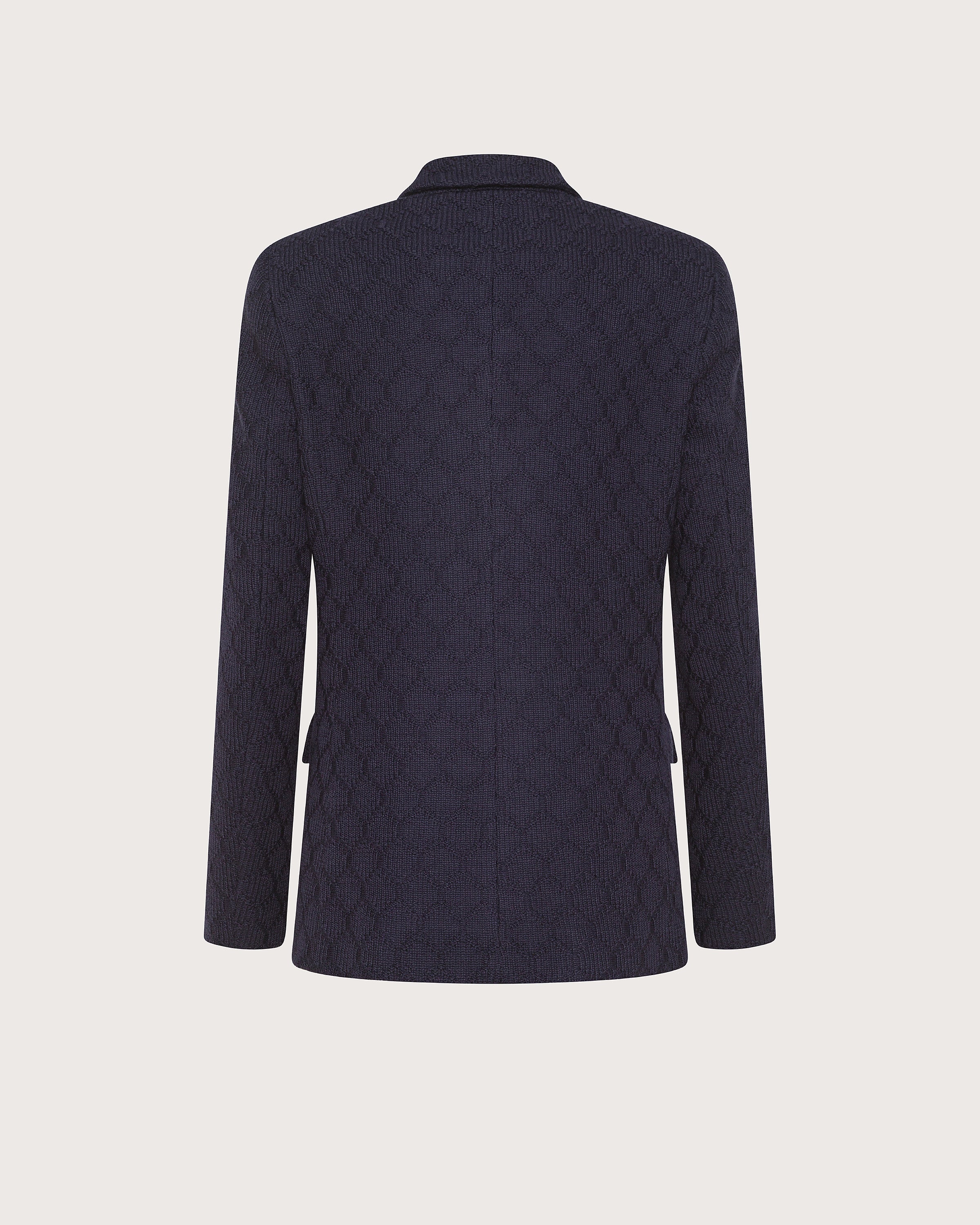 Giacca regular fit doppiopetto realizzata in maglia punto celle unita. Chiusura doppiopetto con bottoni in tinta. Collo a lancia e tasche con patta.