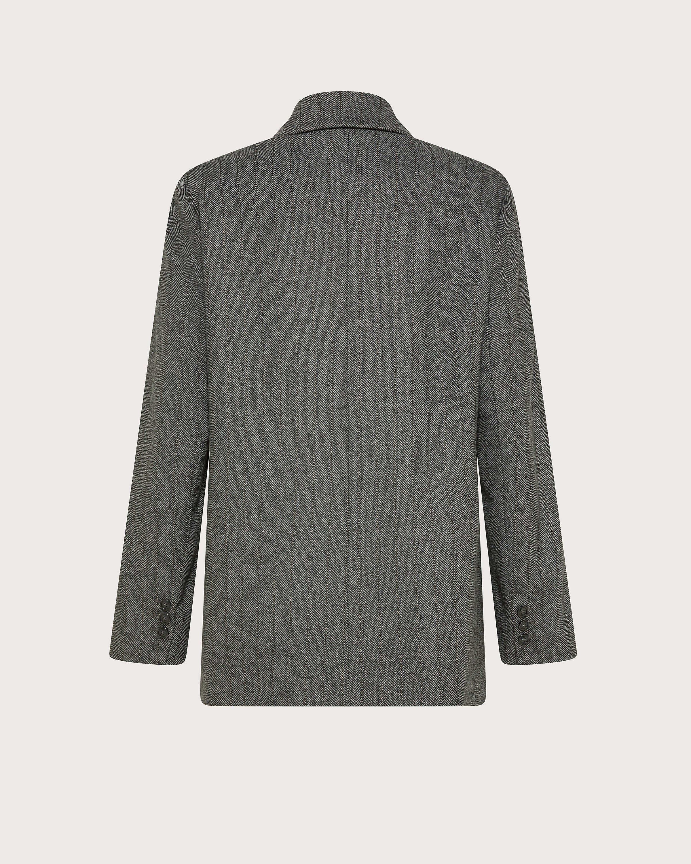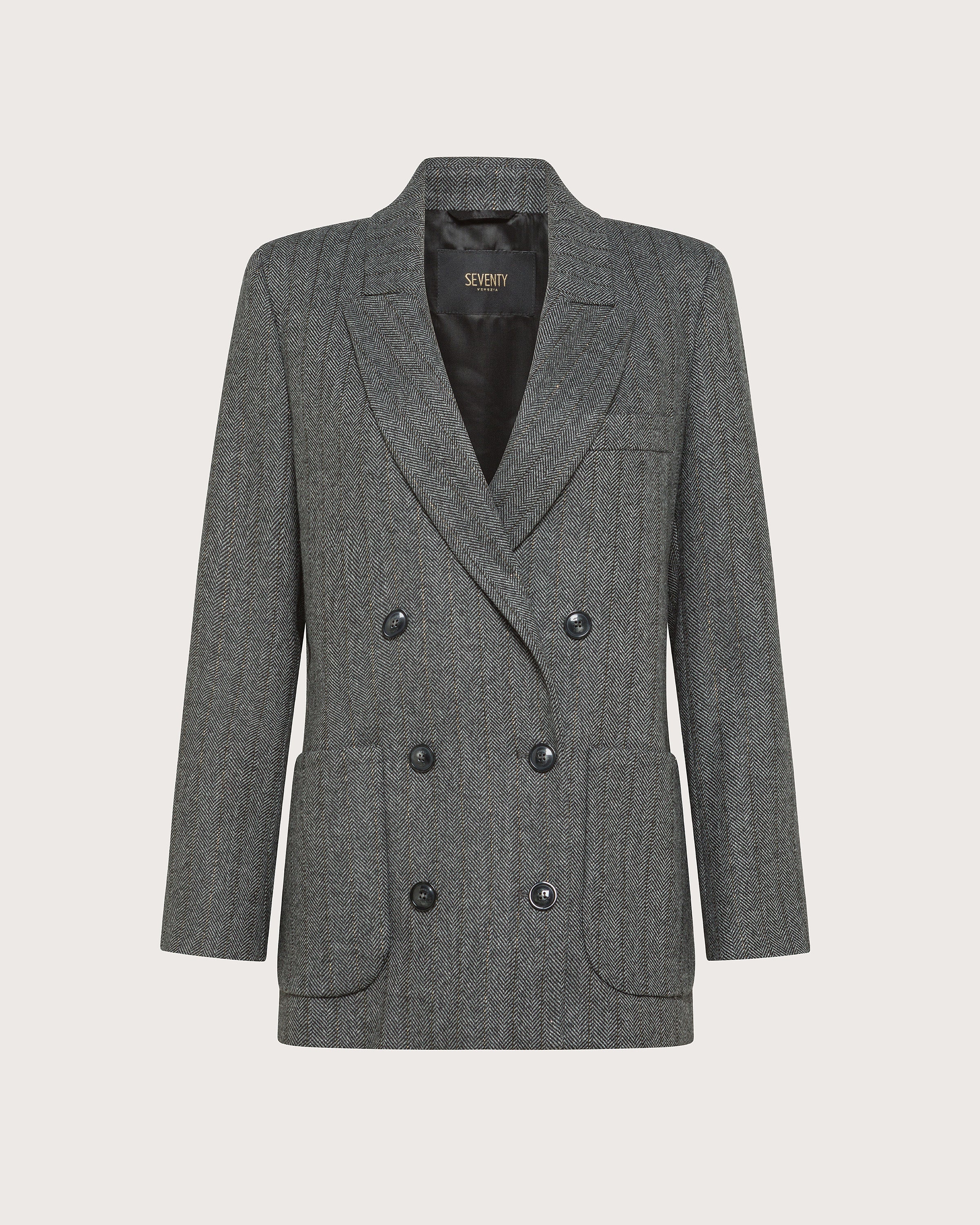 Giacca doppiopetto realizzata in resca misto lana gessata lurex. Vestibilità over. Chiusura doppiopetto con bottoni in tinta. Collo a lancia, tasche con patta e filetto sul petto. Maniche lunghe con spalline.
