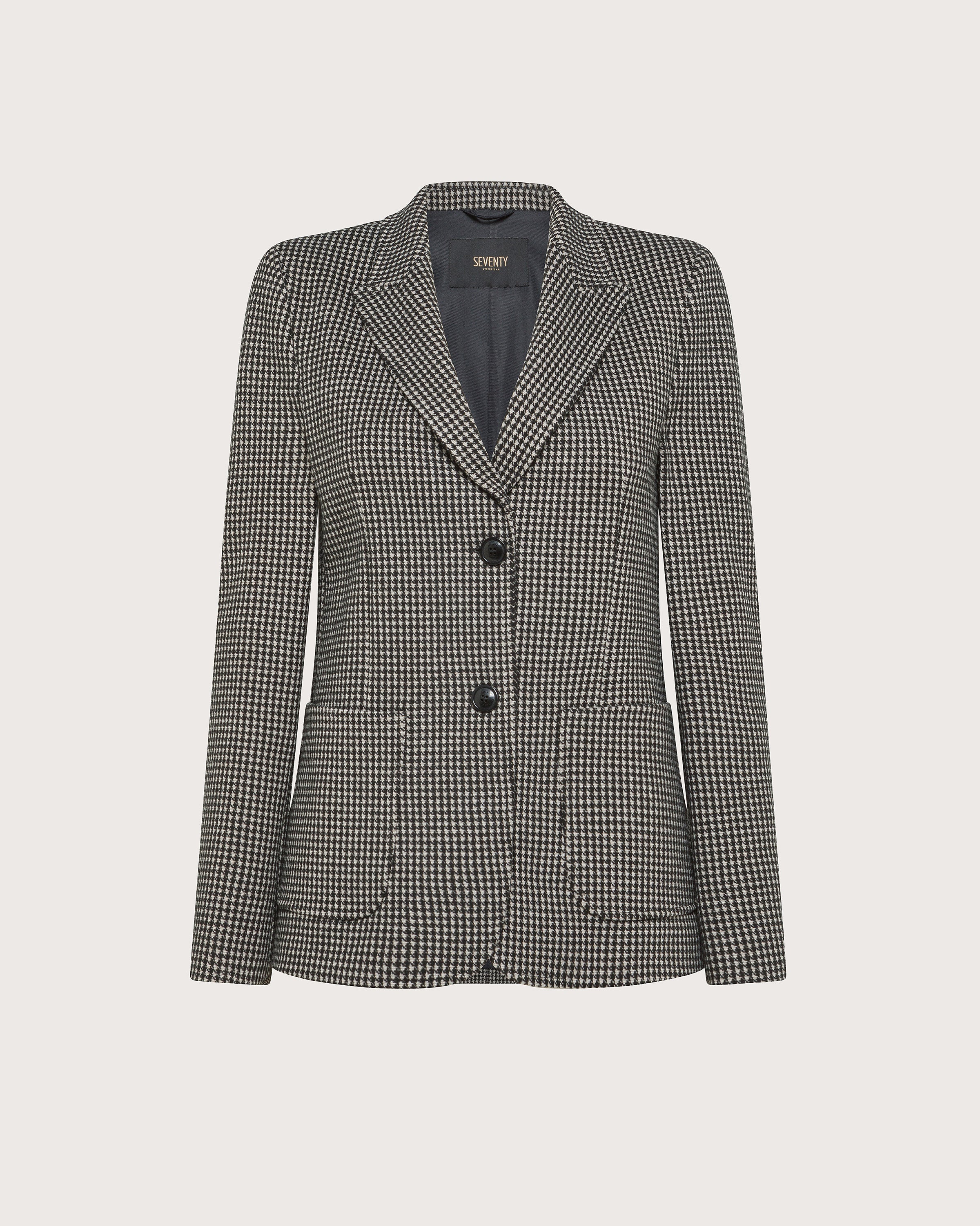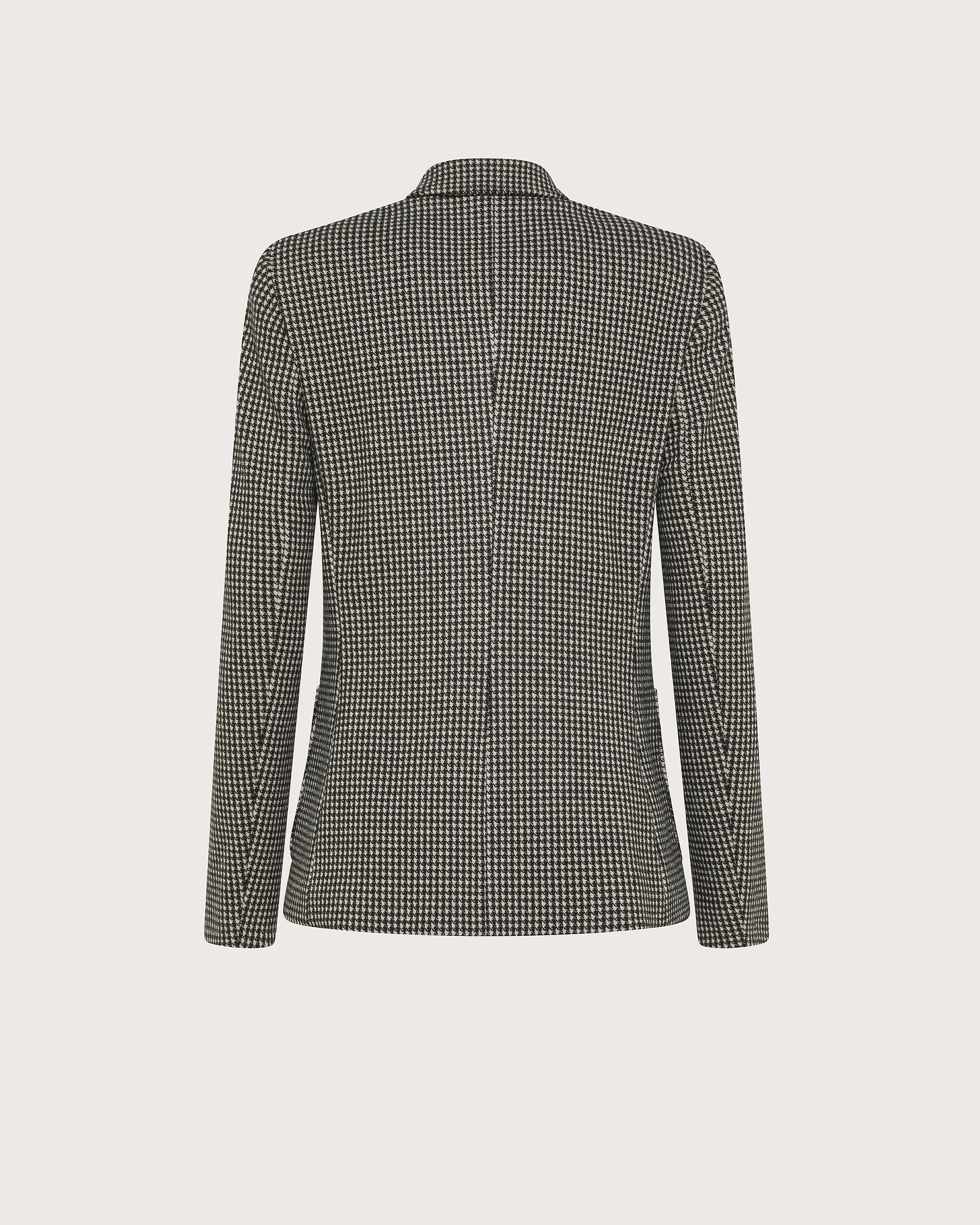 Giacca monopetto realizzata in punto milano jacquard vichy stretch. Revers classico e maniche lunghe. Chiusura con bottoni e tasche a toppa applicate.