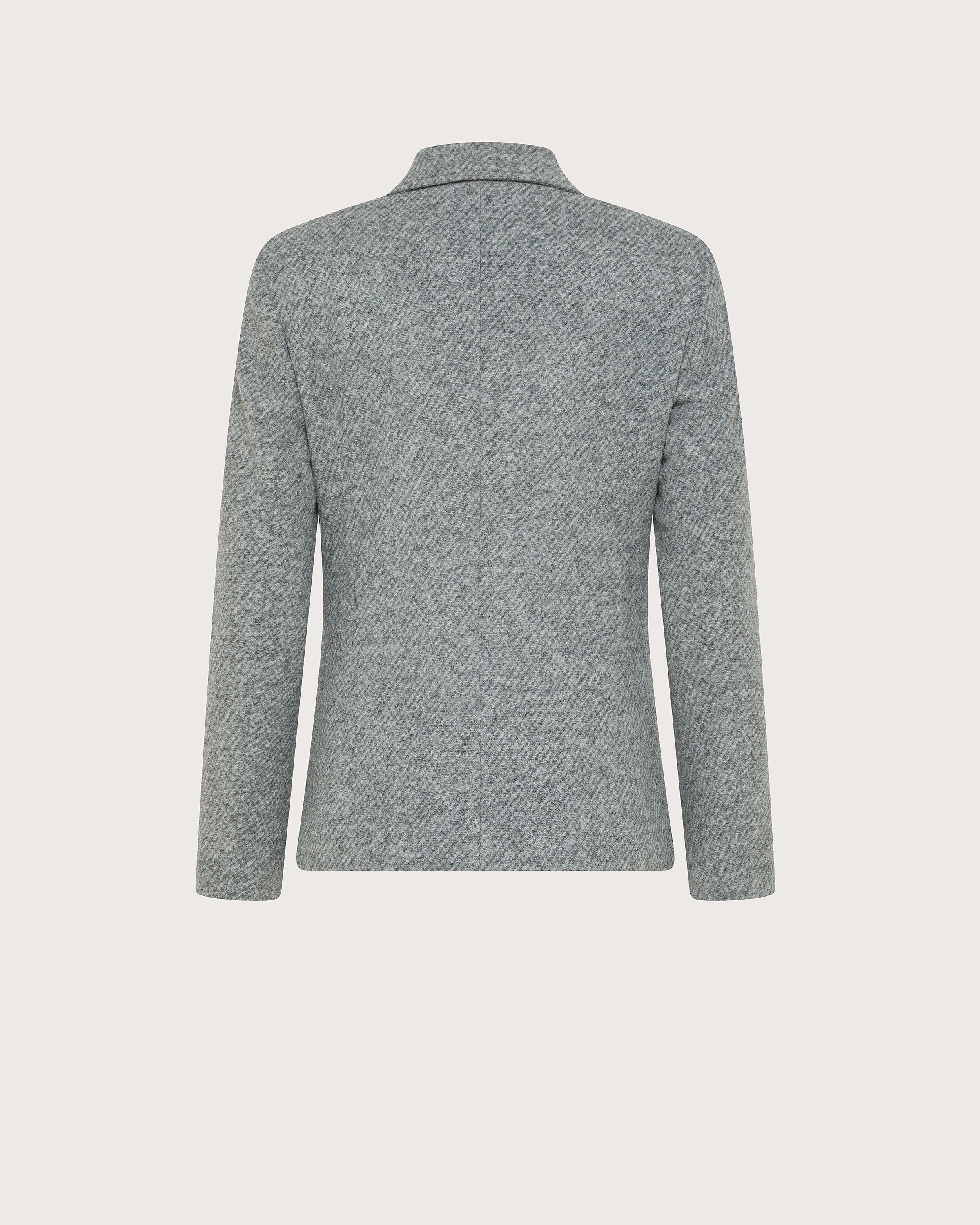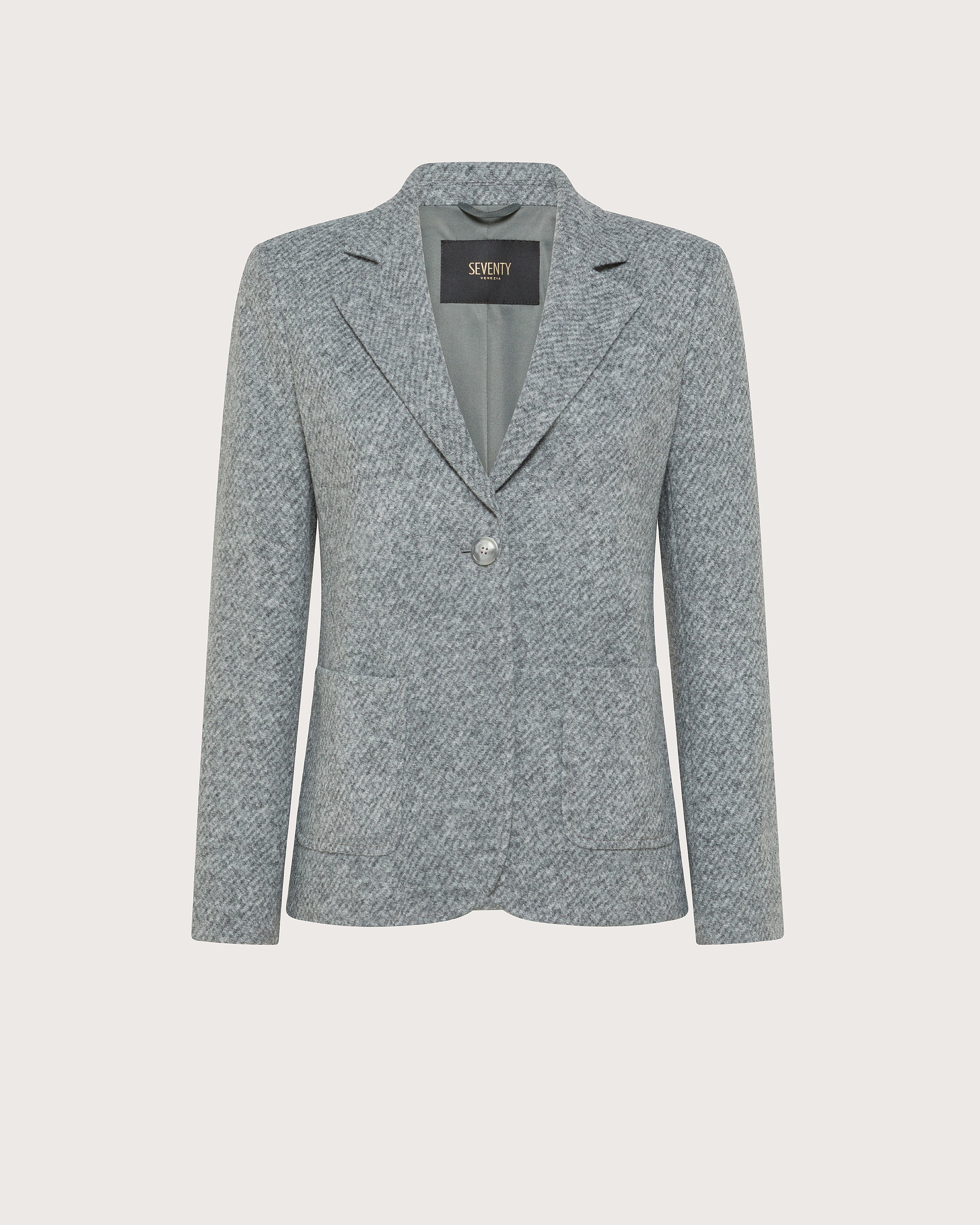 Giacca monopetto realizzata in micro disegno maglia misto lana. Revers classico e manica lunga aderente. Chiusura con bottone singolo e tasche a toppa applicate.