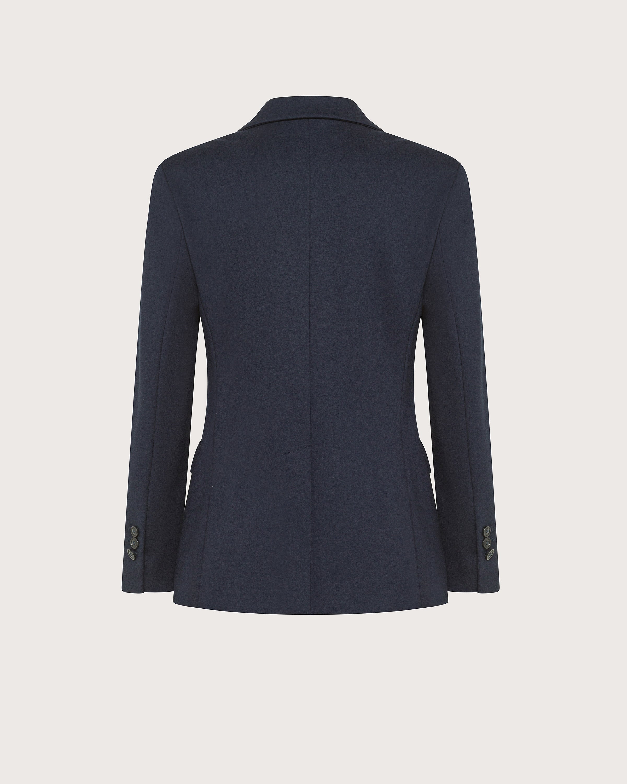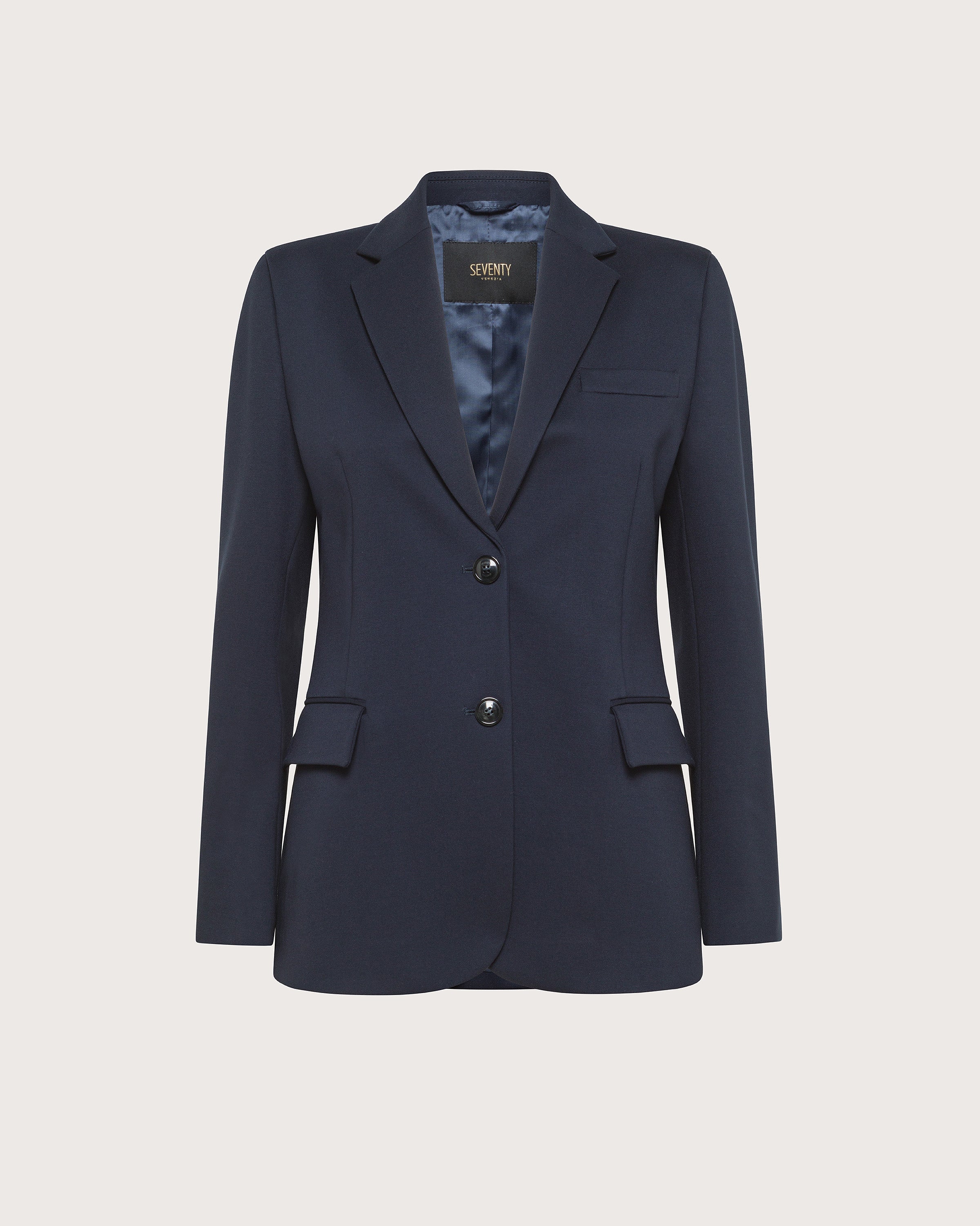 Giacca monopetto realizzata in punto stoffa compatto bielastico. Revers classico e maniche lunghe. Chiusura con bottoni e tasche con patta e filetto sul petto.