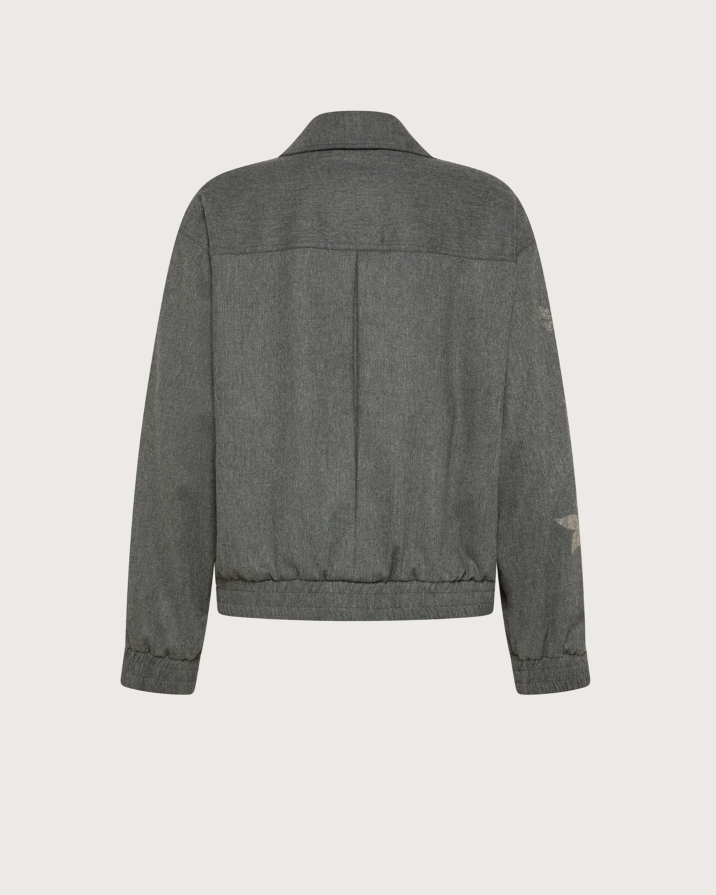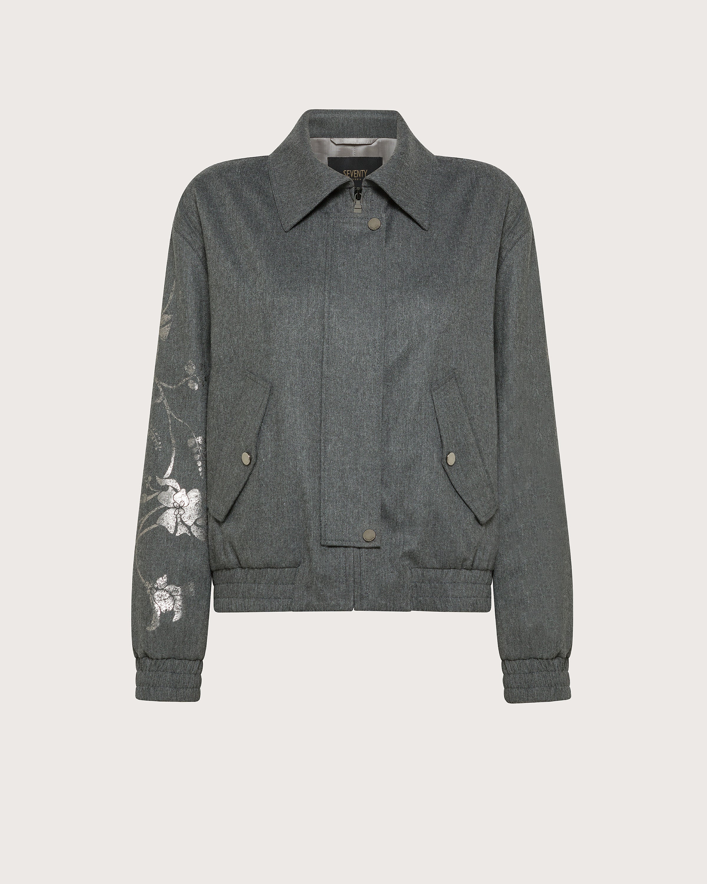 Giacchetta con zip realizzata in flanella cardata mono stretch con fantasia florele sulla manica destra. Colletto a camicia e maniche lunghe. Polsini e fondo con elastico. Doppia chiusura con zip e bottoni alle estremità. Tasche inserite in obliquo con bottone.