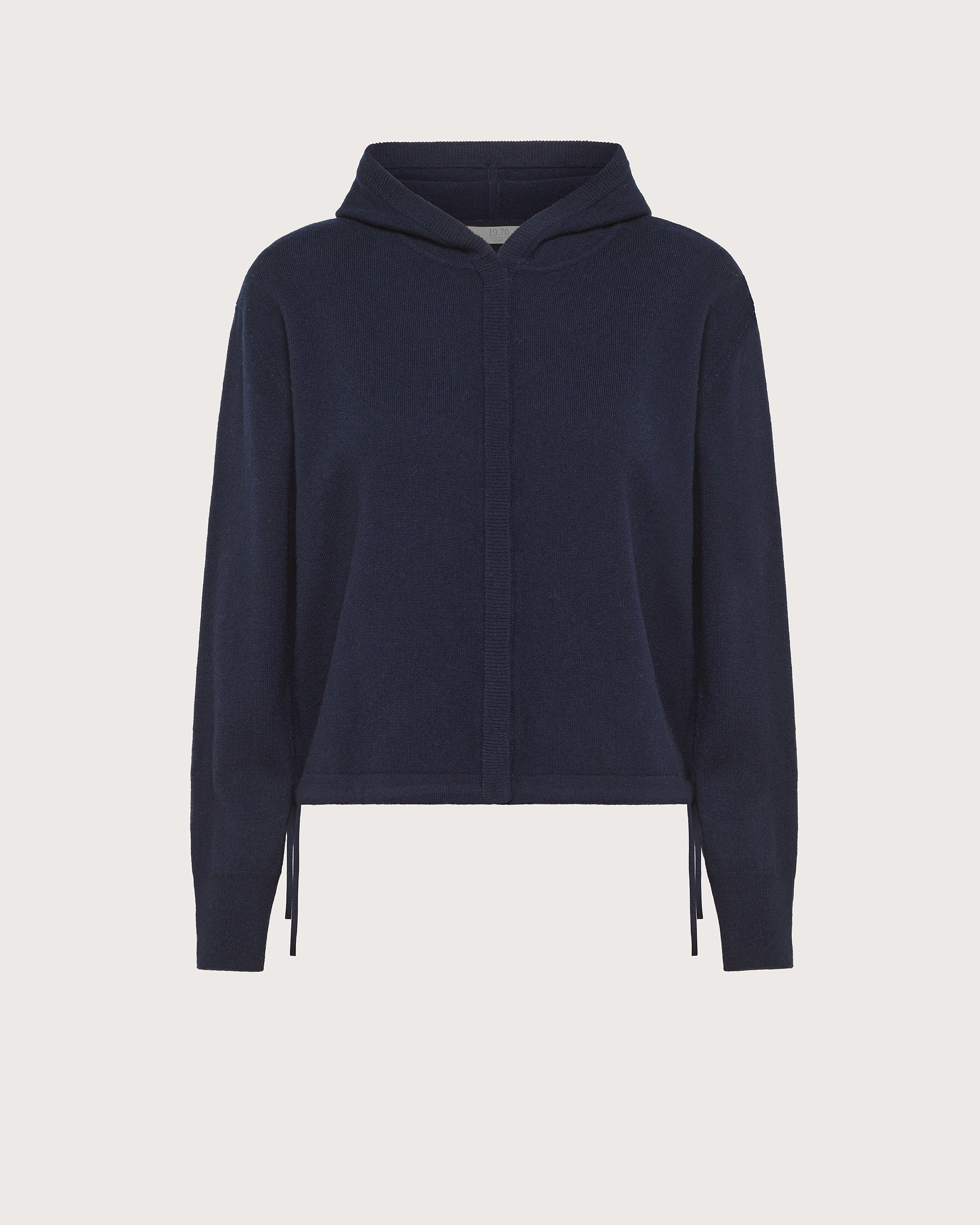 Giacchina con cappuccio realizzata in pura lana f.7/12. Chiusura frontale con abbottonatura nascosta, coulisse laterali sul fondo.