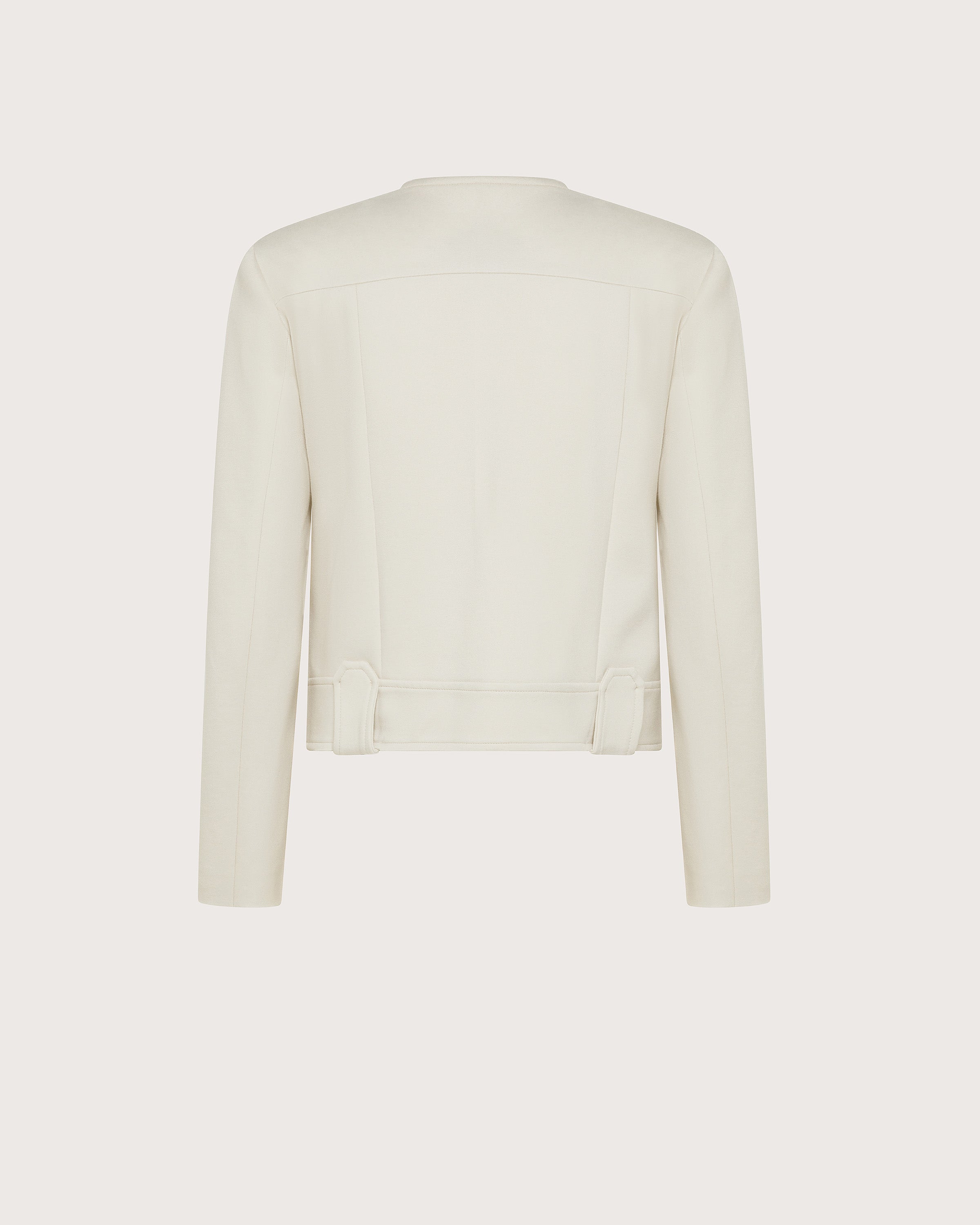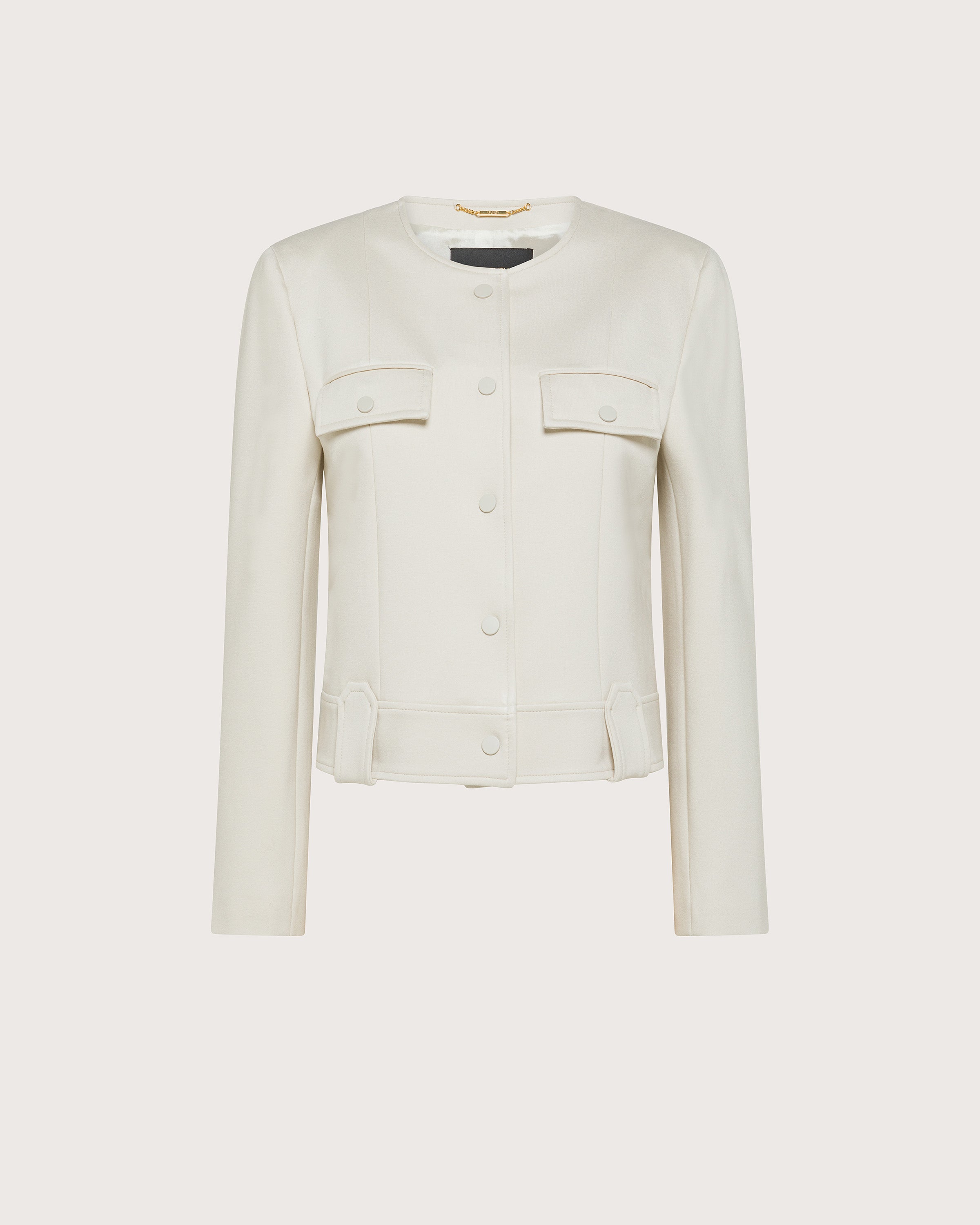 Giacchina corta girocollo realizzata in punto stoffa bielastico. Chiusura frontale con bottoni. Taschine con bottone sul petto e passanti in vita.