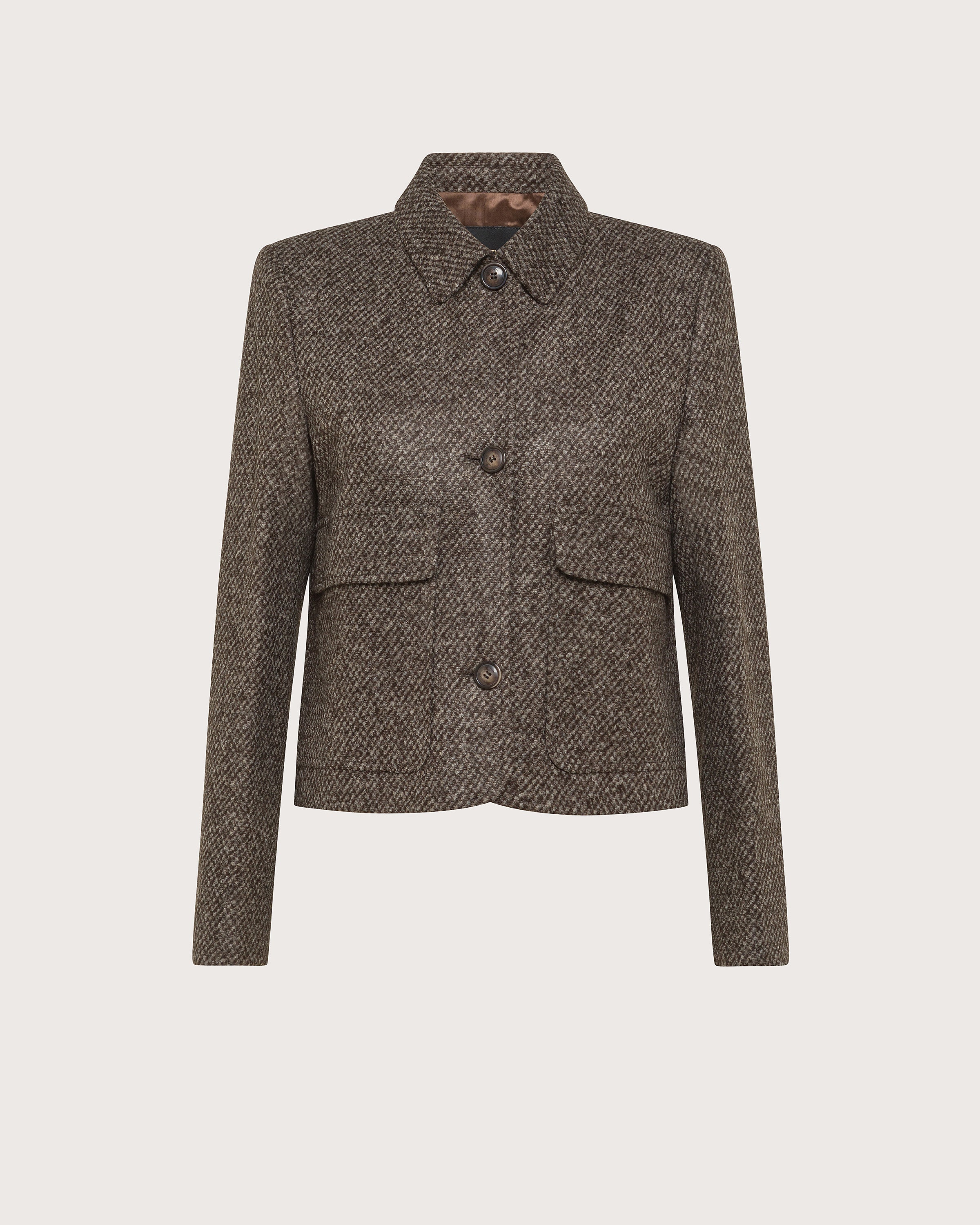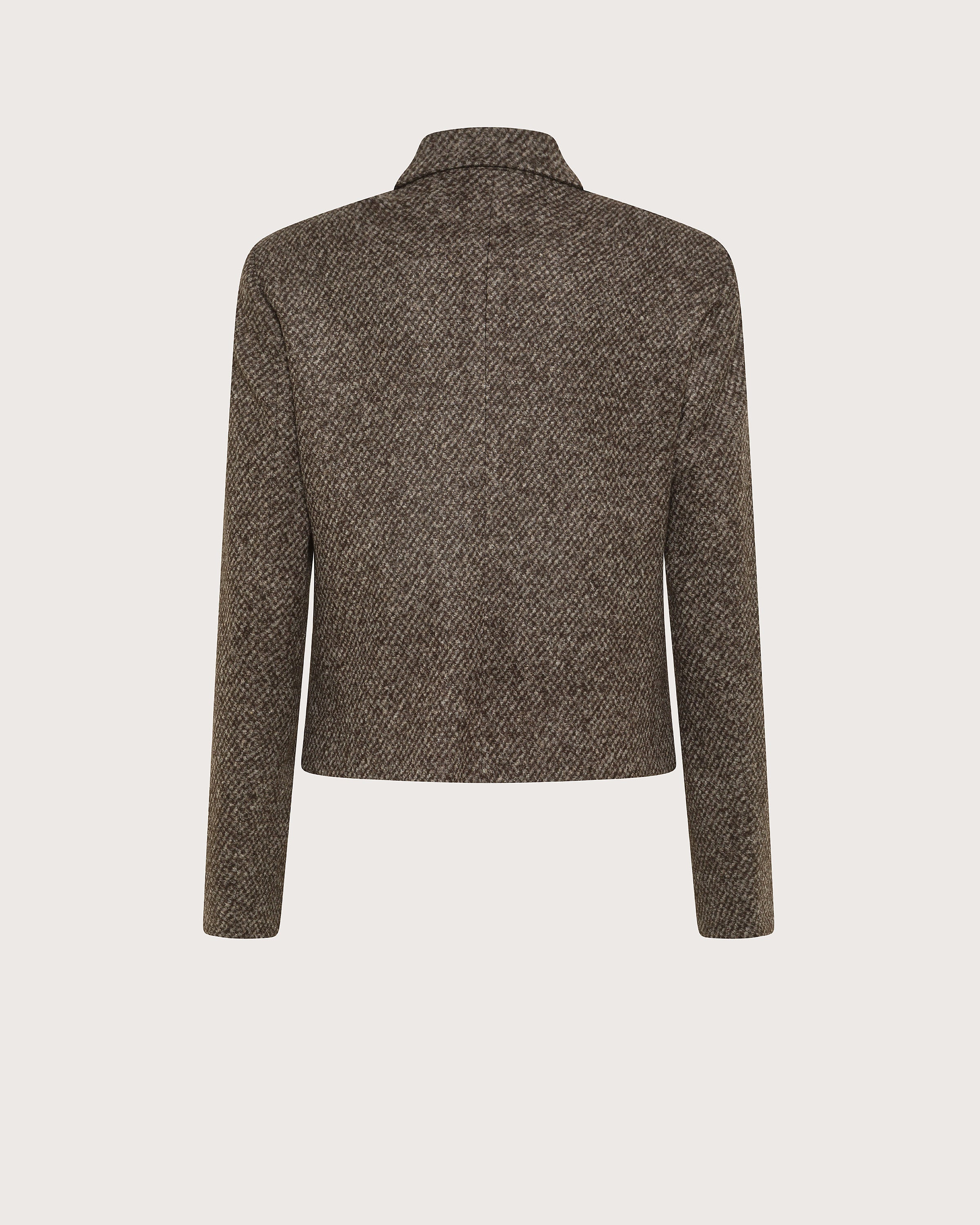 Giacchina corta a maniche lunghe realizzata in con microdisegno maglia misto lana. Colletto, chiusura frontale con bottoni e maxi tasche con patta.