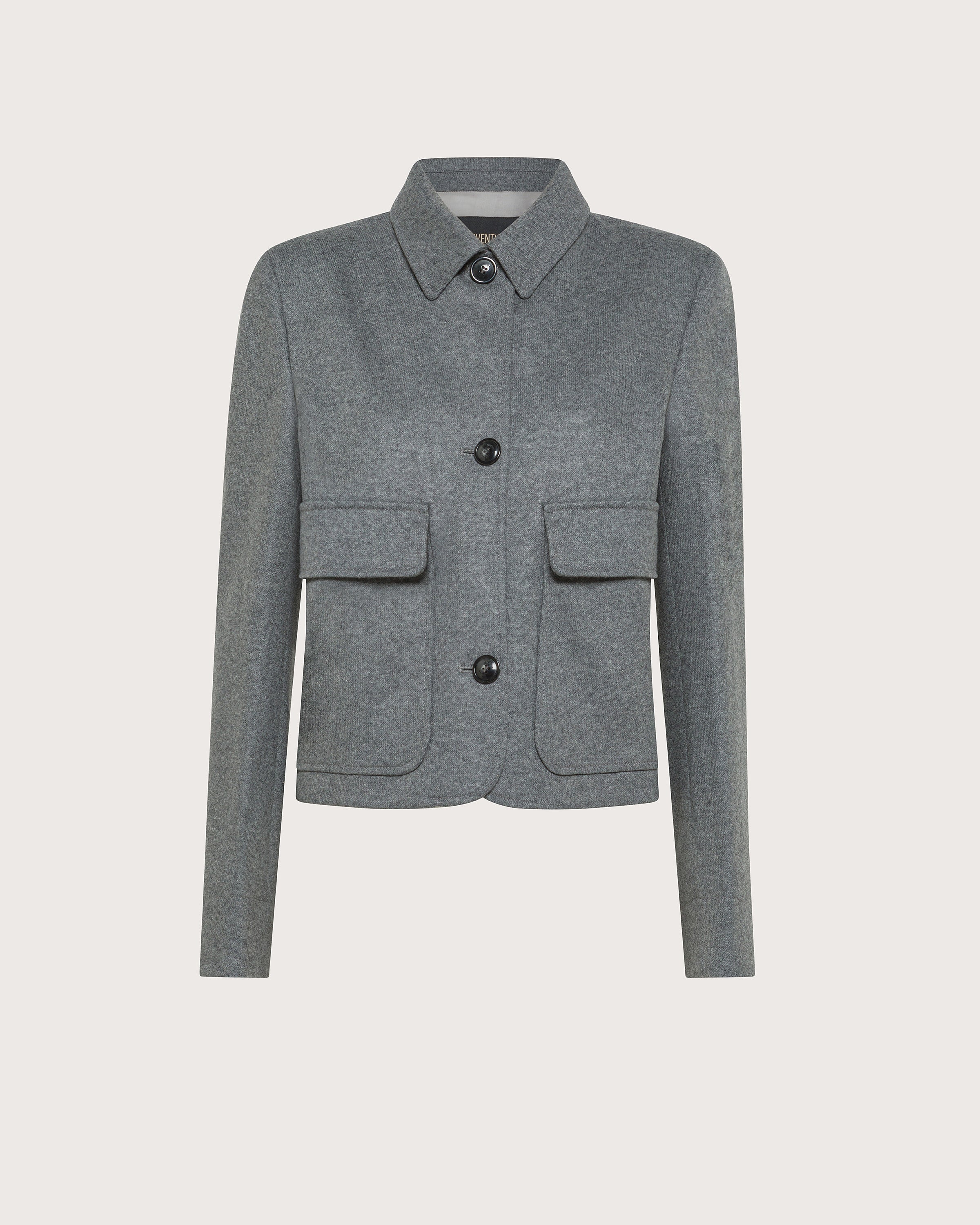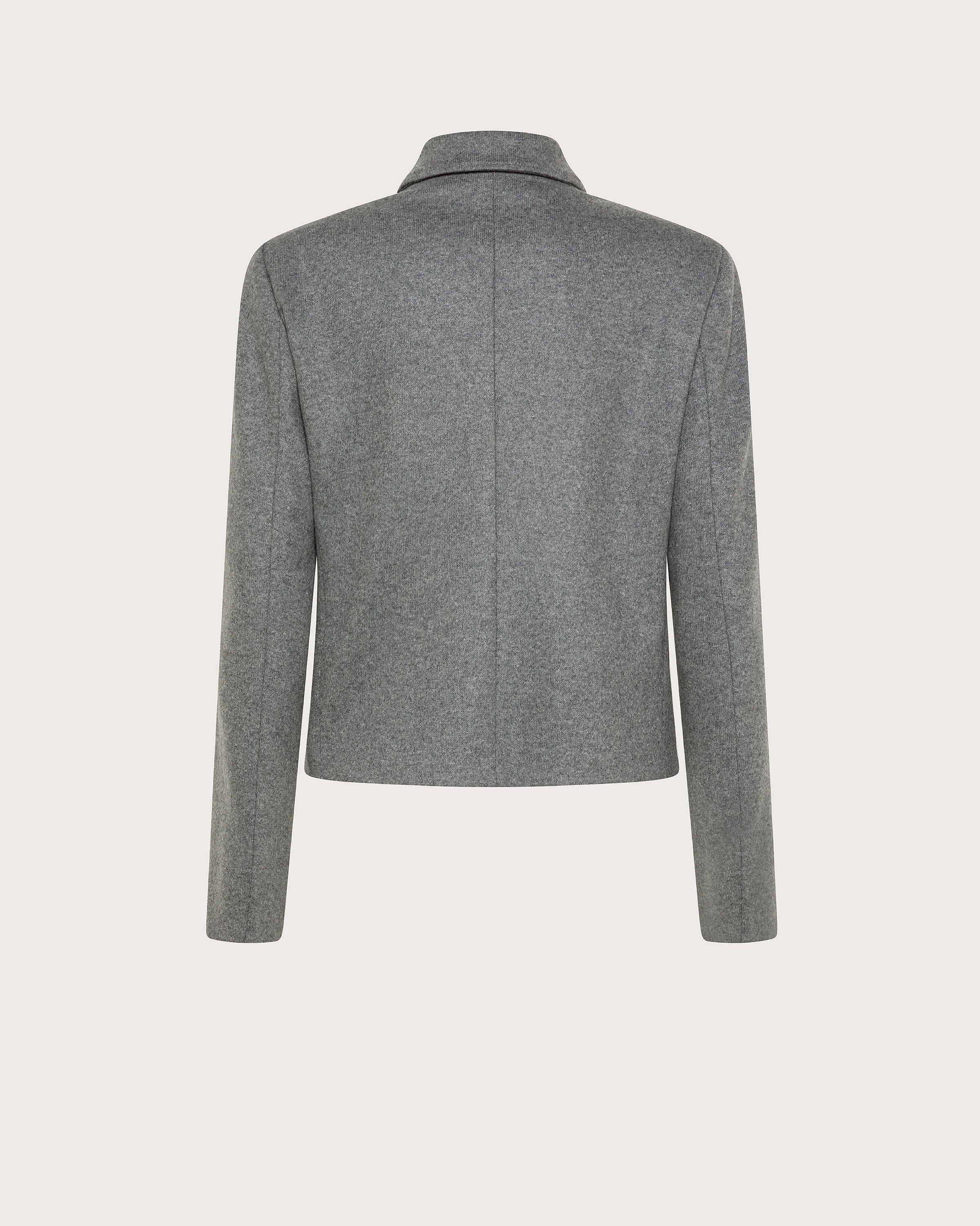 Giacchina corta a maniche lunghe realizzata in flanella in maglia schiacciata. Colletto, chiusura frontale con bottoni e maxi tasche con patta.