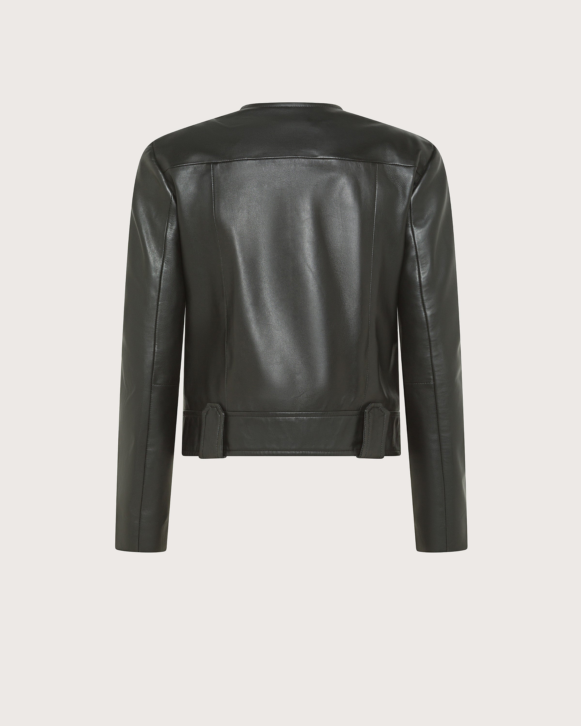 Giubbino girocollo realizzato in nappa morbida leggera. Chiusura frontae con bottoni dorati, tasche con patta sul petto e passanti in vita.