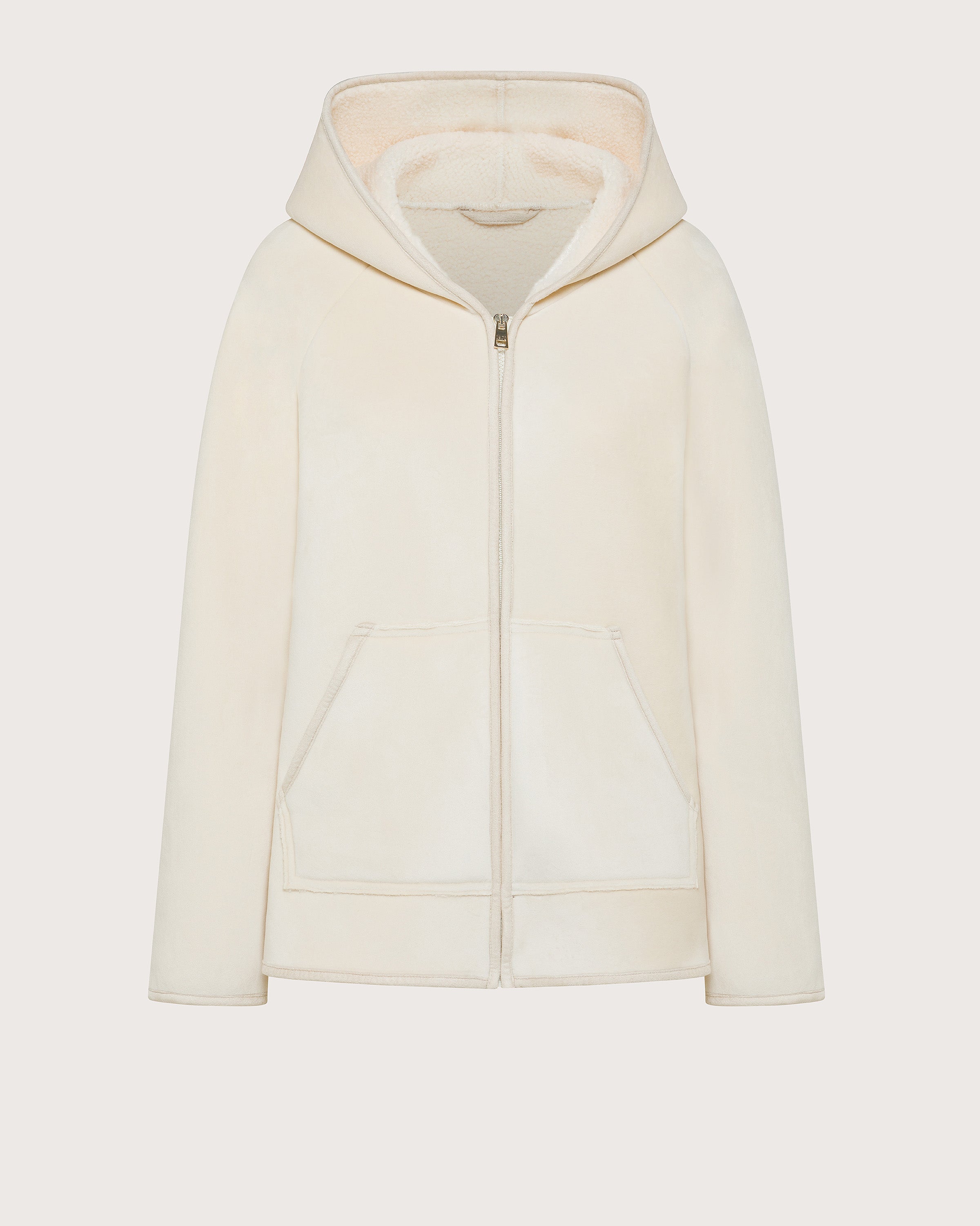 Giubbino realizzato in ciniglia orsetto accoppiato. Maniche lunghe, cappuccio e chiusura frontale con zip. Tasche applicate a toppa sul davanti.