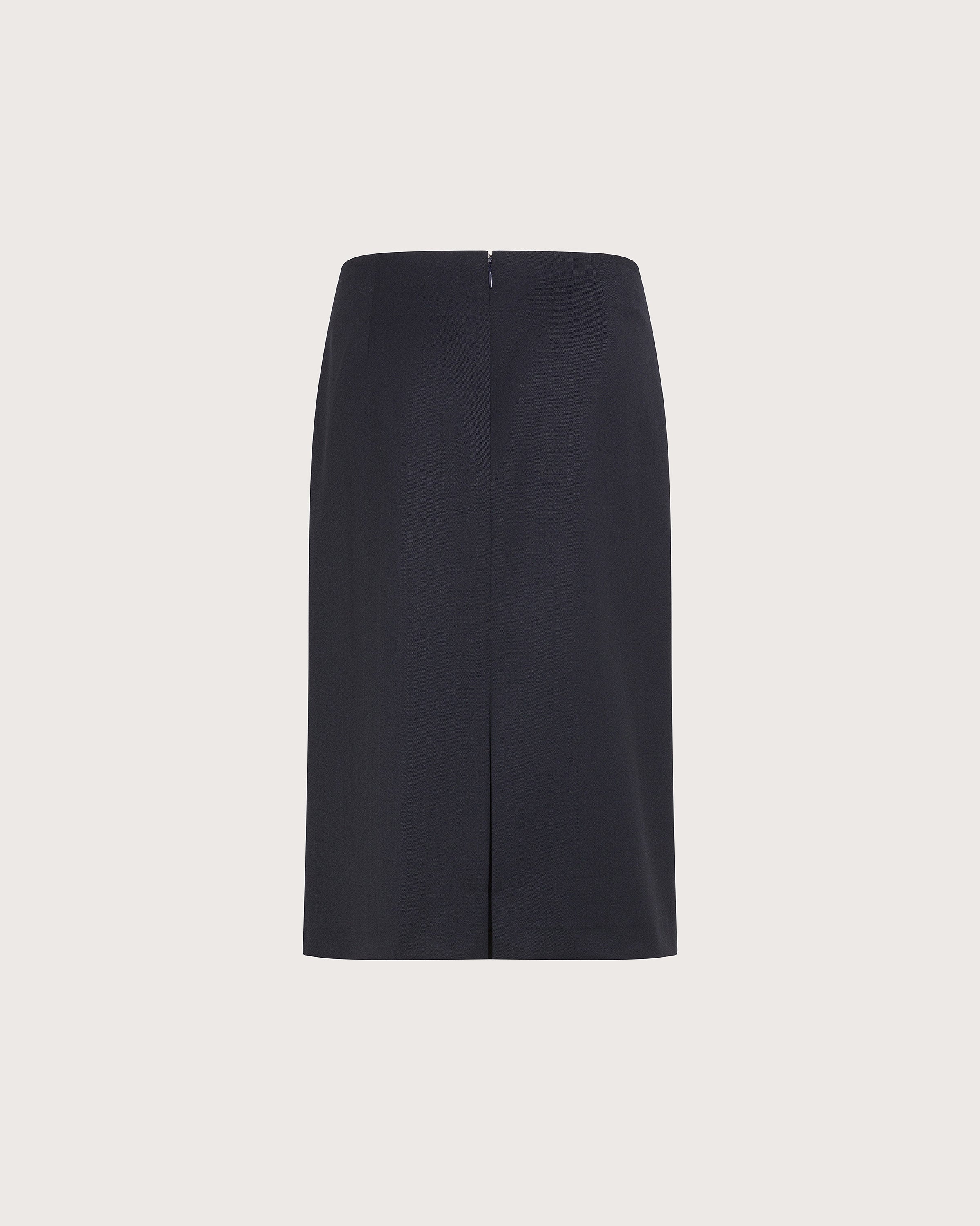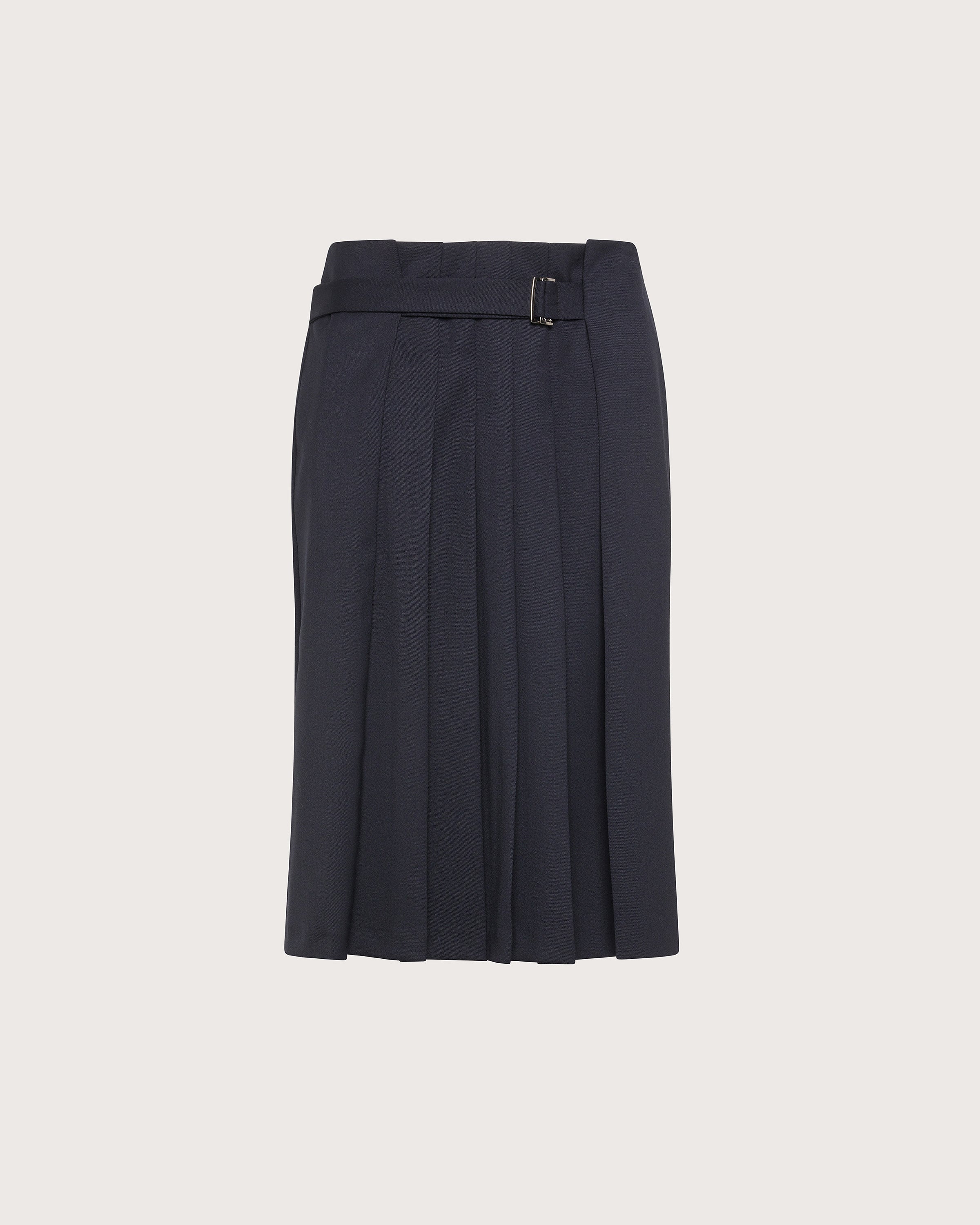 Gonna al ginocchio con pieghe solo davanti e cinturino regolabile con passante in metallo. Realizzata in gabardina misto lana bistretch. Liscia sul retro con spacco e zip invisibile.