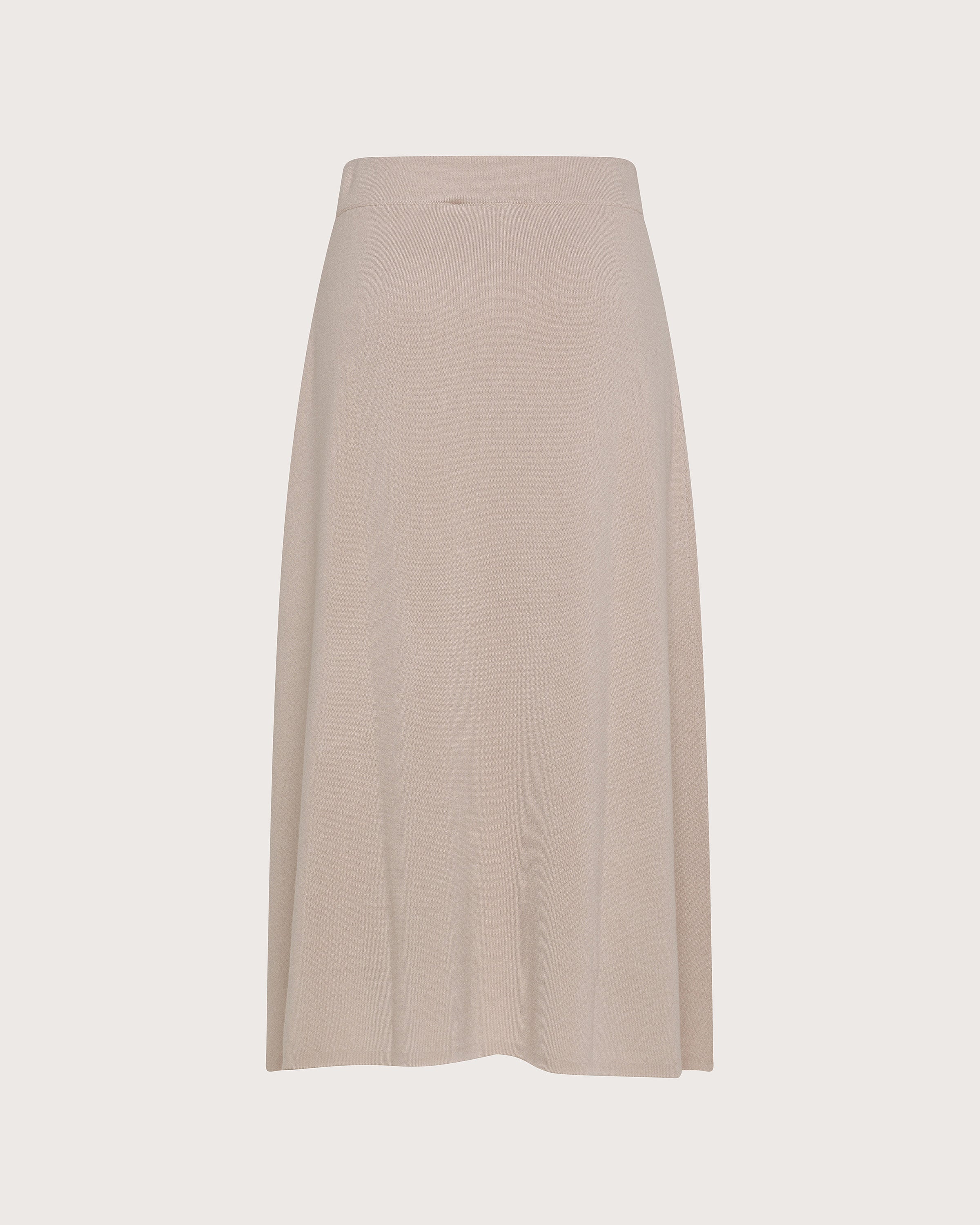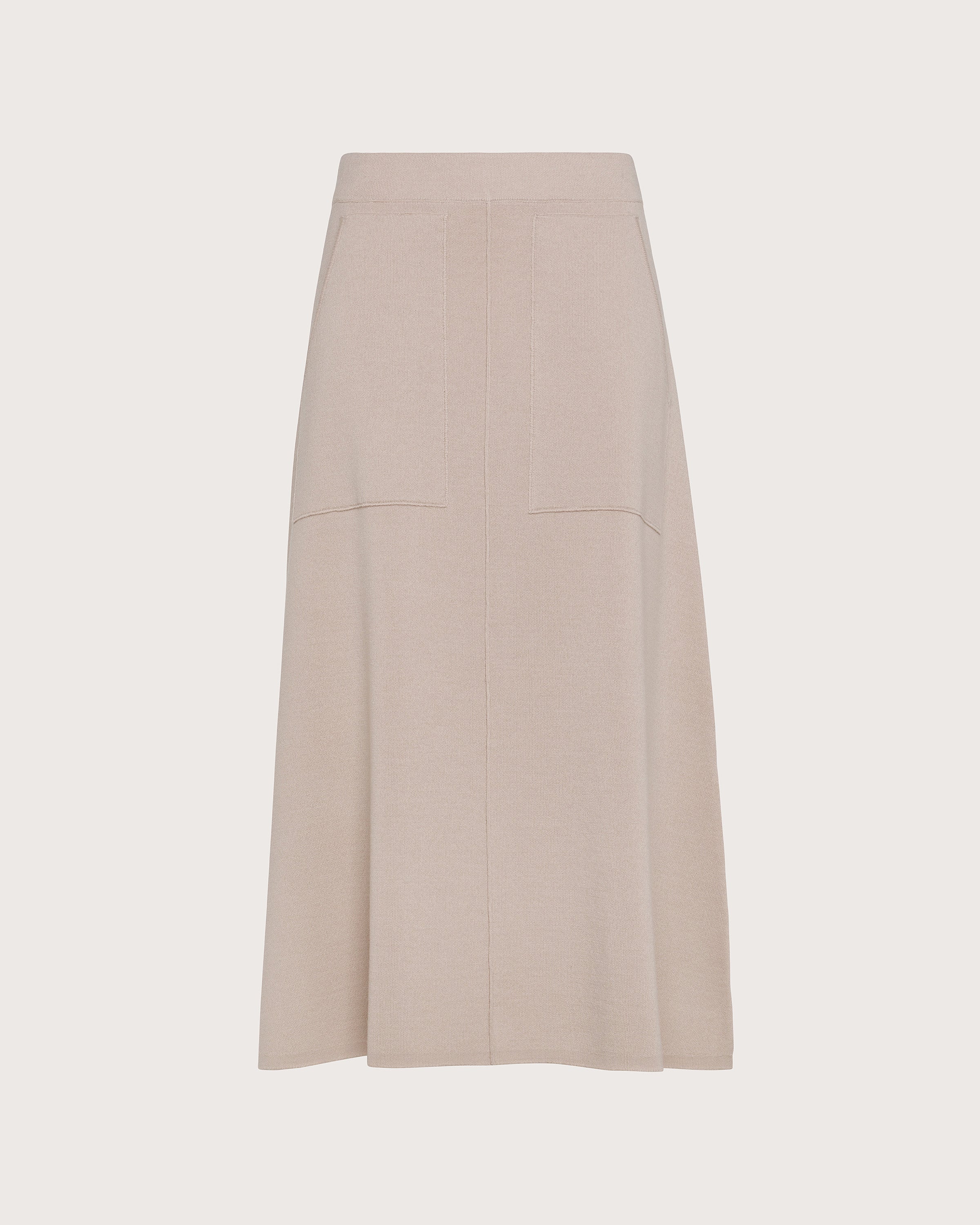 Gonna longette effetto A realizzata in maglia unita f.14 misto lana. Vita elasticata, maxi tasche a toppa sui fianchi e effetto nervatura davanti.