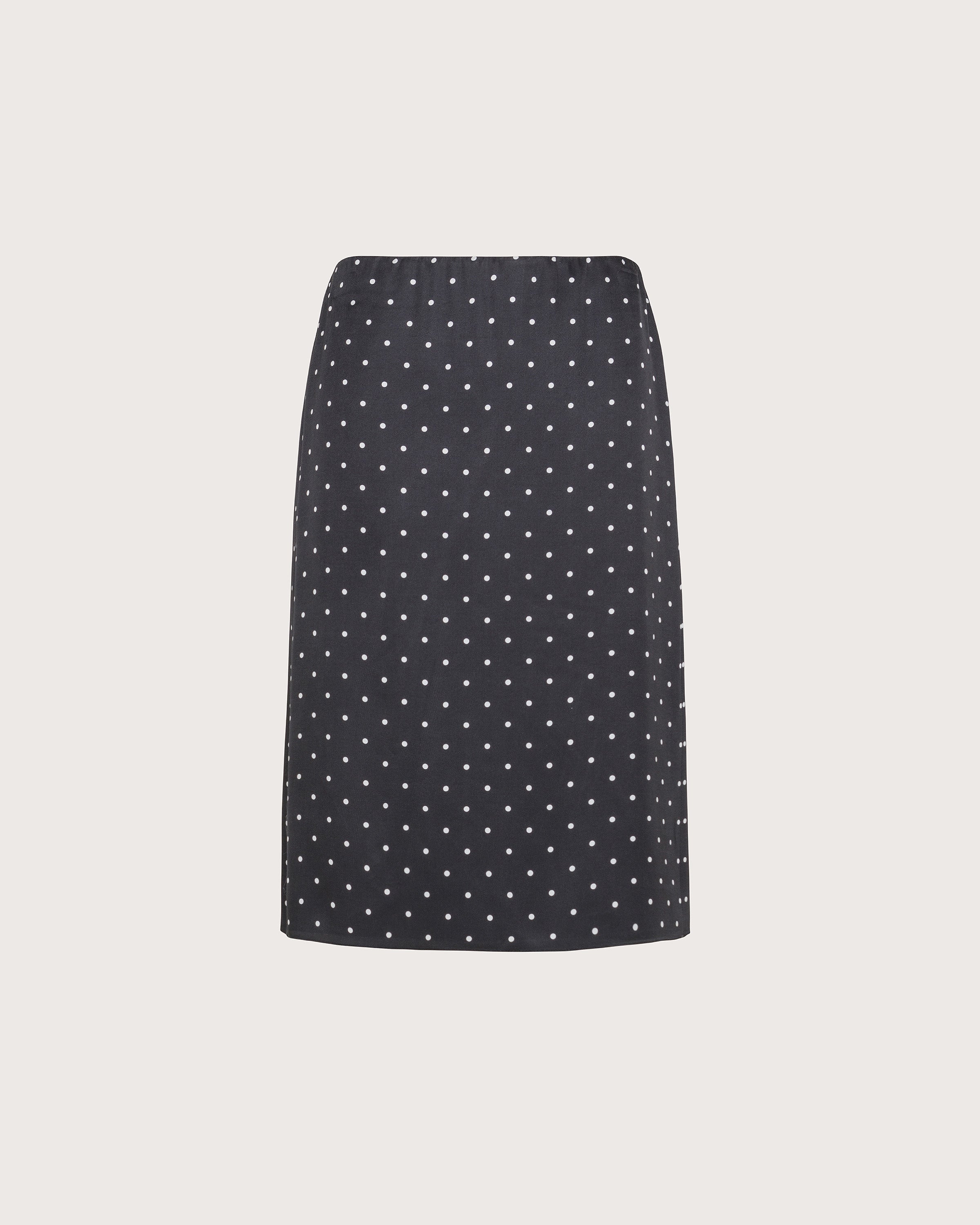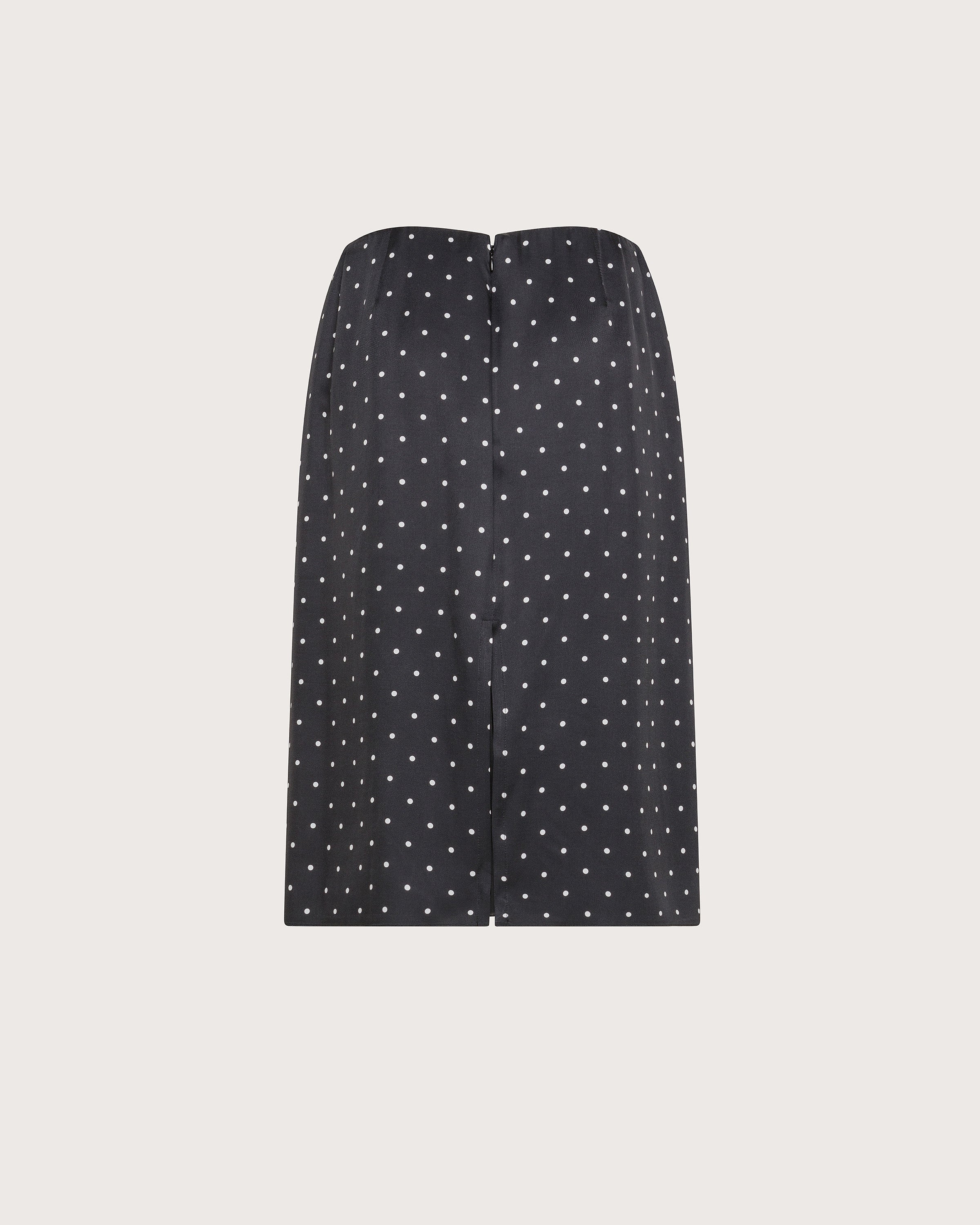 Gonna midi realizzata in twille di viscosa con stampa a pois monocolor. Vita con elastico interno. Zip invisibile e spacco sul retro.