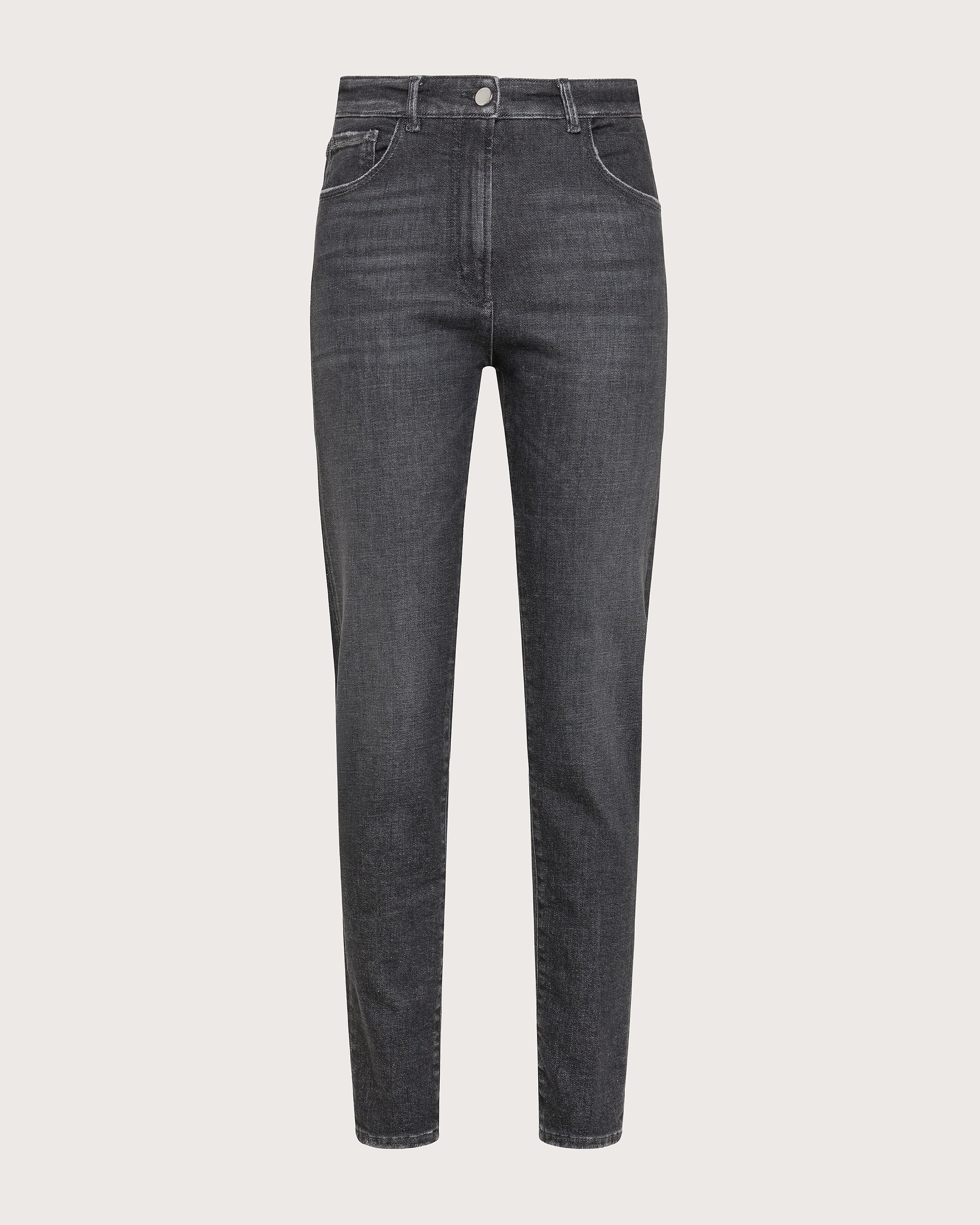 Jeans skinny alla caviglia con cinque tasche in denim power stretch. Chiusura frontale con cerniera e bottone.