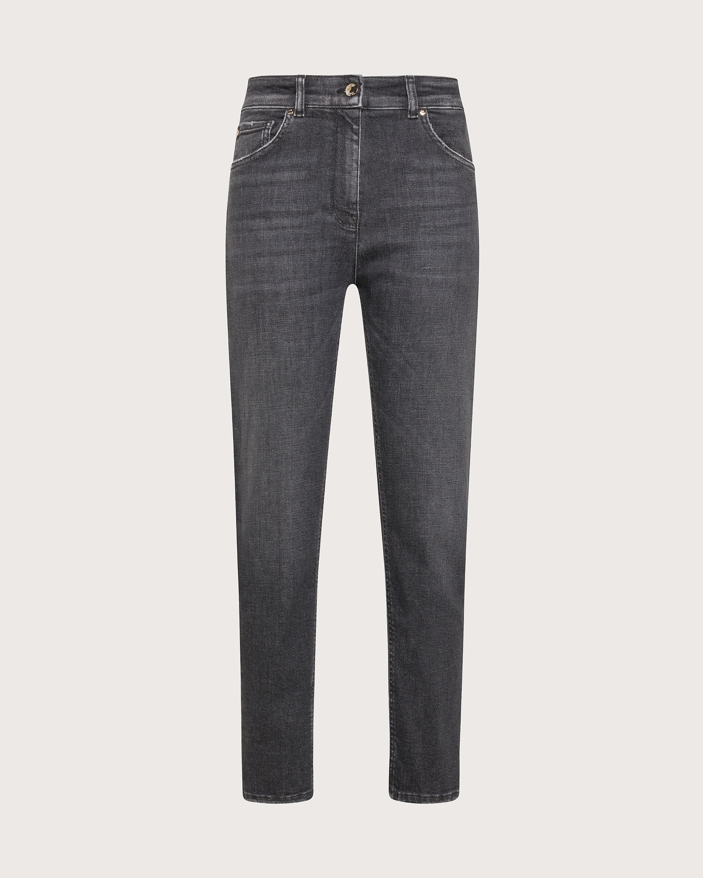 Jeans skinny alla caviglia con cinque tasche in denim power stretch. Chiusura frontale con cerniera e bottone.