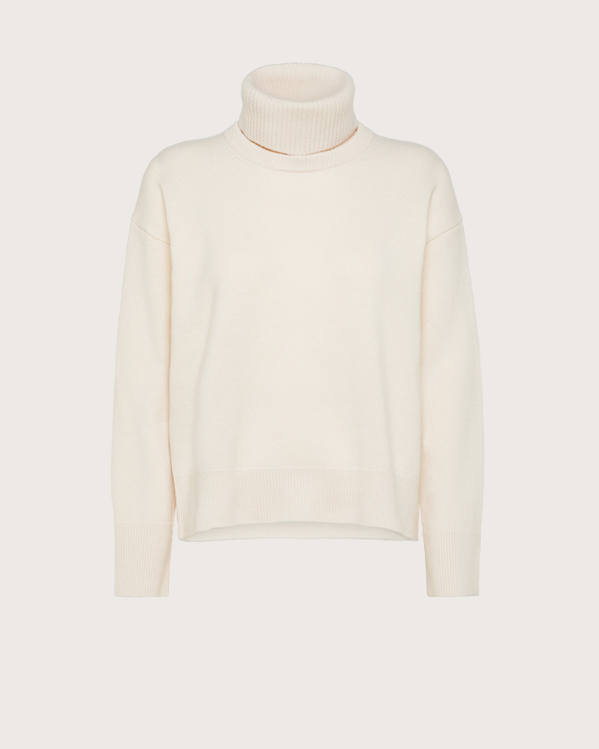 Maglia con collo alto staccabile realizzato in pura lana. Collo, fondo e polsini a coste.