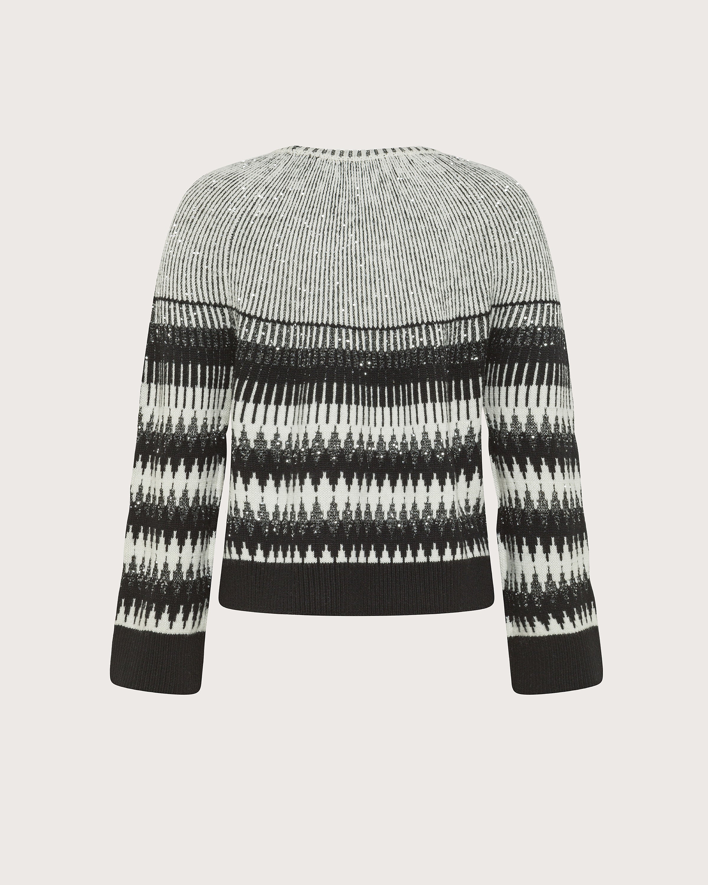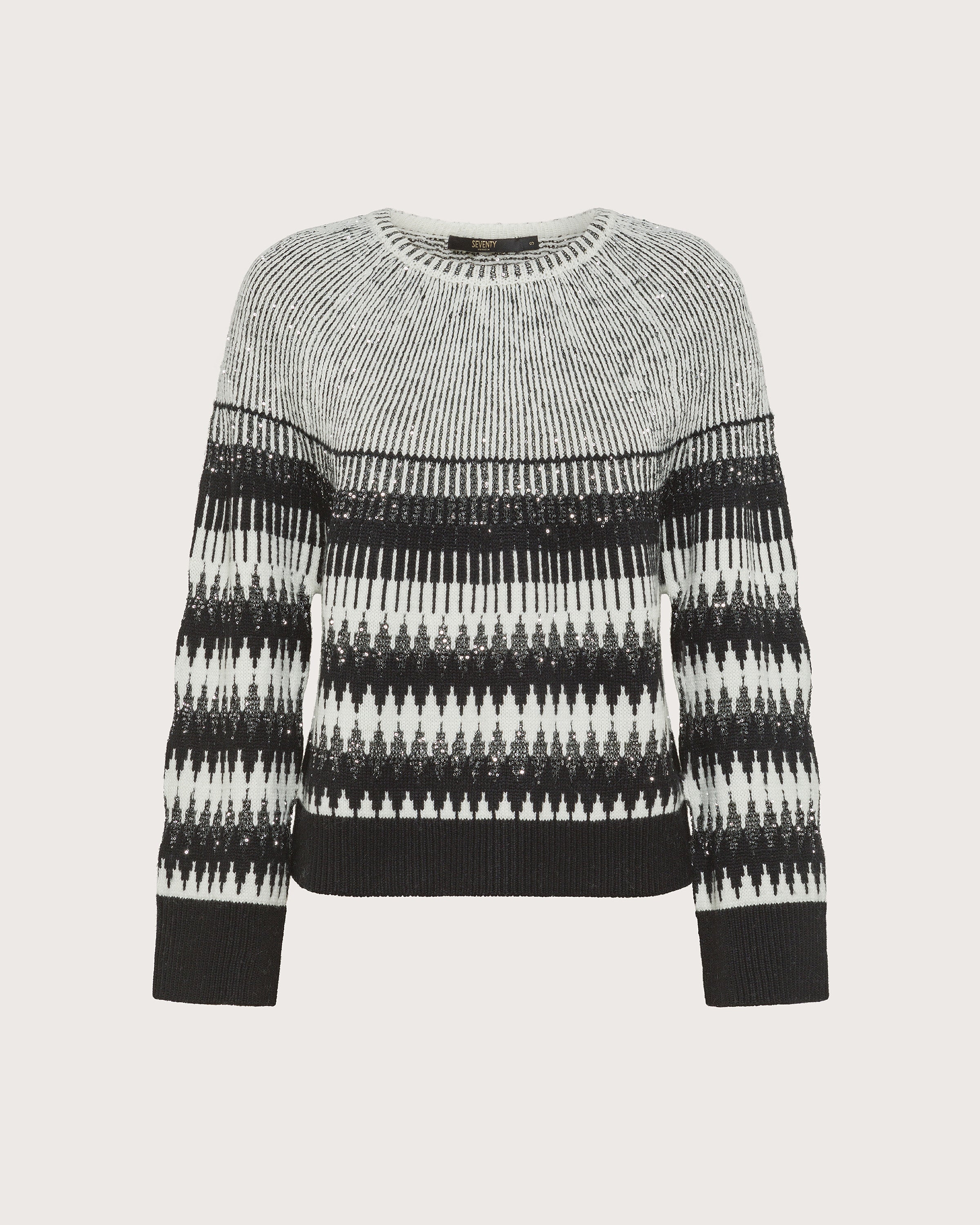 Maglia girocollo intarsiata con paillettes. Disegno geometrico. Fondo e polsi in costine.