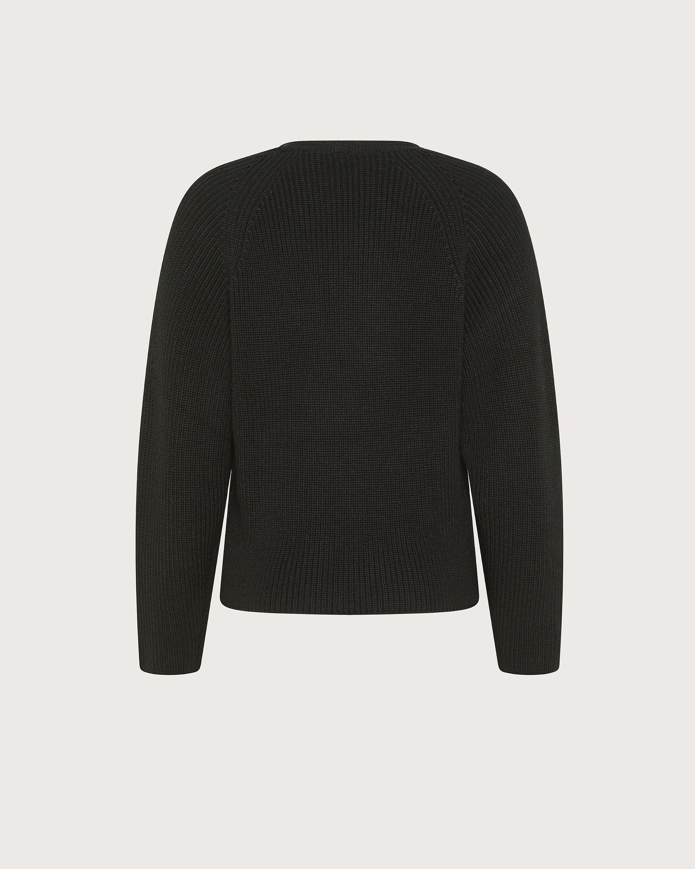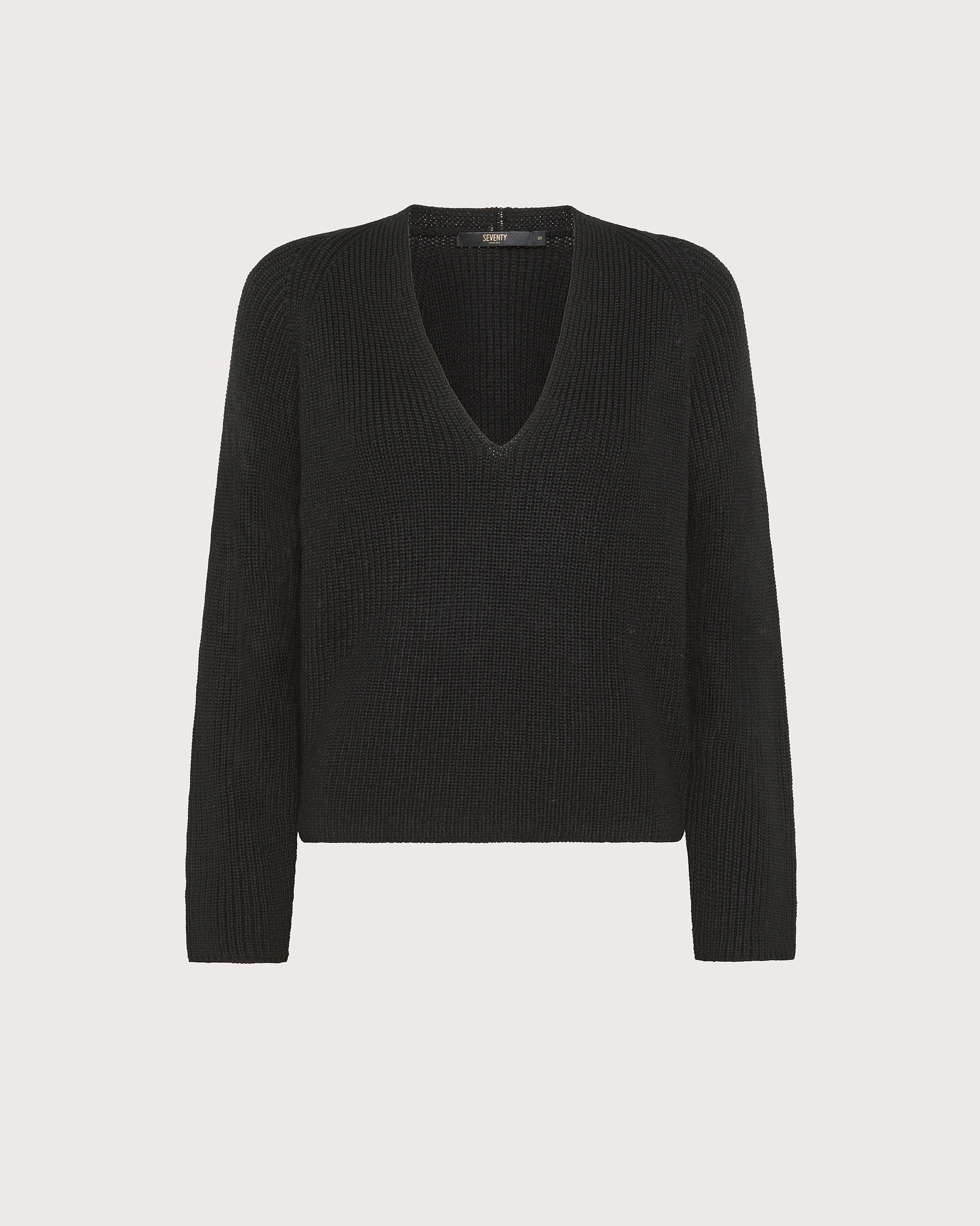 Maglia scollo a V leggermente boxy realizzato in costa inglese. Manica raglan.