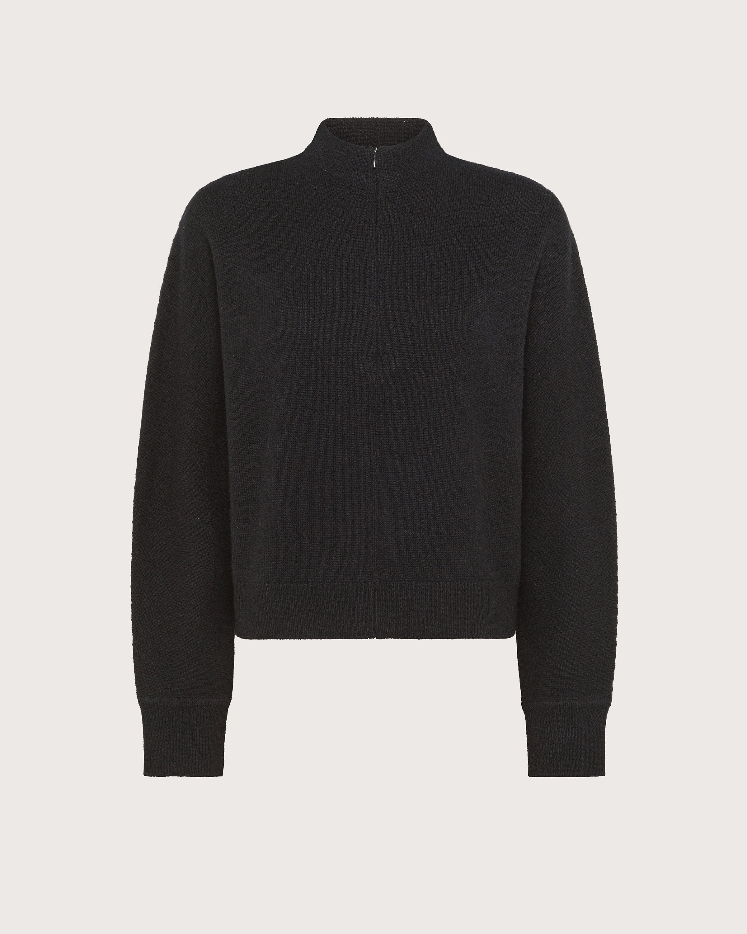 Maglioncino con collo a lupetto e zip realizzato in pura lana. Maniche lunghe. Collo, fondo e polsi a coste.