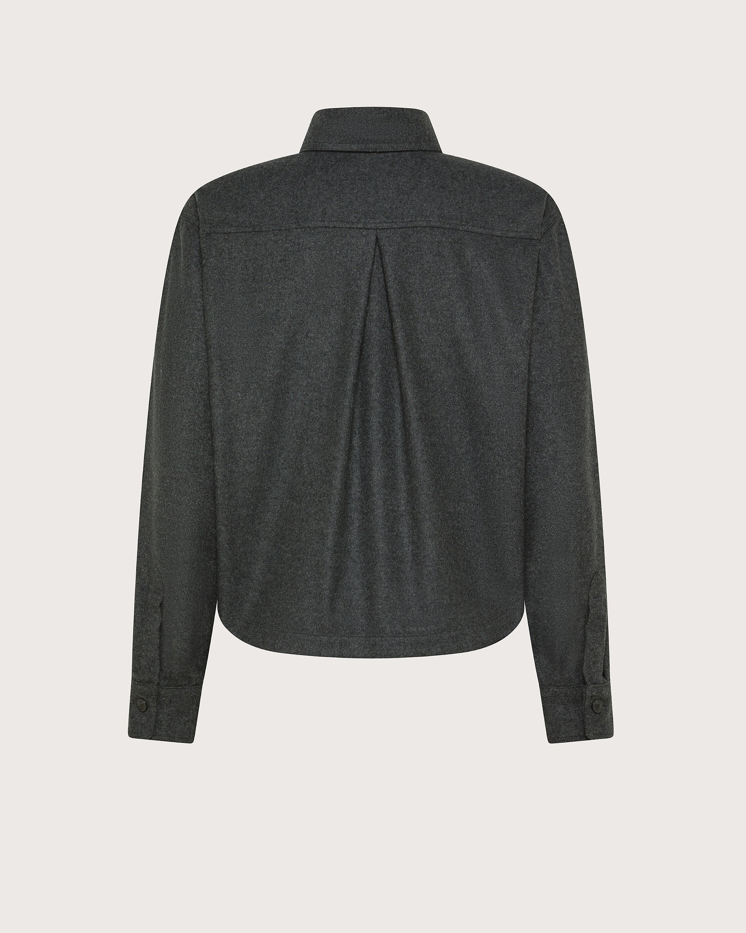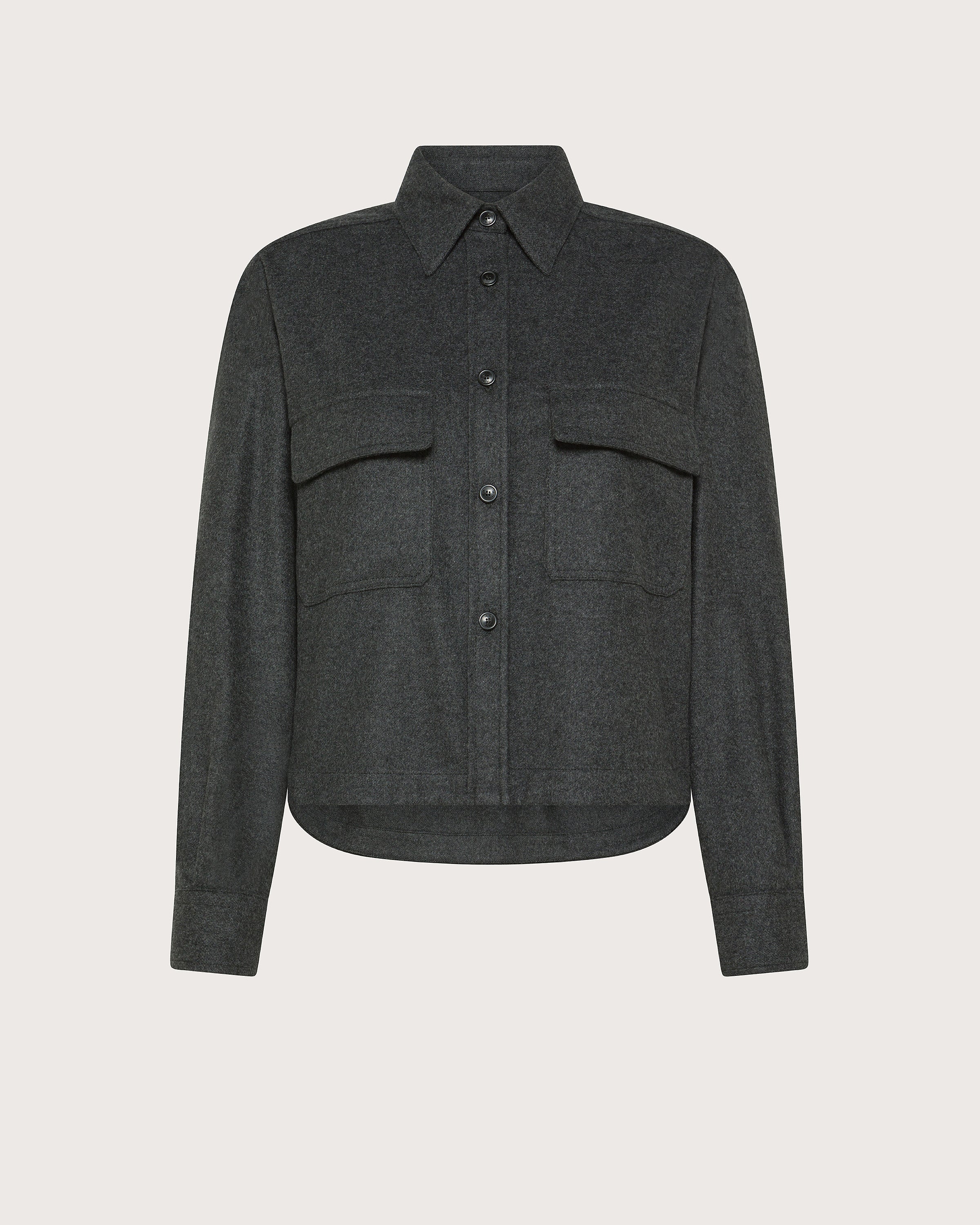 Overshirt boxy realizzata in flanella misto lana. Tasche applicate a toppa con pattina sul davanti. Chiusura frontale con bottoni e collo camicia con fascetta.