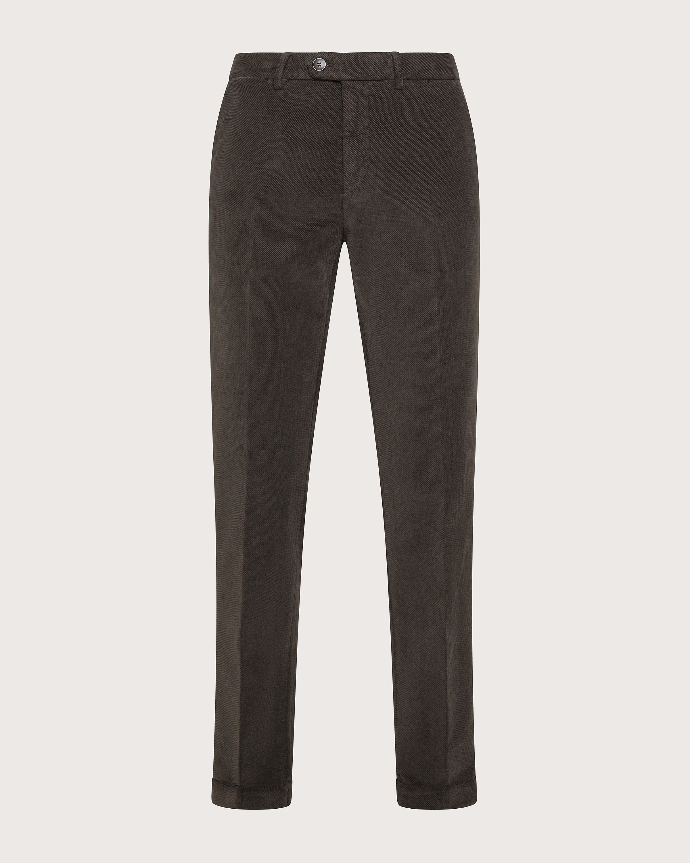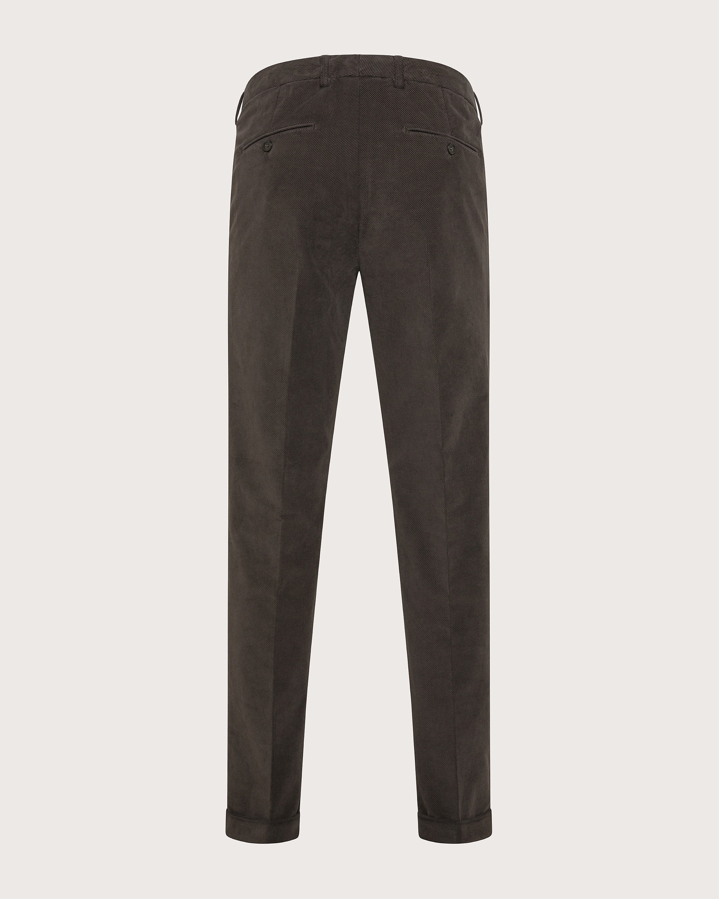 Pantalone chino classico realizzato in diagonale slegato stretch cotone tinto capo. Caratterizzato da tasche inclinate e taschino orologio davanti, tasche a doppio filetto con bottone sul retro. Chiusura con cerniera e bottone. Fondo con balza.