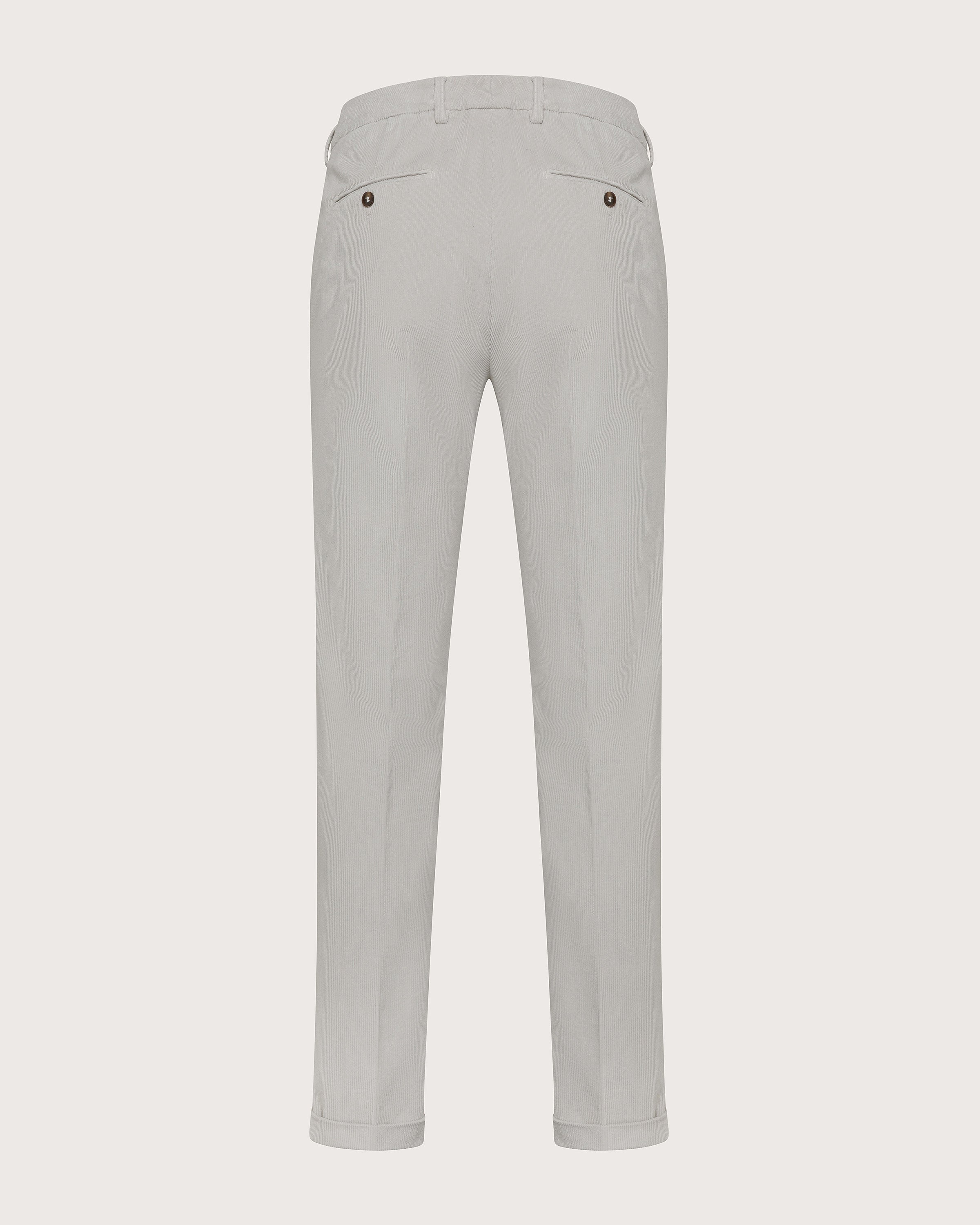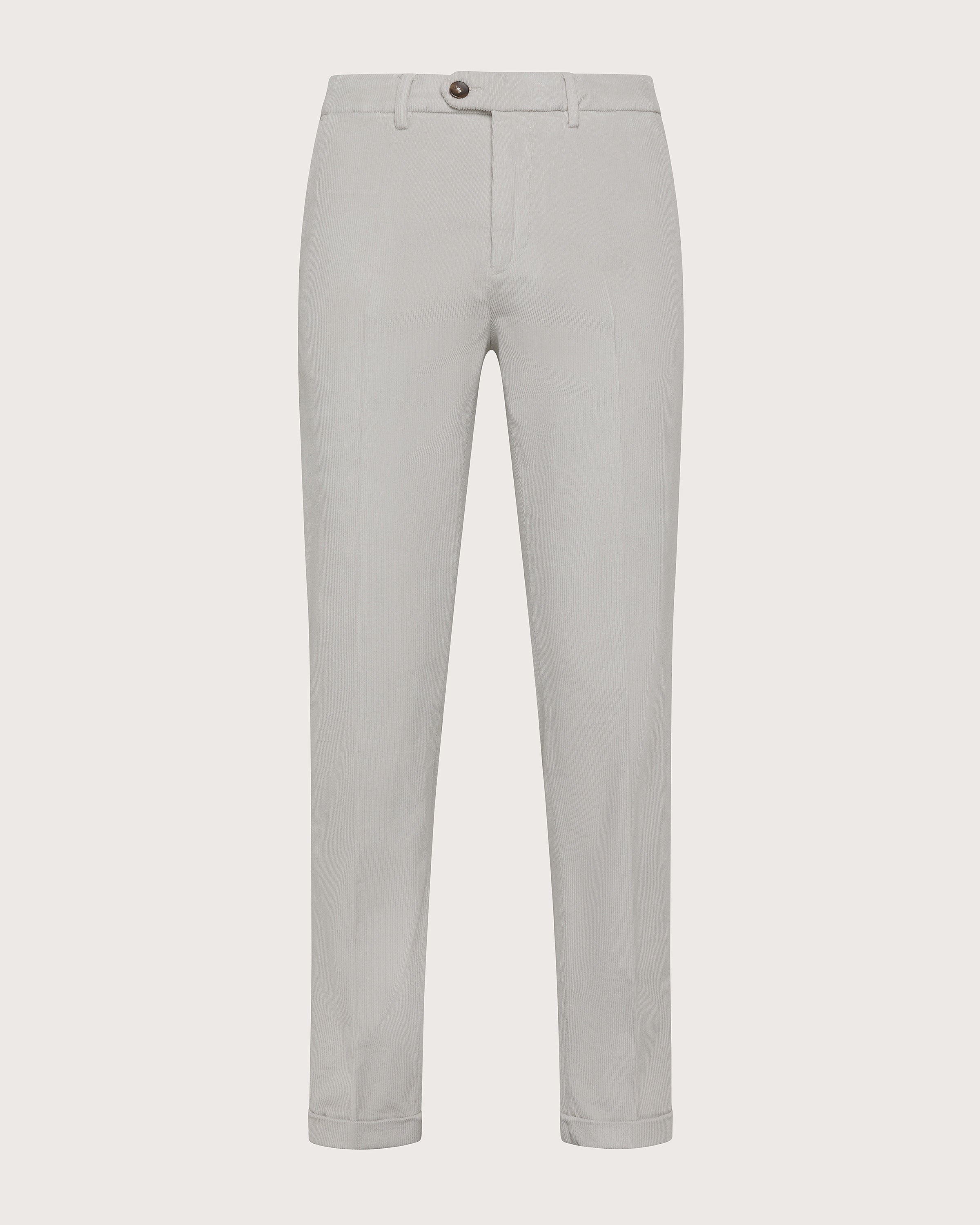Pantalone chino classico realizzato in velluto cotone-modal 800 righe stretch. Caratterizzato da tasche inclinate e taschino orologio davanti, tasche a doppio filetto con bottone sul retro. Chiusura con cerniera e bottone. Fondo con balza.