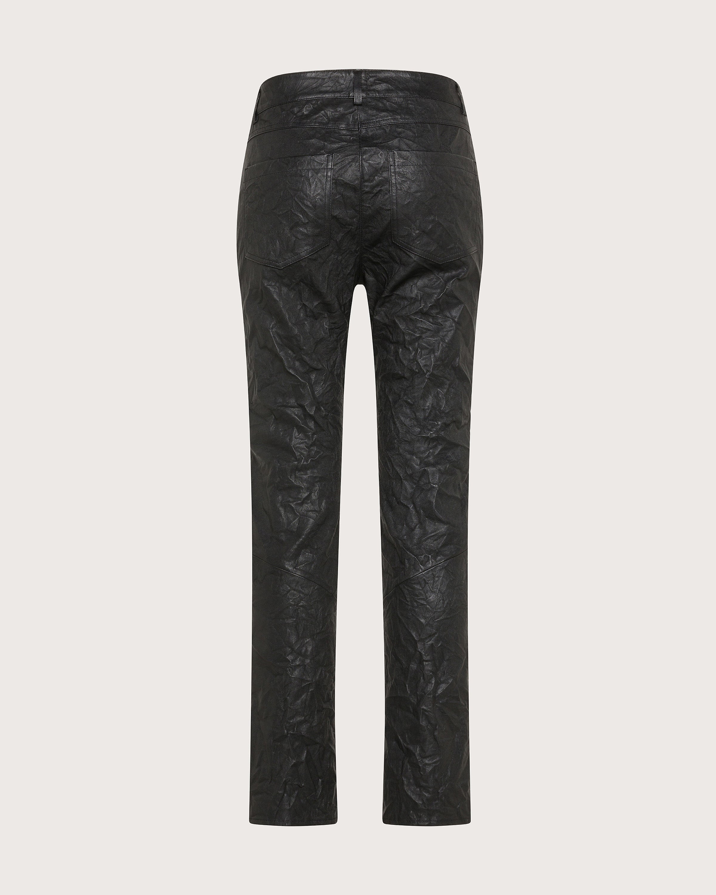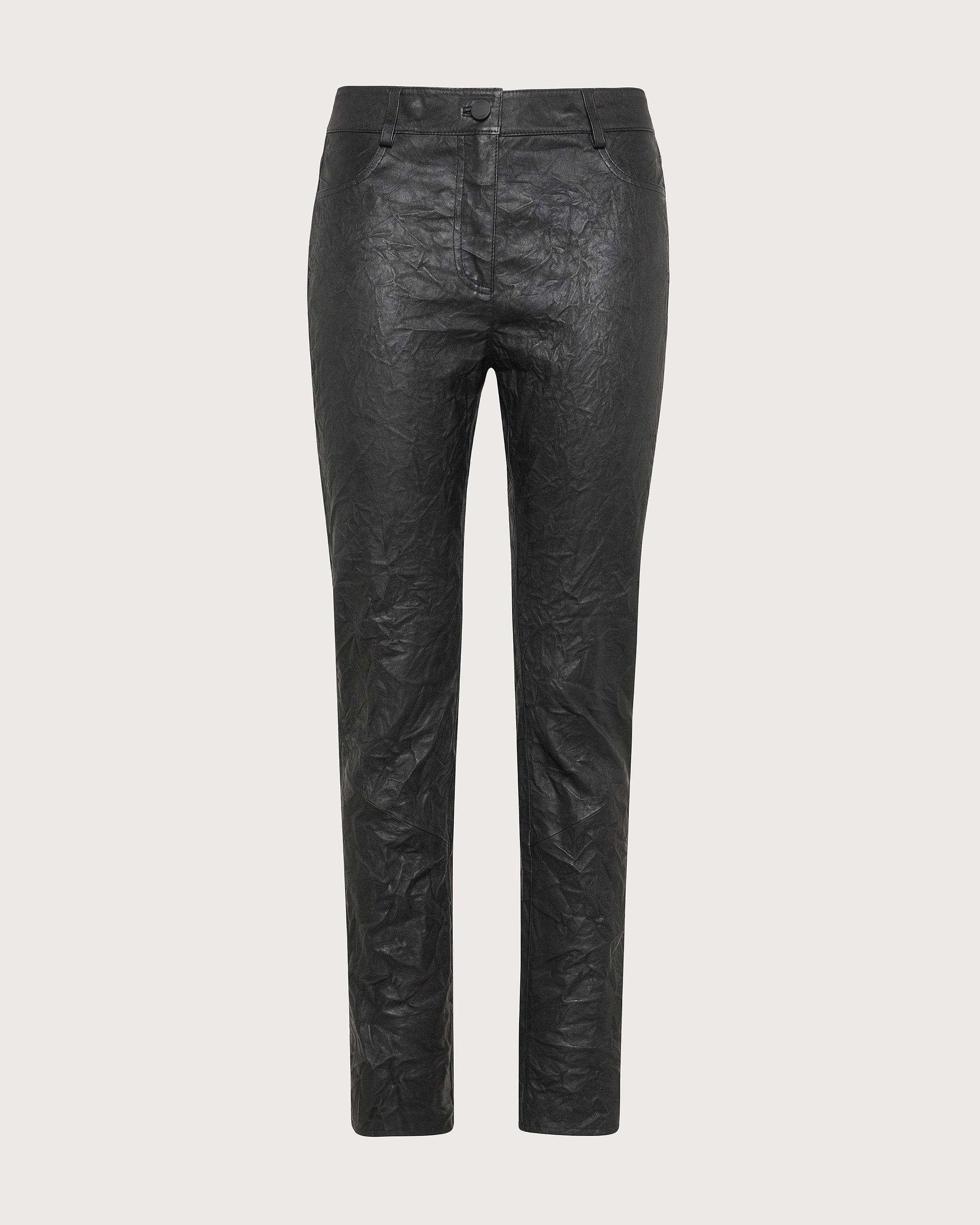 Pantalone cinque tasche slim realizzato in pelle stretch effetto crashed.