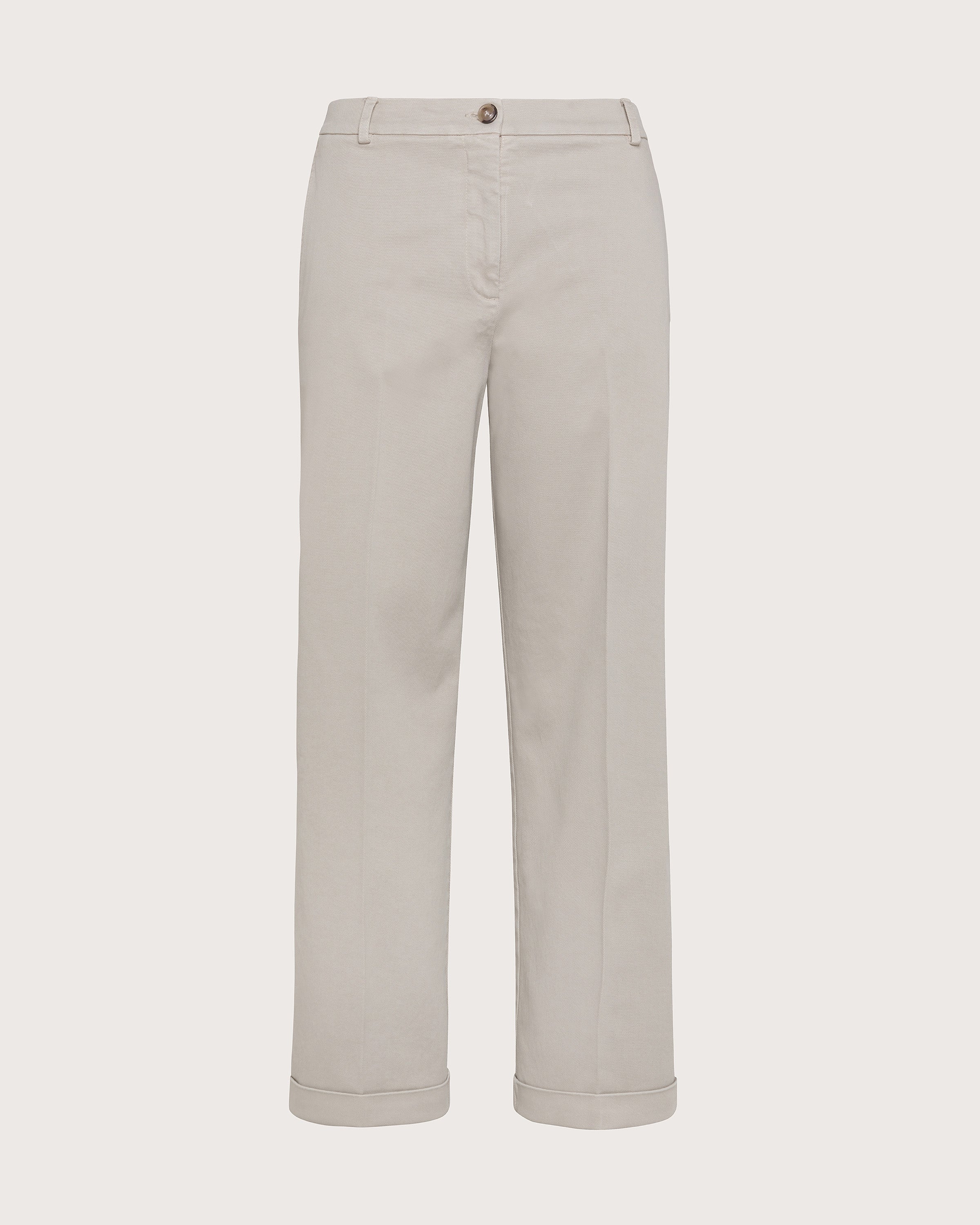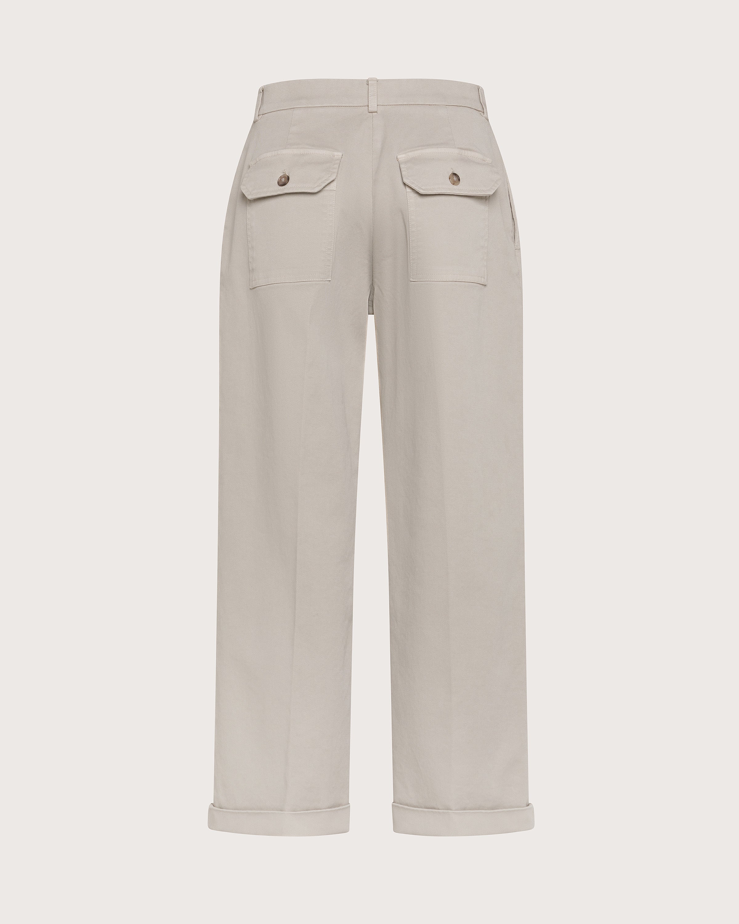 Pantalone dritto lungo la caviglia con risolvinto al fondo realizzato in cotone bull leggero stretch. Tasche posteriori applicate con pattine squadrate e bottone. Stirato con piega.