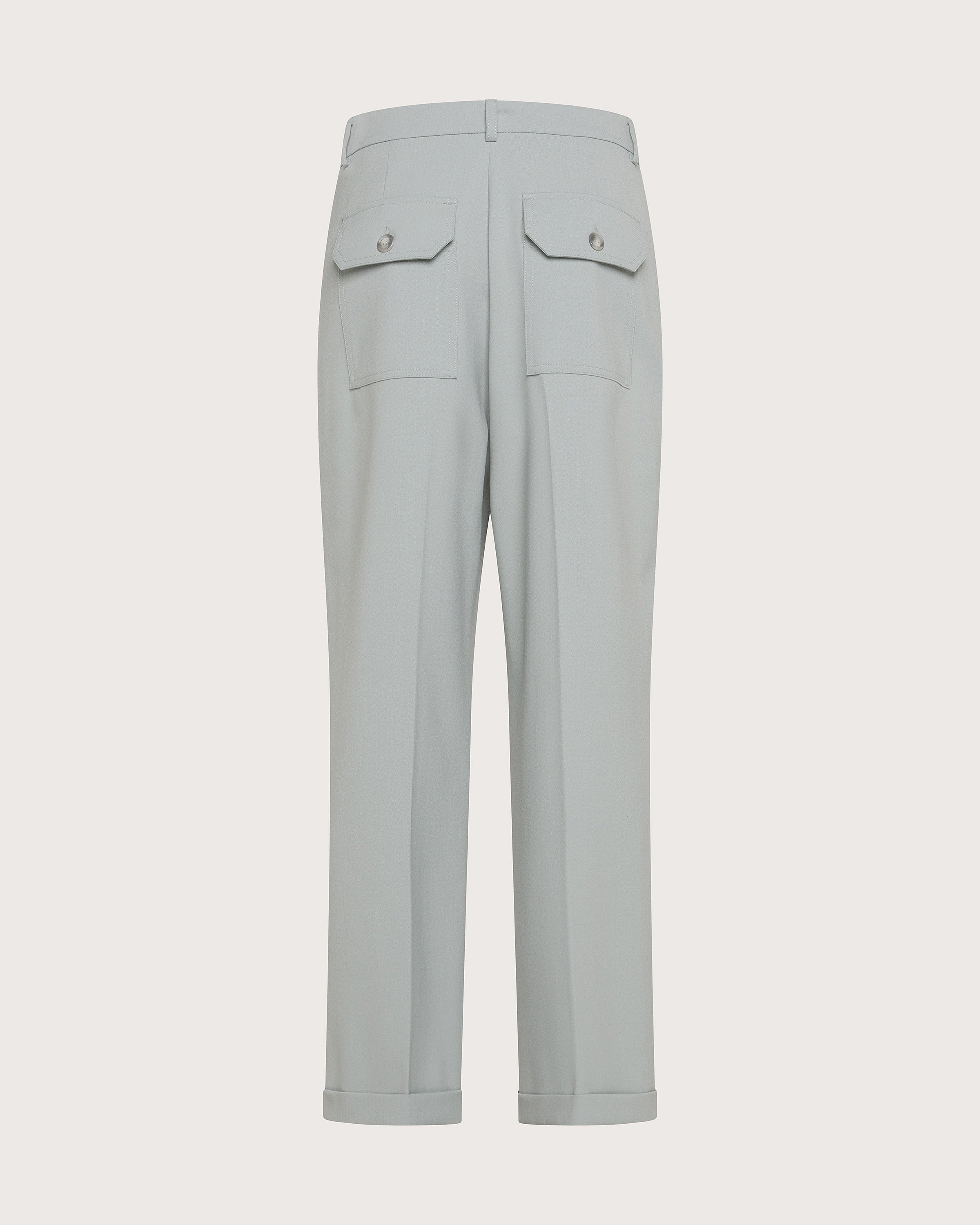 Pantalone dritto lungo la caviglia con risvoltino al fondo realizzato in gabardina misto lana bistretch. Tasche posteriori applicate con pattine squadrate e bottone. Stirato con piega.