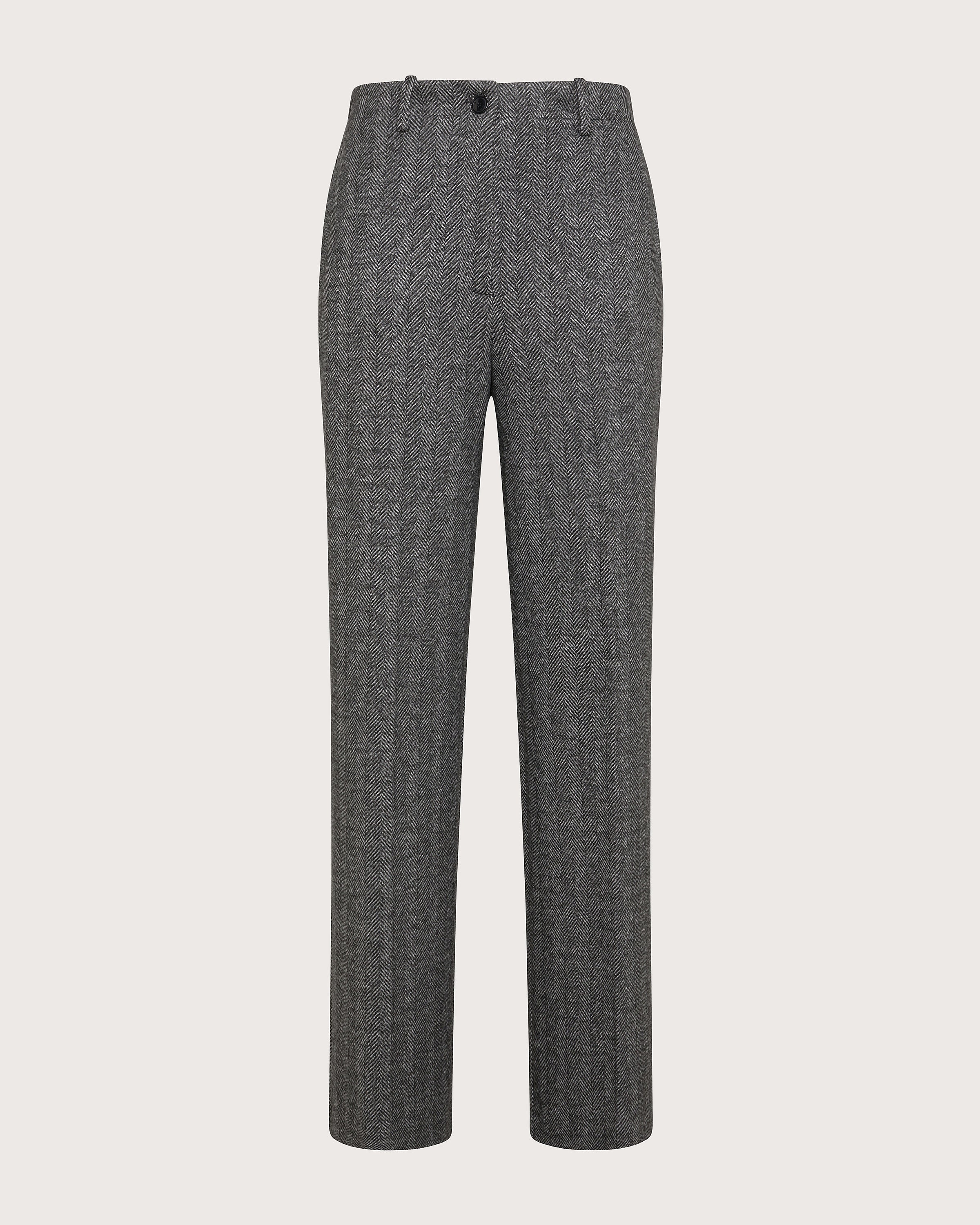 Pantalone lungo relax fit in resca tessuto maglia. Vita piatta davati ed elasticata dietro. Tasche laterali e chiusura con zip e botone.