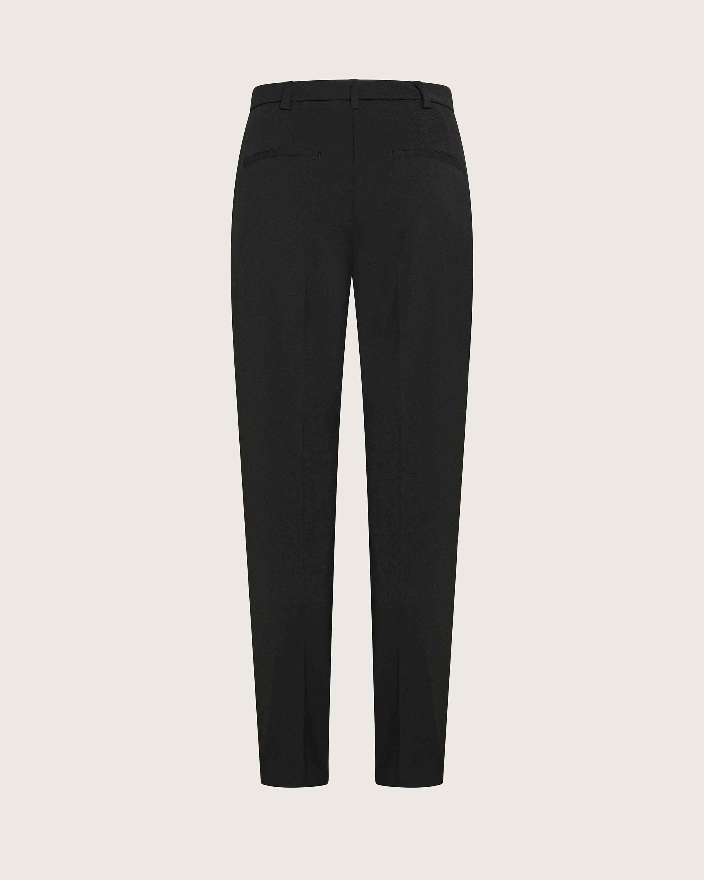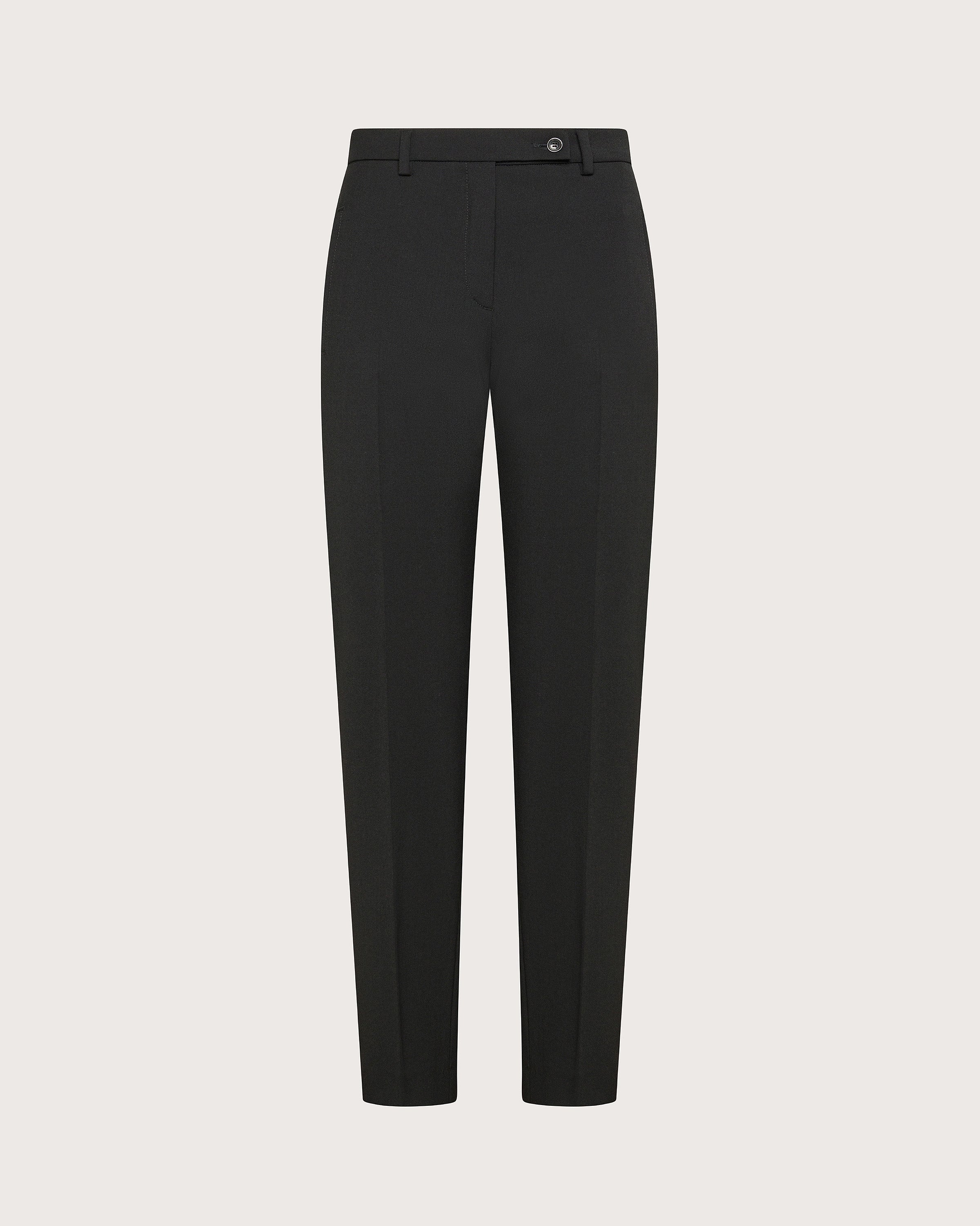 Pantalone slim fit alla caviglia realizzato in gabardina misto lana bistretch. Tasche a filetto sul retro. Chiusura anteriore con cerniera, bottone interno e bottone esterno.