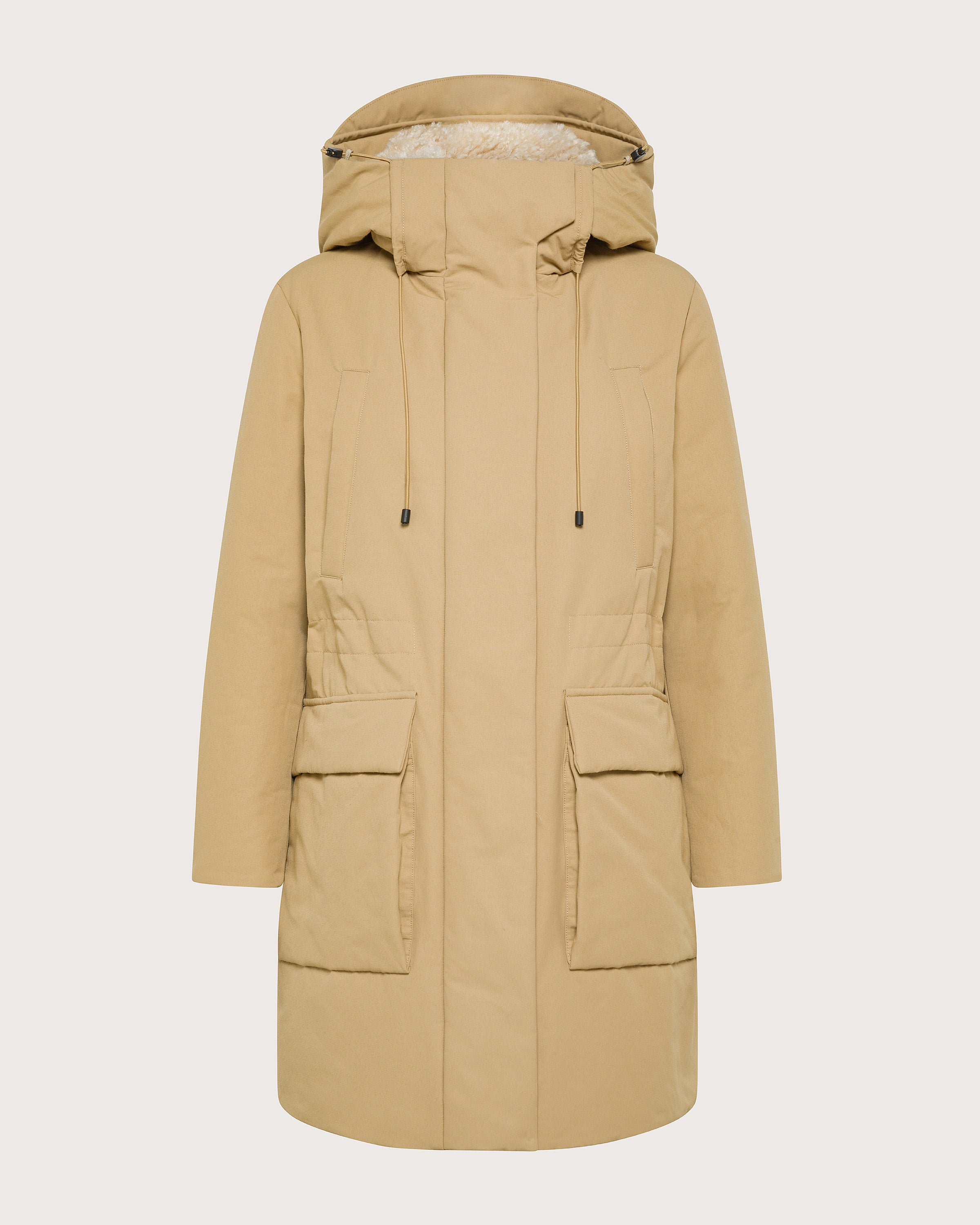 Parka in canvas di cotone poliammide con cappuccio interno in ecopelliccia. Chiusura frontale con zip nascosta, coulisse in vita e tasche applicate a toppa con pattina sul davanti.