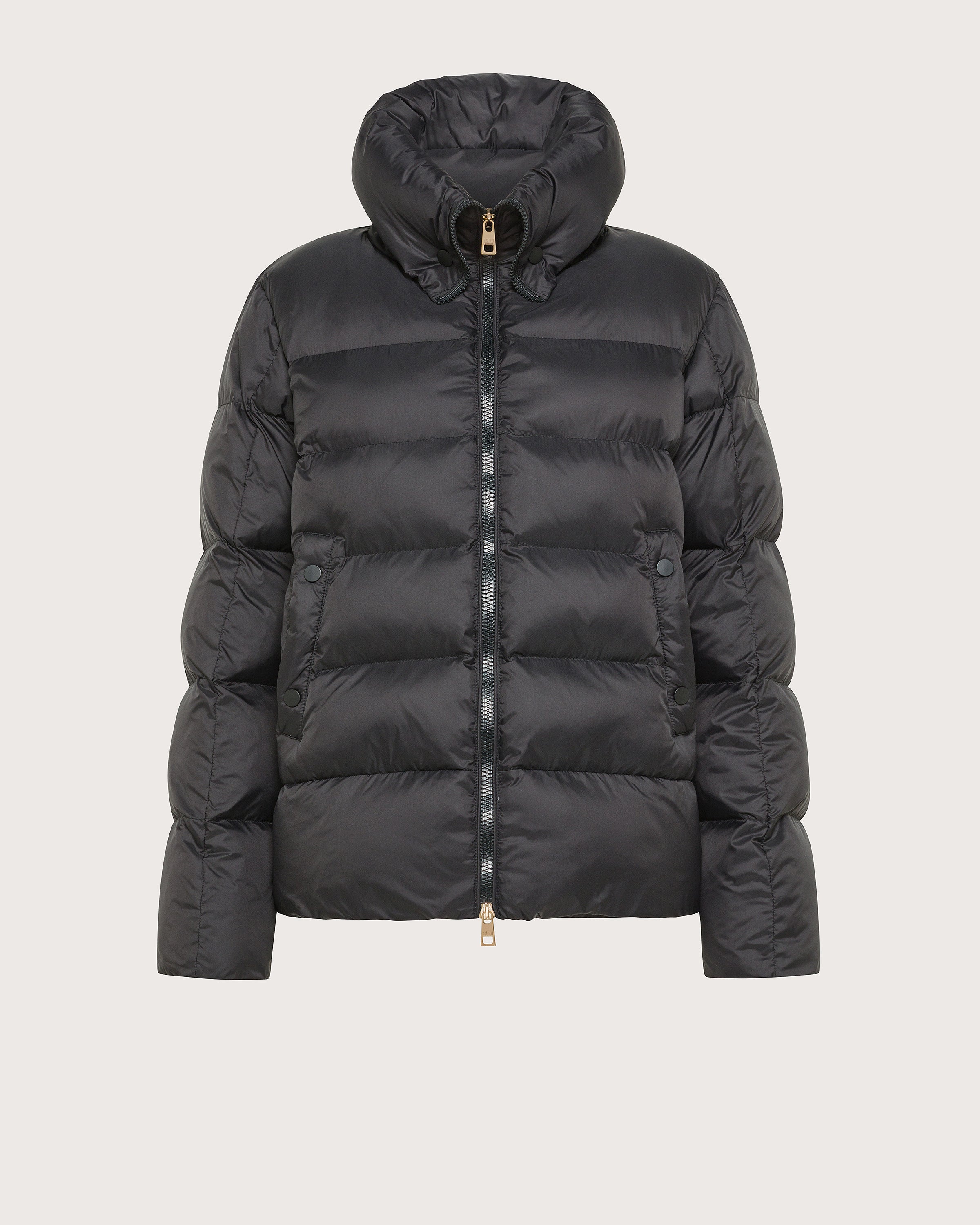 Piumino corto trapuntato a boudin con full zip lunga realizzato in nylon. Tasche a filetto laterali con bottoni, maniche lunghe e collo alto con dettaglio di bottoni.