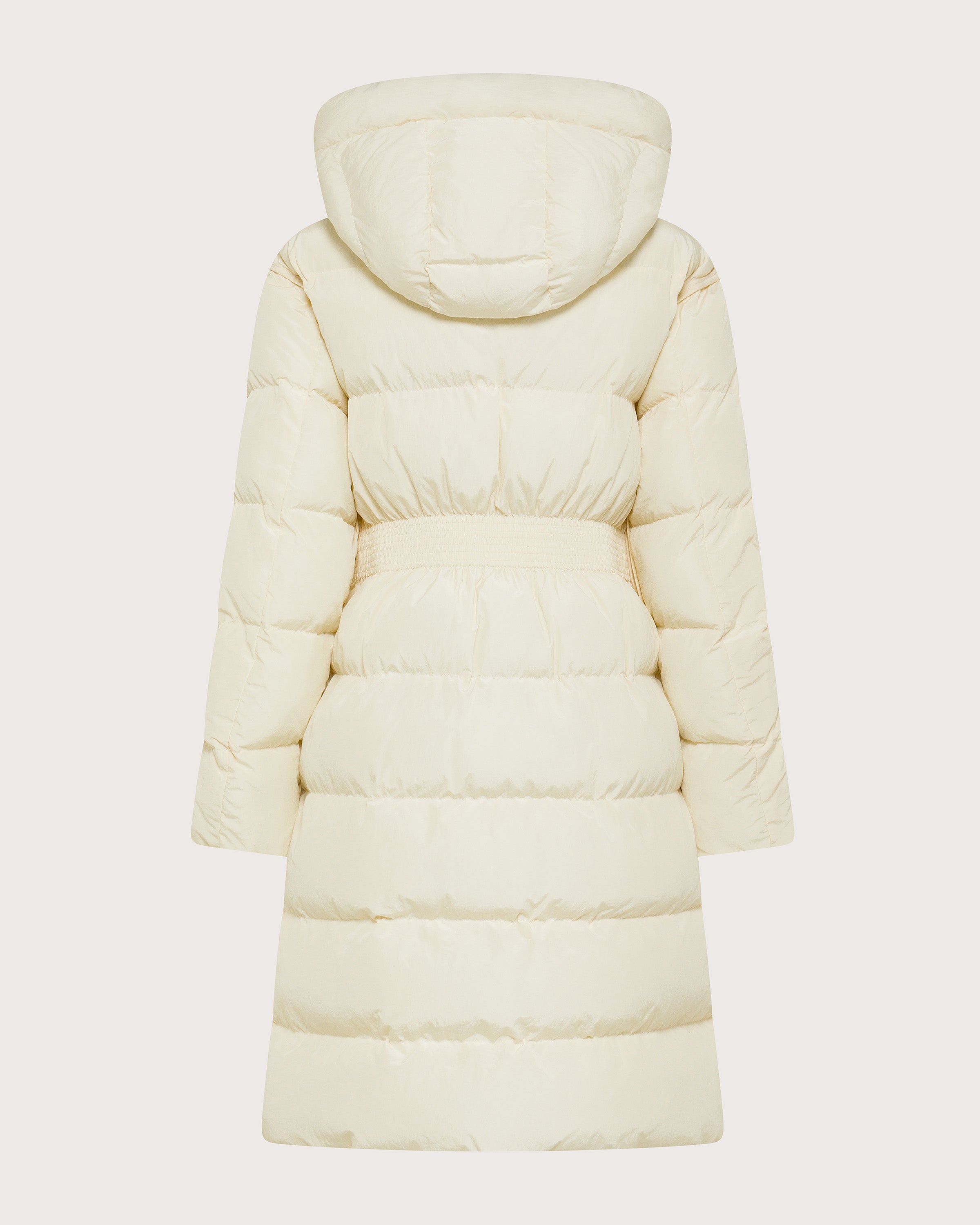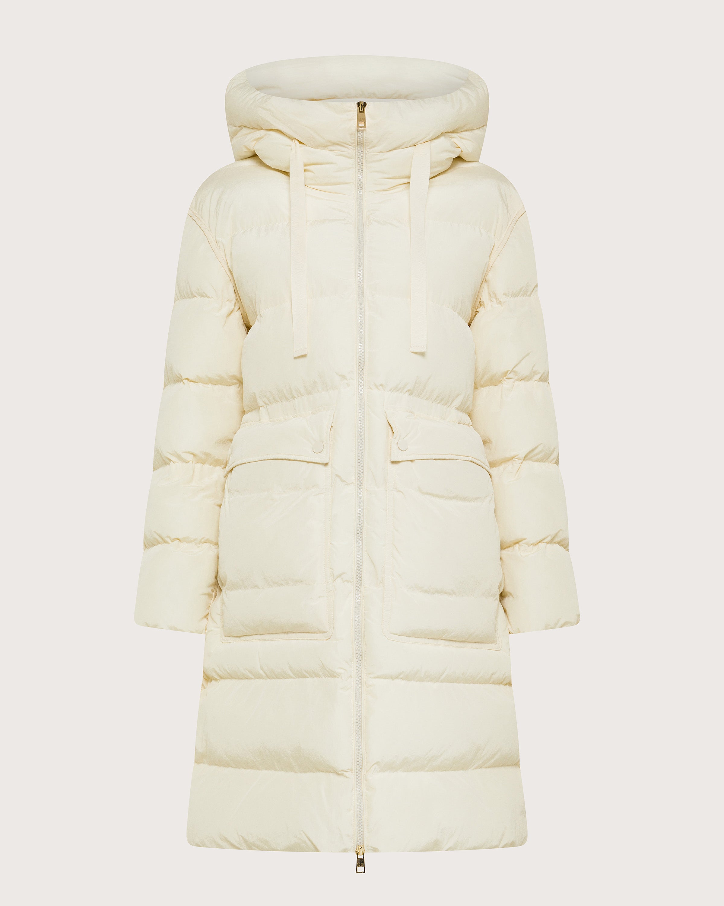 Piumino lungo con cappuccio realizzato in nylon smerigliato. Chiusura frontale con zip, tasche applicate a toppa con pattina e bottoni sul davanti. Motivo elasticato sul punto vita dietro.