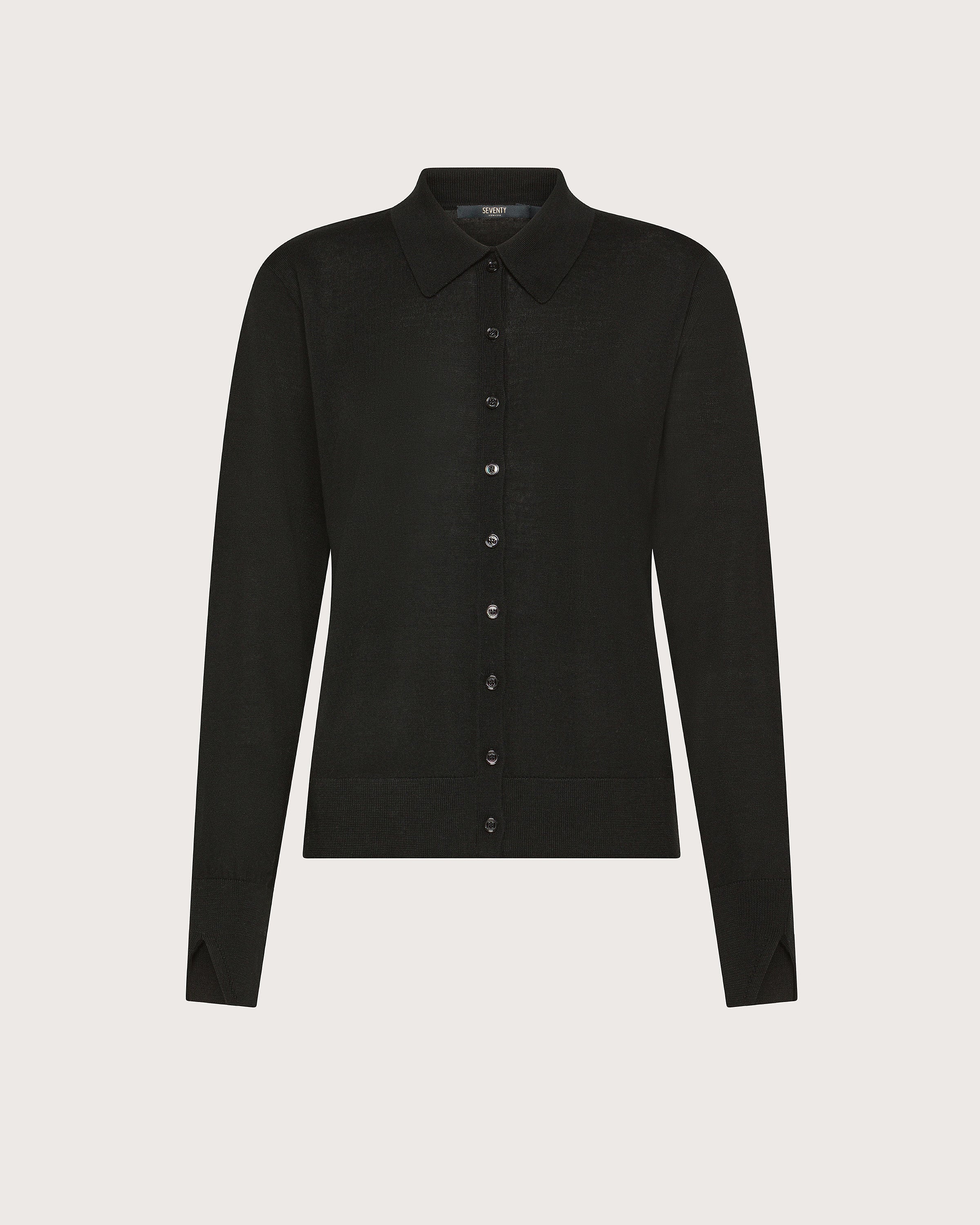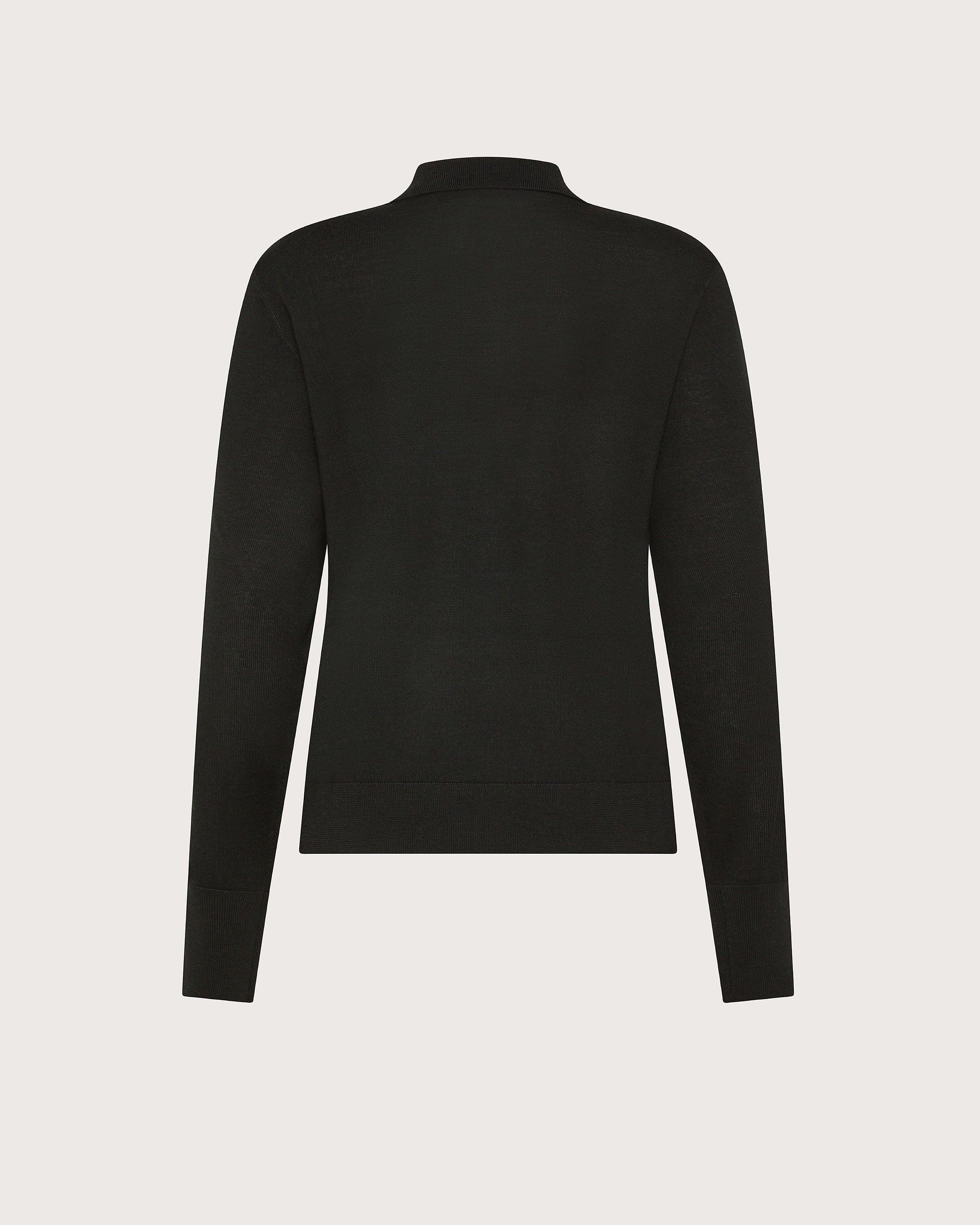 Polo realizzata in lana merinos a manica lunga. Chiusura frontale con bottoni.