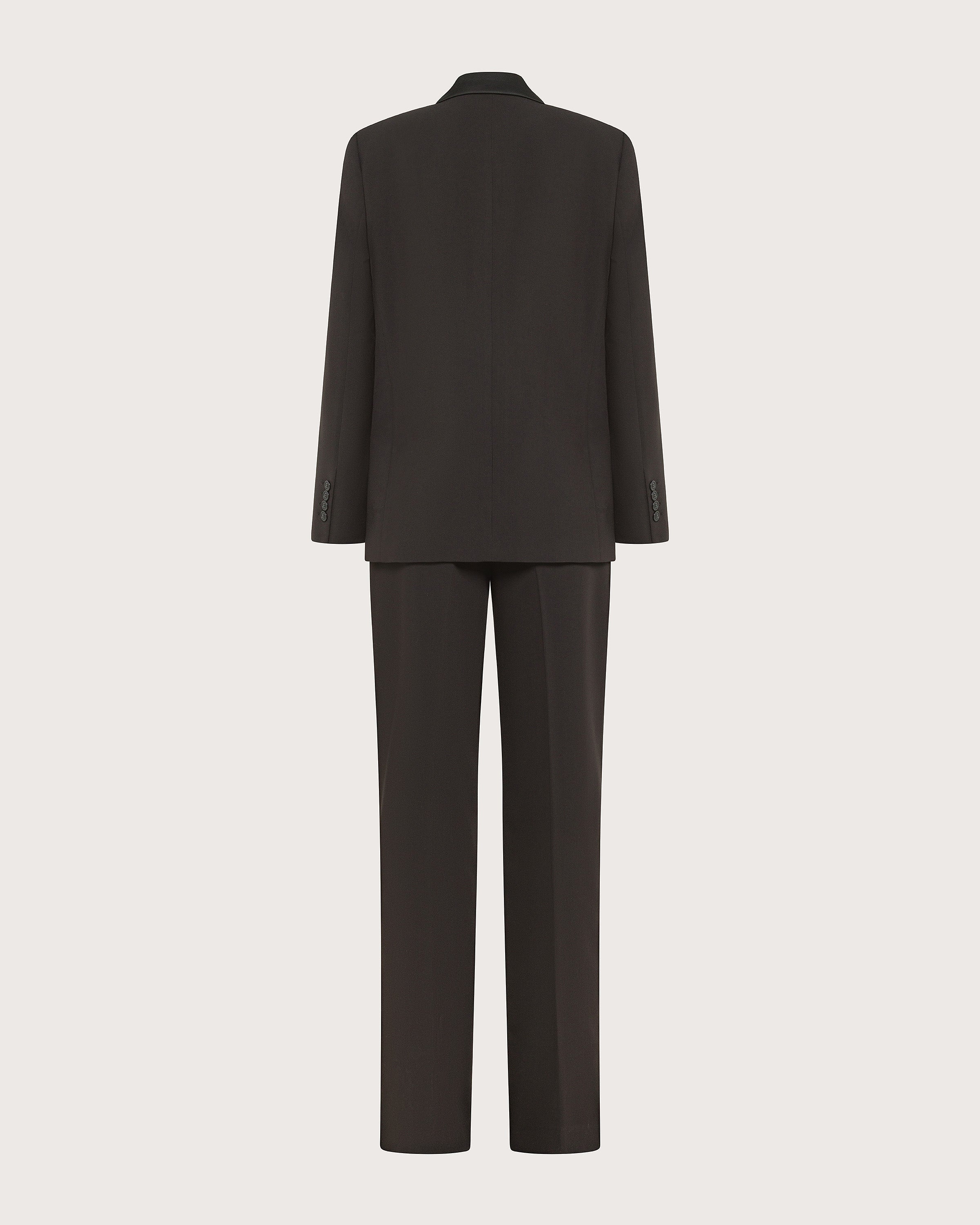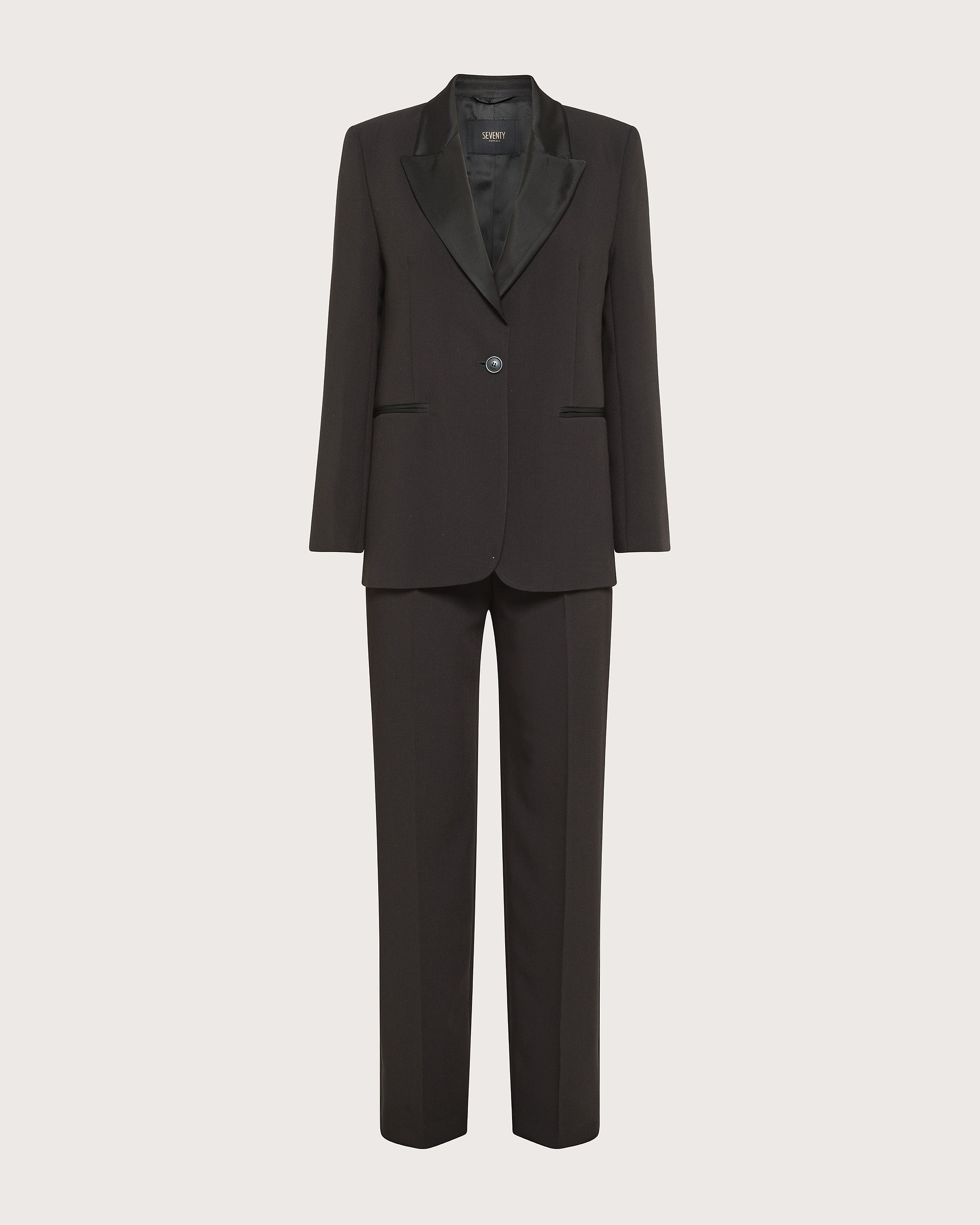 tailleur in doppio poly bistretch. Pantalone slim lungo con tasche oblique e chiusura con zip, bottone interno e gancetto metallico. Giacca monopetto un bottone. Rever a lancia in tessuto a contrasto. Tasche a filetto anteriori.