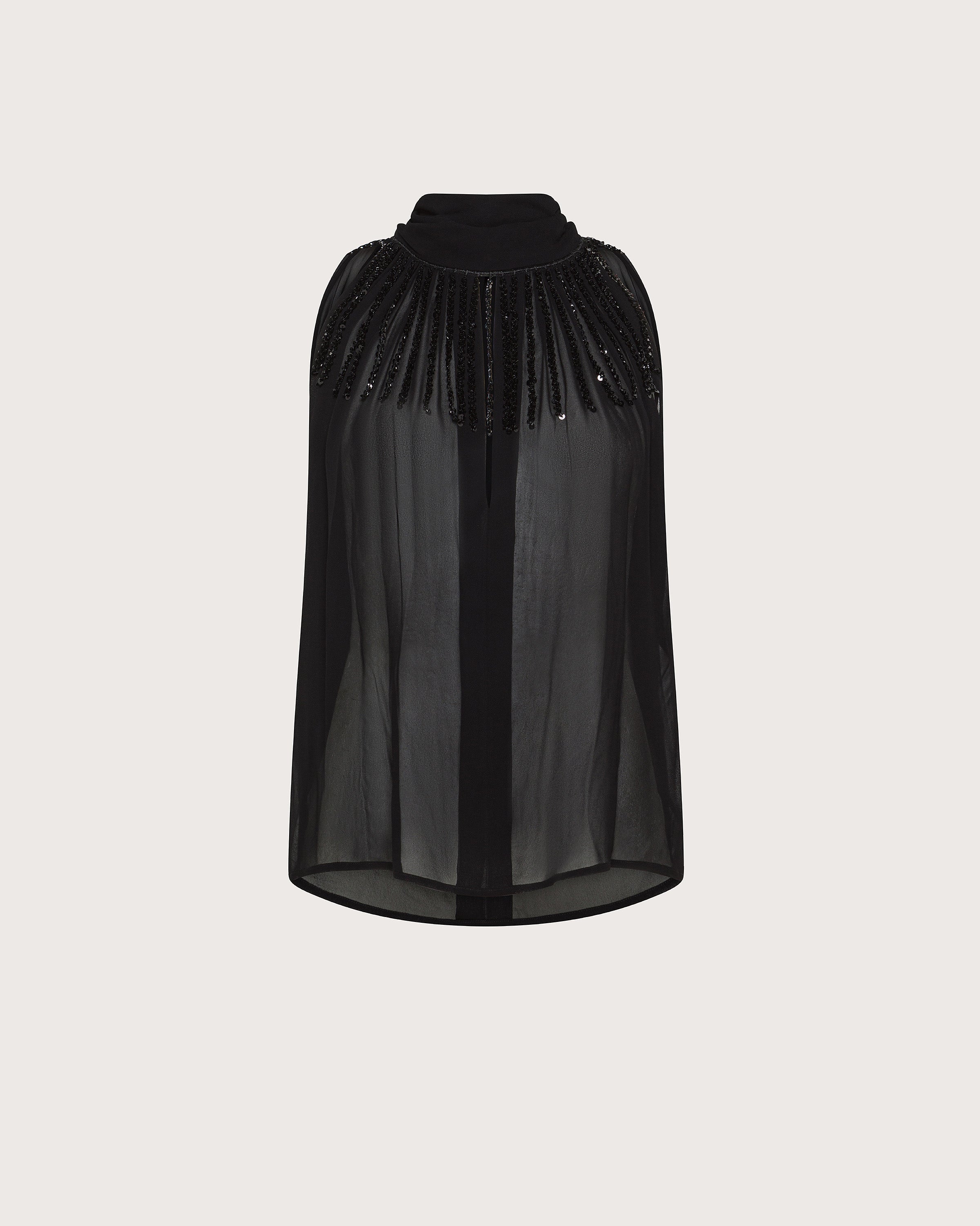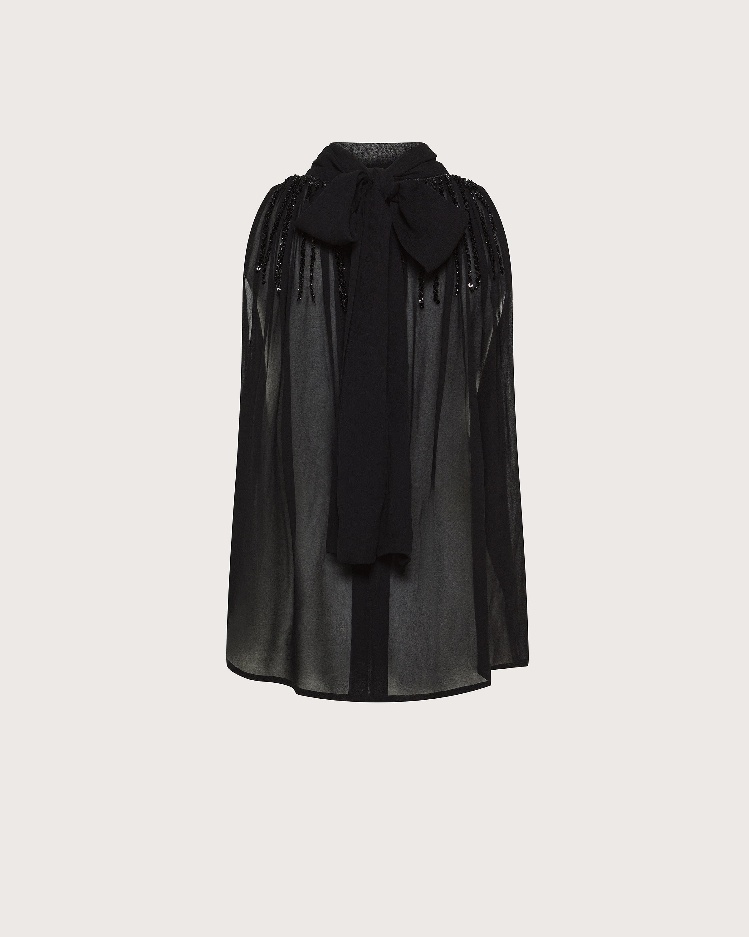 Top nero in georgette con scollatura prodonda sul retro, fiocco sul collo con dettaglio in pailletes.