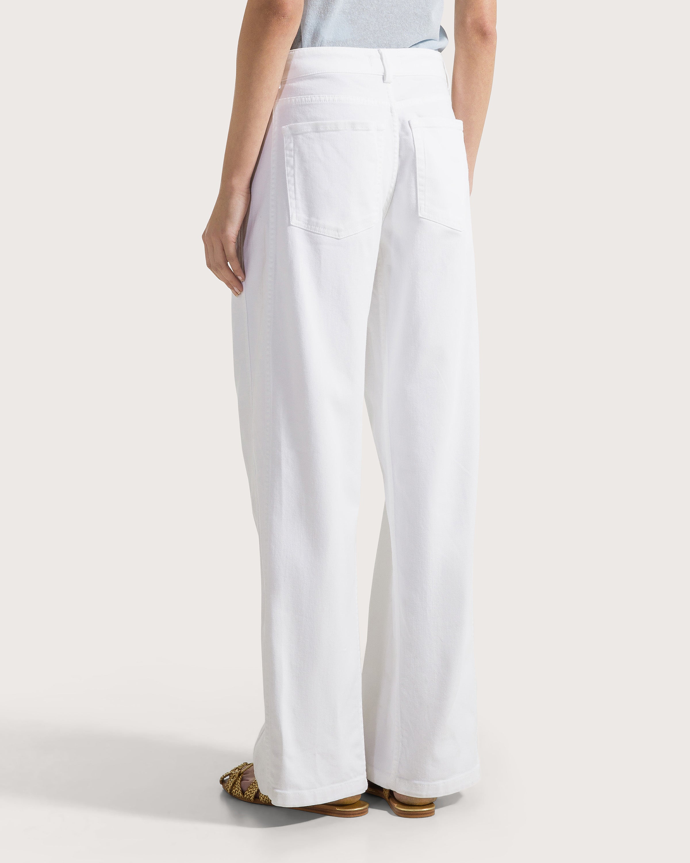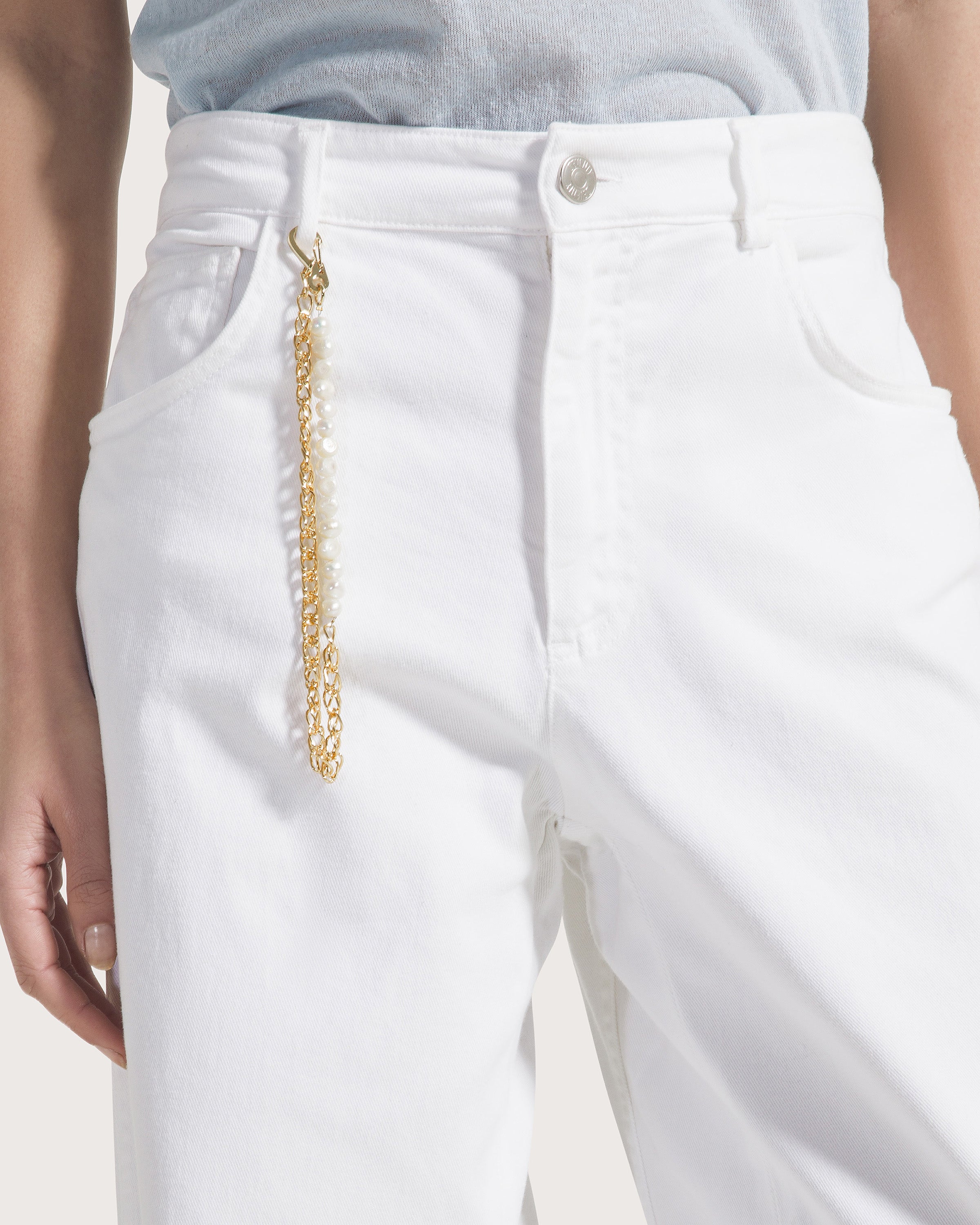 5-pocket denim pants in cotton bull with removable jewel accessory detail on the belt loop.