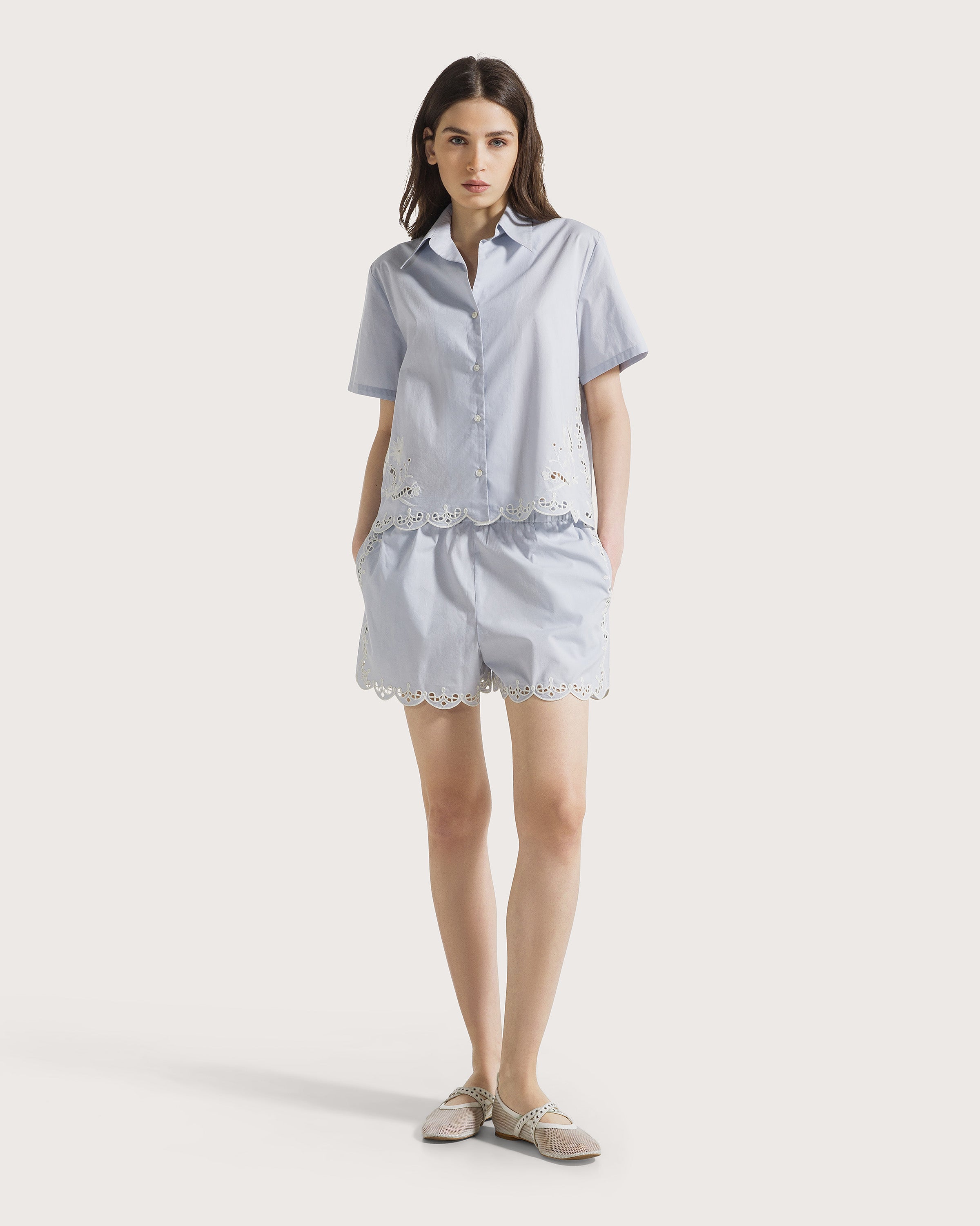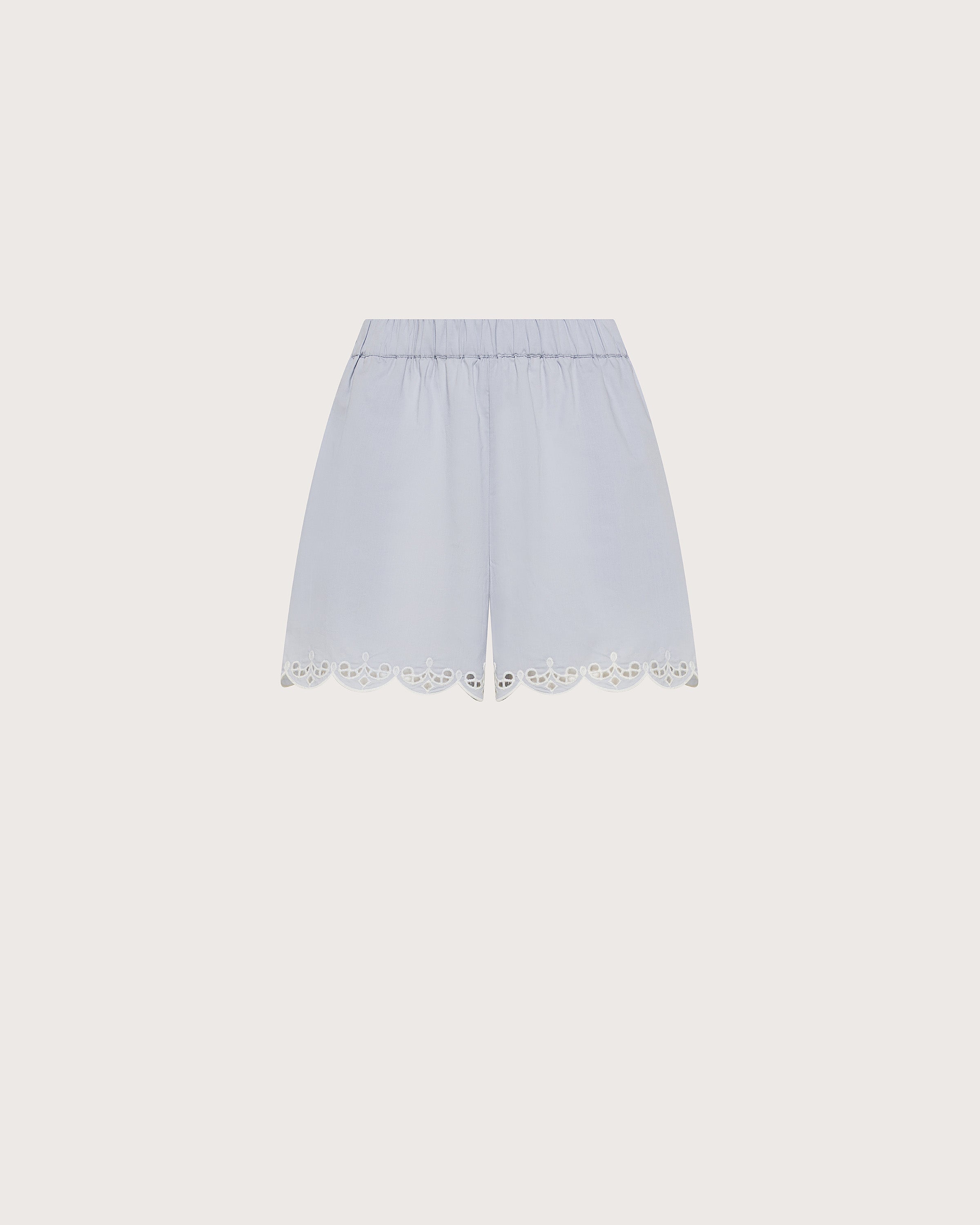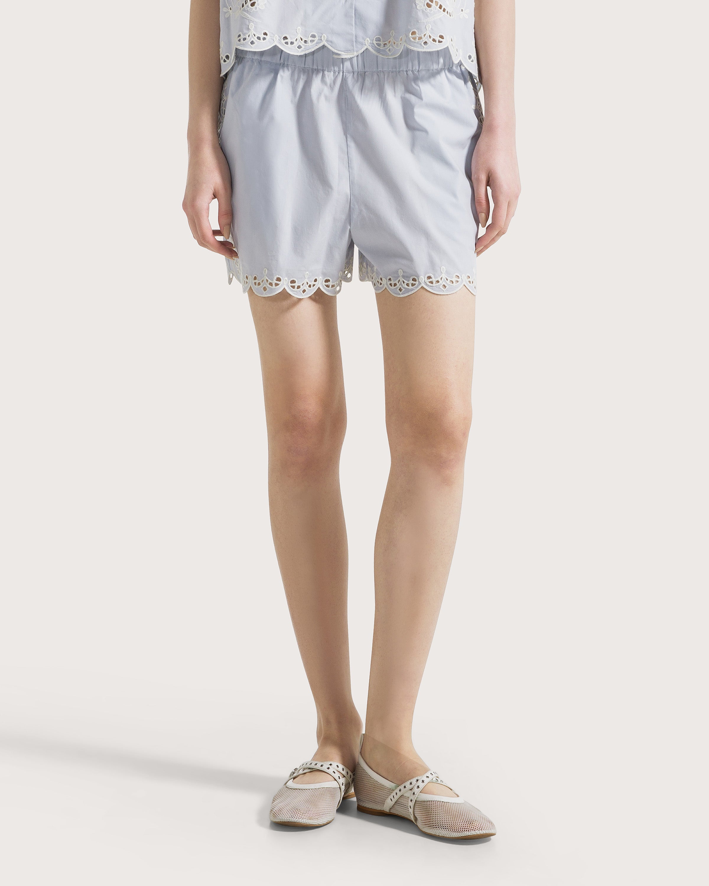 Short elasticato in vita in cotone popeline con dettaglio ricamo sangallo in contrasto colore.