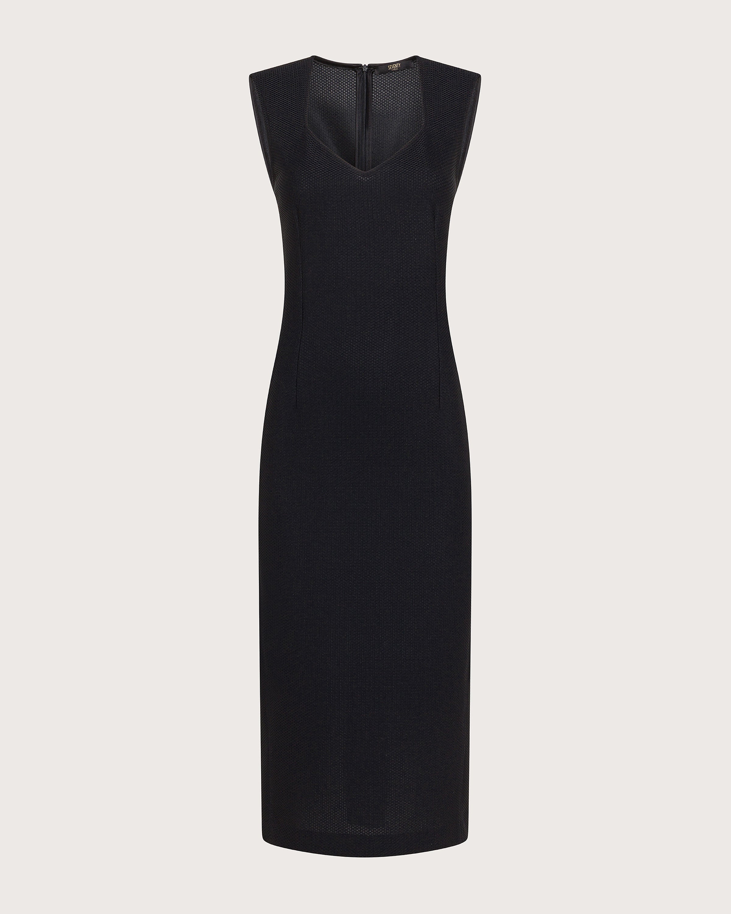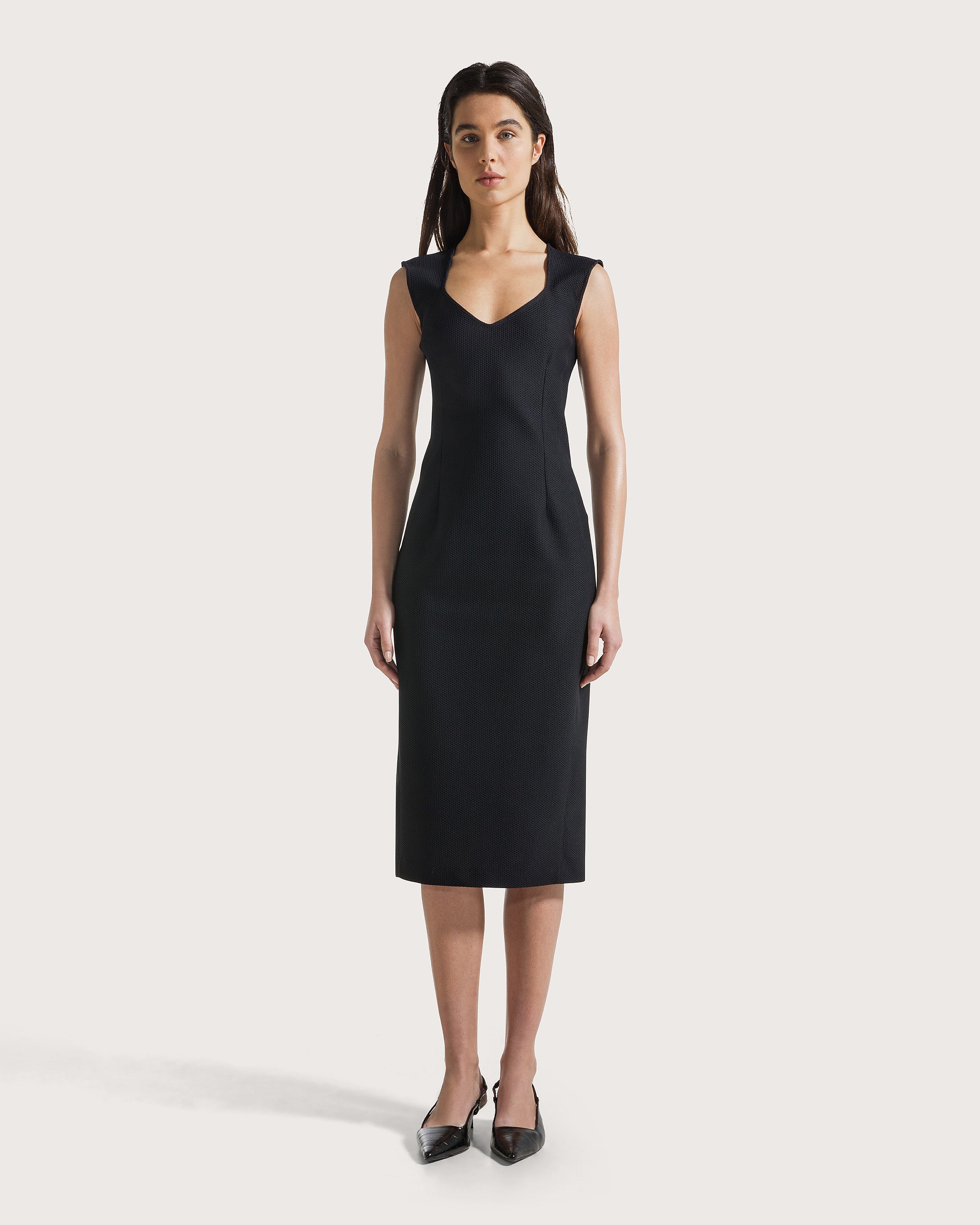Slim-fit sheath dress in technical bi-stretch honeycomb fabric with invisible zip fastening at the back.